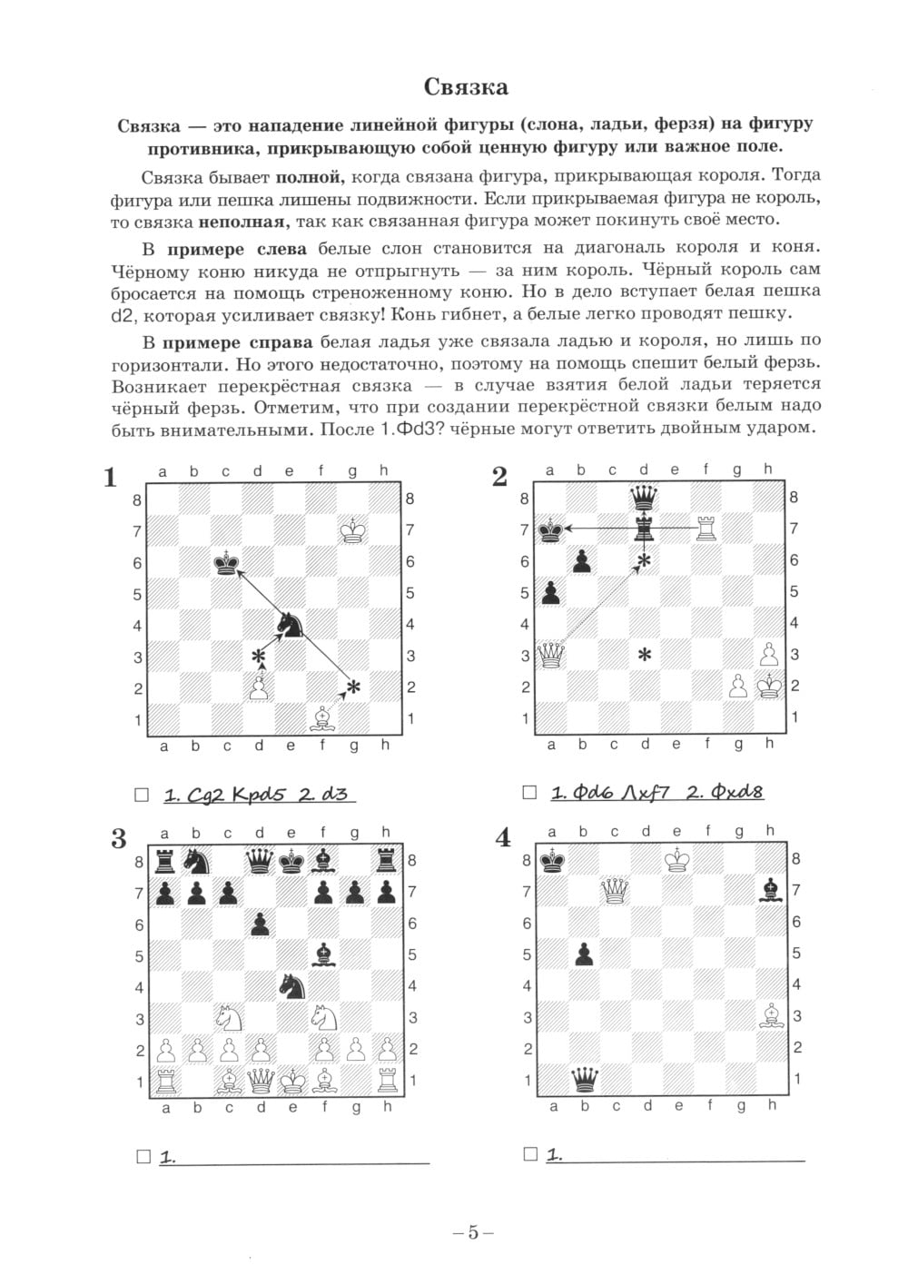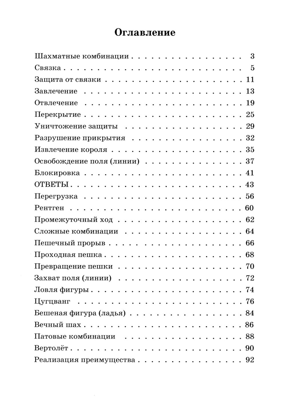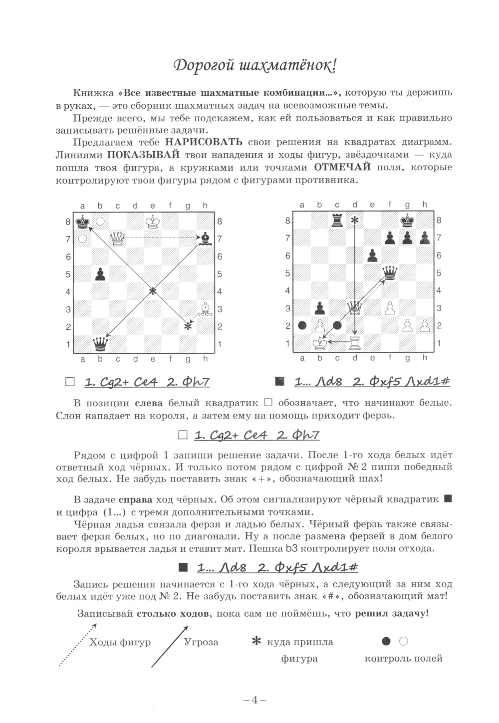 Вы держите в руках замечательную книжку, которая познакомит юного шахматенка со всеми известными шахматными комбинациями и приёмами. Прочитав наши уроки и прорешав все задачи, вы научитесь: • Связывать фигуры противника и Защищаться от Связки; • Завлекать и Отвлекать вражеское войско; • Отрезать главные силы неприятеля от места событий с помощью Перекрытия; • Разрушать самую неприступную крепость противника и Уничтожать её защитников; • Извлекать за шиворот вражеского короля из дома; • Блокировать короля в собственном лагере среди своих же фигур; • Освобождать и Захватывать поля и линии для более подходящих фигур атаки; • Перегружать непосильной работой игуры противника; • Просвечивать насквозь Рентгеном вражеское войско; • Ставить противника в трудное положение промежуточным ходом; • Ловить фигуру противника в Капкан; • Разбираться в самых Сложных комбинациях. Как работать с нашим решебником? Если ребёнок занимается дома для всестороннего развития, то внимательно читайте вступление к каждой новой теме. Если вы тренер и работаете с детьми в спортивной секции или в школе, то рекомендуем вам вместе со всей группой решить несколько задач из каждой новой темы на демонстрационной доске, а последующие позиции на диаграммах предложите юному шахматёнку решать самостоятельно на занятии или уже дома - как домашнее задание. Решения ваш потенциальный гроссмейстер должен записать под диаграммами.