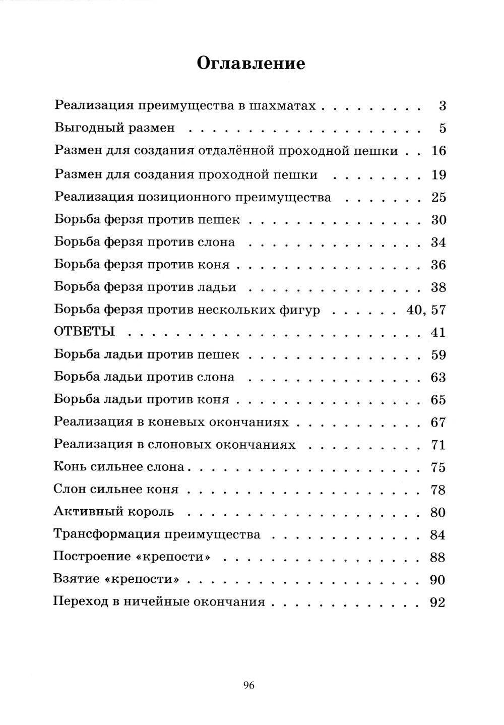 Книга «Реализация преимущества» - самая важная в этой серии книг «Шахматный задачник». Она поможет юным шахматистам разобраться, как реализовывать достигнутое преимущество, как не выпустить перевес из рук и добиться победы. В нашем решебнике мы сделали подборку с множеством примеров на самые разнообразные темы. Автор ставит своей целью научить тебя проводить Выгодные размены, Переходить в окончания с проходной пешкой, Реализовывать позиционное преимущество, Строить и Брать шахматные Крепости. Вместе мы разберём теоретические примеры шахматных окончаний, и ты узнаешь о свойствах каждой Шахматной фигуры, и как она борется против Других фигур и пешек. Не забудем о случаях, когда ты - слабейшая сторона... Ты узнаешь, как спастись и перейти в Ничейные окончания.| Издательство | Изд.Калиниченко |