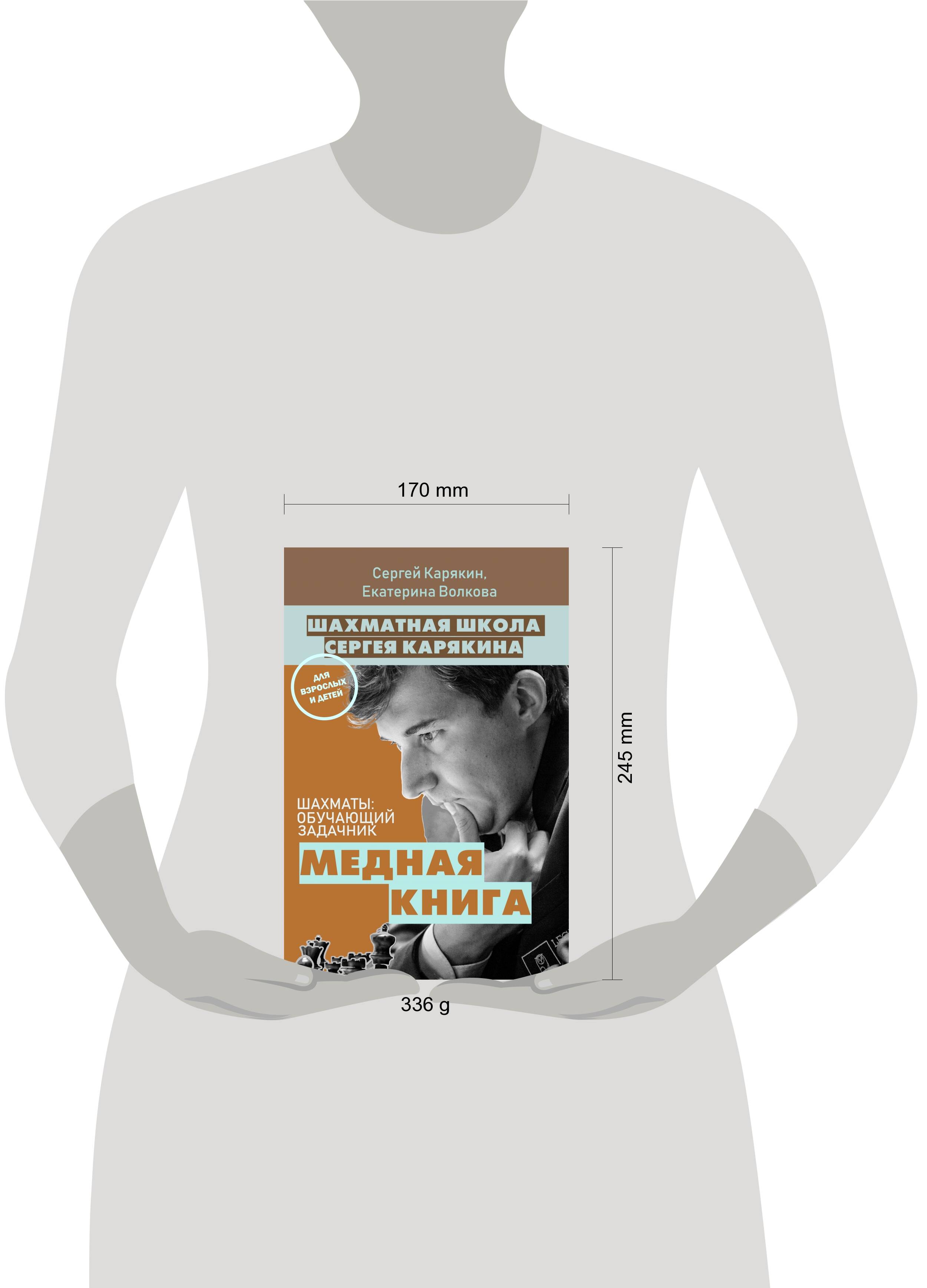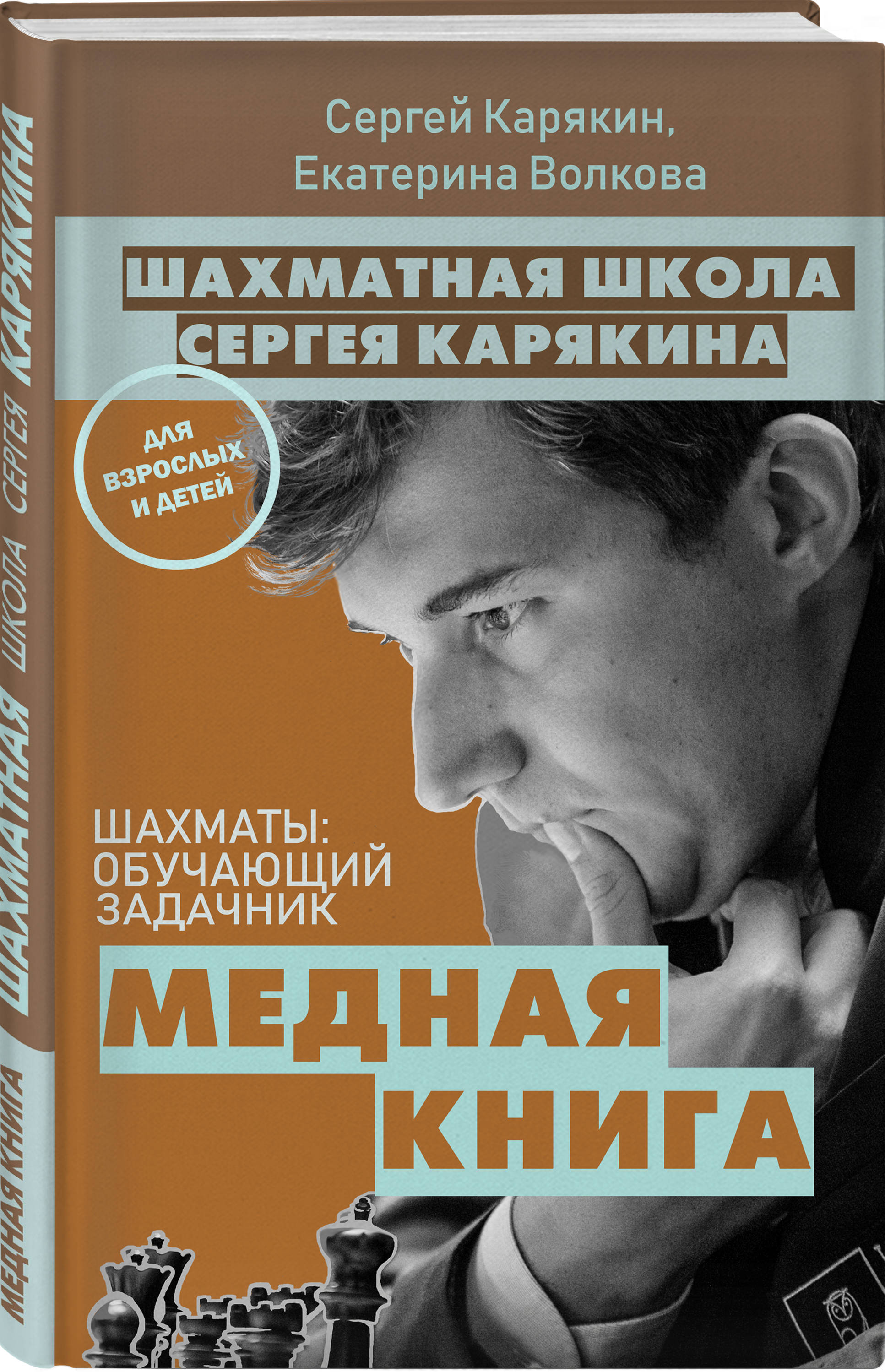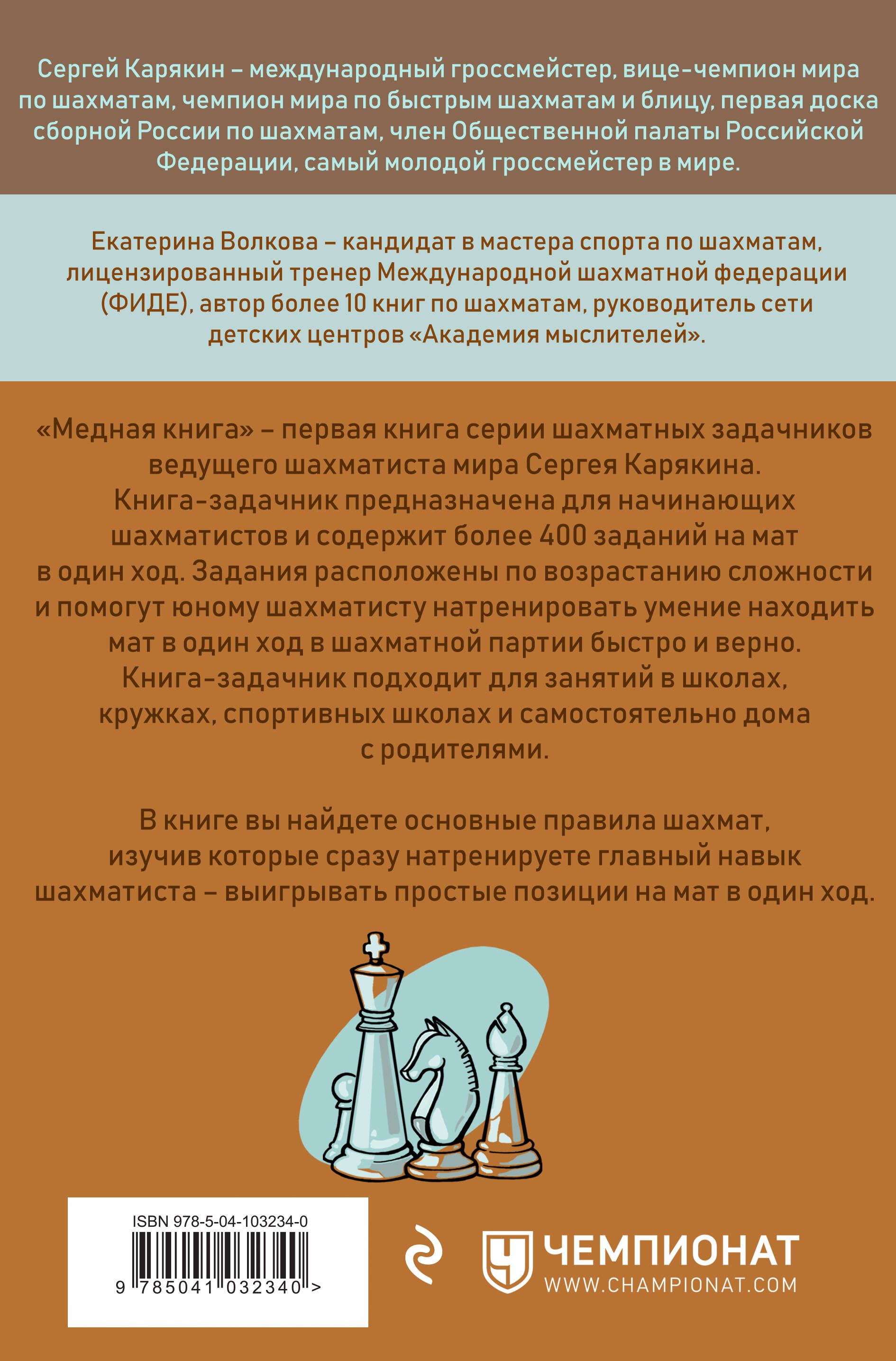 "Медная книга" - первая книга серии шахматных задачников ведущего шахматиста мира Сергея Карякина. Книга-задачник предназначена для начинающих шахматистов и содержит более 400 заданий на мат в один ход. Задания расположены по возрастанию сложности и помогут юному шахматисту натренировать умение находить мат в один в шахматной партии быстро и верно. Книга-задачник подходит для занятий в школах, кружках, спортивных школах и самостоятельно дома с родителями. В книге вы найдете основные правила шахмат, изучив которые сразу натренируете главный навык шахматиста - выигрывать простые позиции на мат в один ход.| Издательство | ООО "Издательство "Эксмо" |