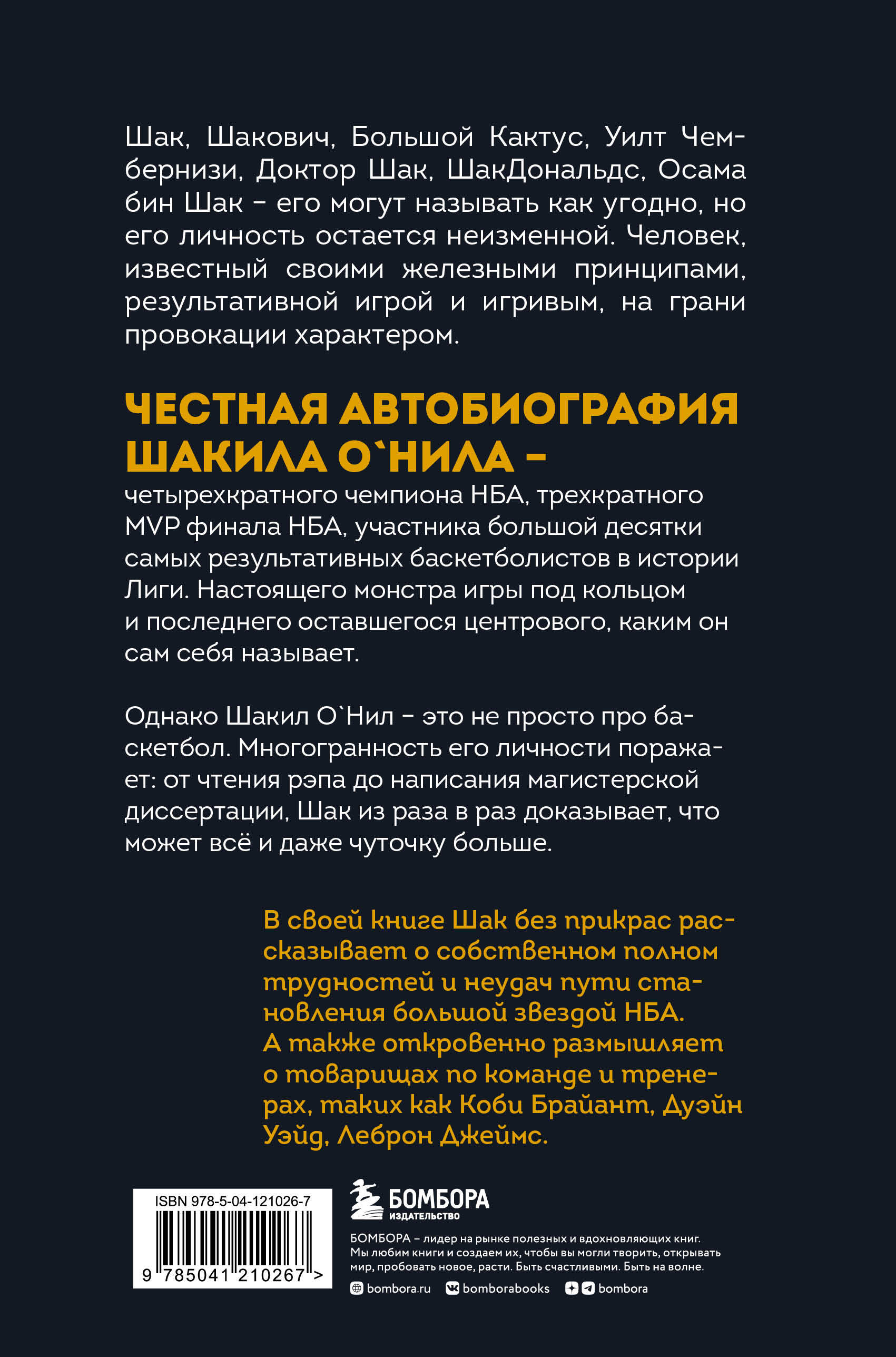 Шак, Шакович, Большой Кактус, Уилт Чембернизи, Доктор Шак, ШакДоналдс, Осама бин Шак - его могут называть как угодно, но его личность остается неизменной. Человек, известный своими железными принципами, результативной игрой и игривым, на грани провокации характером. Честная автобиография Шакила О`Нила - четырехкратного чемпиона НБА, трехкратного MVP финала НБА, участника большой десятки самых результативных баскетболистов в истории Лиги. Настоящего монстра игры под кольцом и последнего оставшегося центрового, каким он сам себя называет. Однако Шакил О`Нил - это не просто про баскетбол. Многогранность его личности поражает: от чтения рэпа до написания магистерской диссертации, Шак из раза в раз доказывает, что может всё и даже чуточку больше. В своей книге Шак без прикрас рассказывает о своем пути становления большой звездой НБА, который был полон трудностей и неудач. А также откровенно размышляет о товарищах по команде и тренерах, таких как Коби Брайант, Дуэйн Уэйд, Леброн Джеймс.| Издательство | ООО "Издательство "Эксмо" |