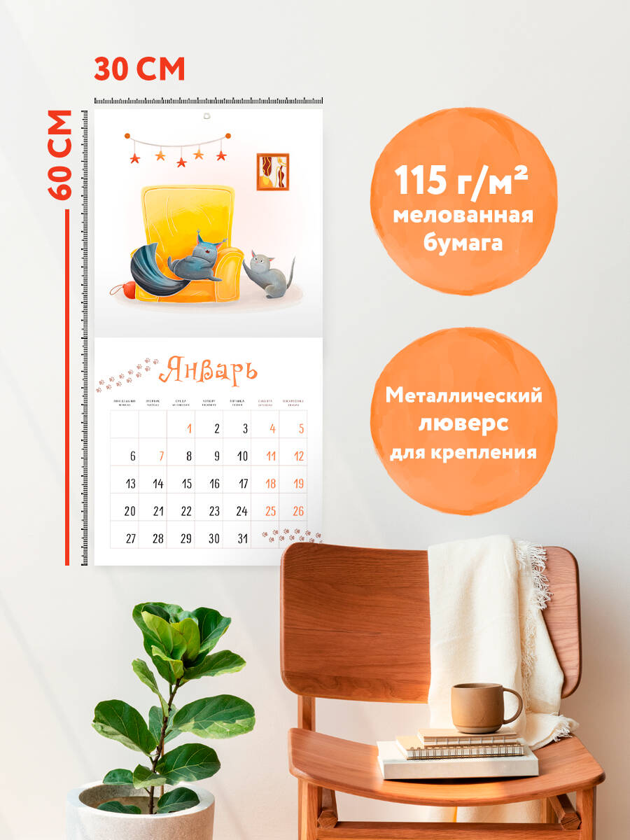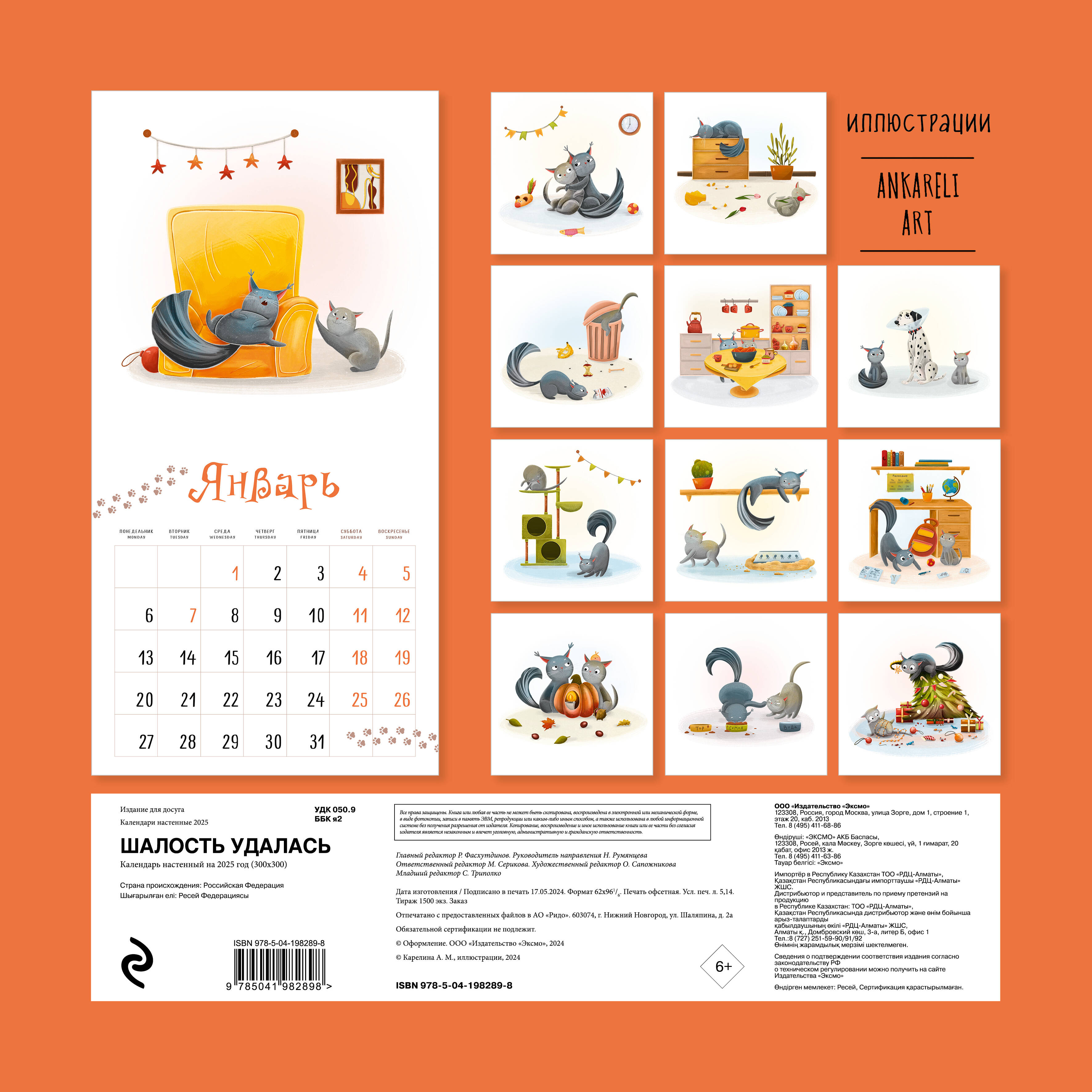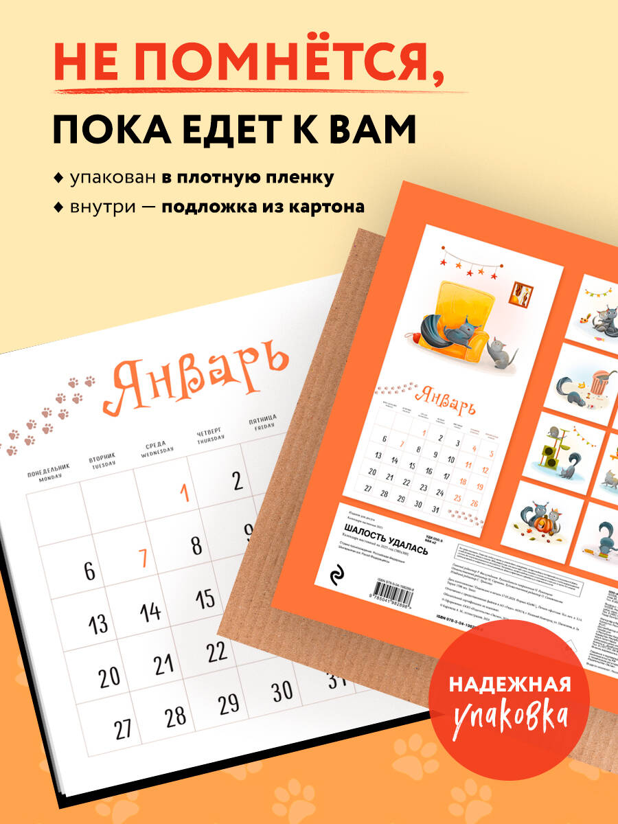 О серии: Наши настенные календари отличаются высоким качеством исполнения! Тщательно подобранные иллюстрации, напечатанные на глянцевой бумаге высочайшего качества, станут настоящим украшением дома, а в календарной сетке найдется место для ваших планов: большие клетки позволят делать записи и организовать свой год! В календаре также отмечены все государственные праздники. О календаре: Календарь с авторскими иллюстрациями от Анастасии Карелиной (@ankareli.art, 6 тыс. подписчиков) будет каждый месяц радовать вас зарисовками озорных котиков Семена и Тора, органично дополнит любой интерьер и поможет спланировать время. Для кого: Для всех поклонников забавных иллюстраций с котиками. Технические параметры: - Тип календаря - настенный перекидной - Год - 2025 - Календарная сетка - с разбивкой по месяцам - Вид скрепления - скрепка - Ширина - 30 см - Высота - 30 см - Внутренний блок - мелованная бумага 115 г/м2 - Подложка - плотный гофрокартон для поддержания формы - Индивидуальная упаковка в плотный целлофановый пакет| Издательство | ООО "Издательство "Эксмо" |