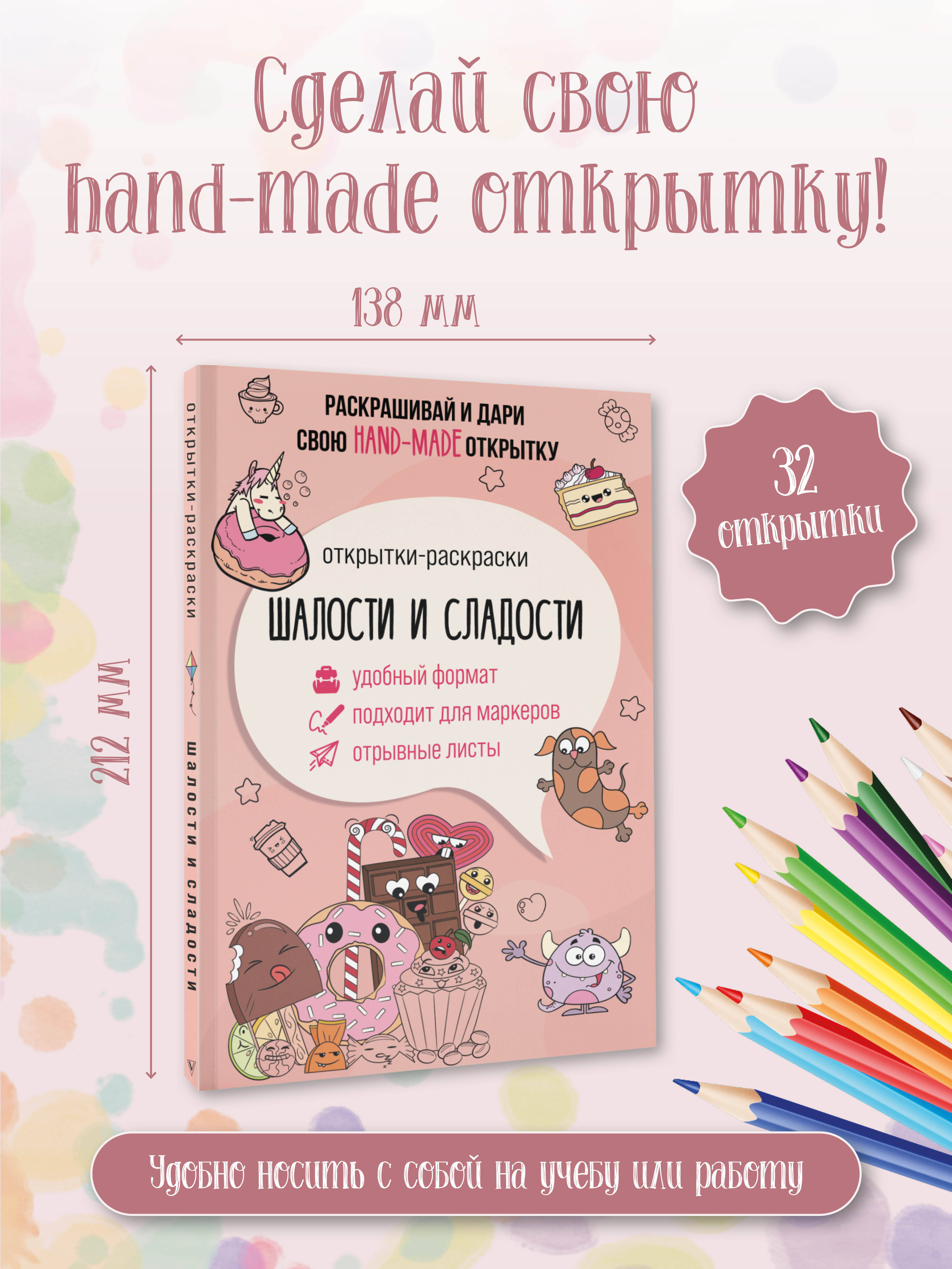 Все любят сладости! А как их не любить? Ведь кексик - лучший подарок. Раскраска «Шалости и сладости» - это набор ярких, вкусных открыток. Берите в руки карандаши или фломастеры и раскрашивайте иллюстрации на удобных отрывных листах. А затем просто вручите hand-made открытку близкому человеку. Подарите другу кексик!| Издательство | ИЗДАТЕЛЬСТВО "АСТ" |