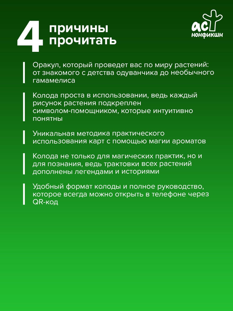 Эта колода - попытка взглянуть на окружающий нас мир растений глазами шаманов - носителей древних традиций. Здесь привычные цветы и травы раскрываются с иной стороны: гвоздика, которая ассоциируется с грустным прощанием, становится символом кропотливого труда и надежды, приправа для супа - лавр - символизирует сияющую победу, а волшебный папоротник, хоть и не цветет, но также олицетворяет чудо, которое живет внутри каждого из нас. Каждая карта связана с растением и его духом, к которому обычно обращаются шаманы во время ритуалов. С этим оракулом вы можете гадать любым удобным вам способом или провести ритуал, добавив магию ароматов - для всех карт оракула указан свой магический запах, который поможет раскрыть сознание, заглянуть внутрь себя, получить ответ или помощь. В колоде 48 карт с изображением шаманских растений (трав и цветов) и две дополнительные карты с раскладами. По QR-коду, который есть внутри колоды, вы получите доступ к полному описанию карт, легендам о растениях и лучшим раскладам. Колода также выпускается под названием "Зеленый оракул ведьмы. Тайная сила природной магии".| Издательство | Издательство "АСТ" |