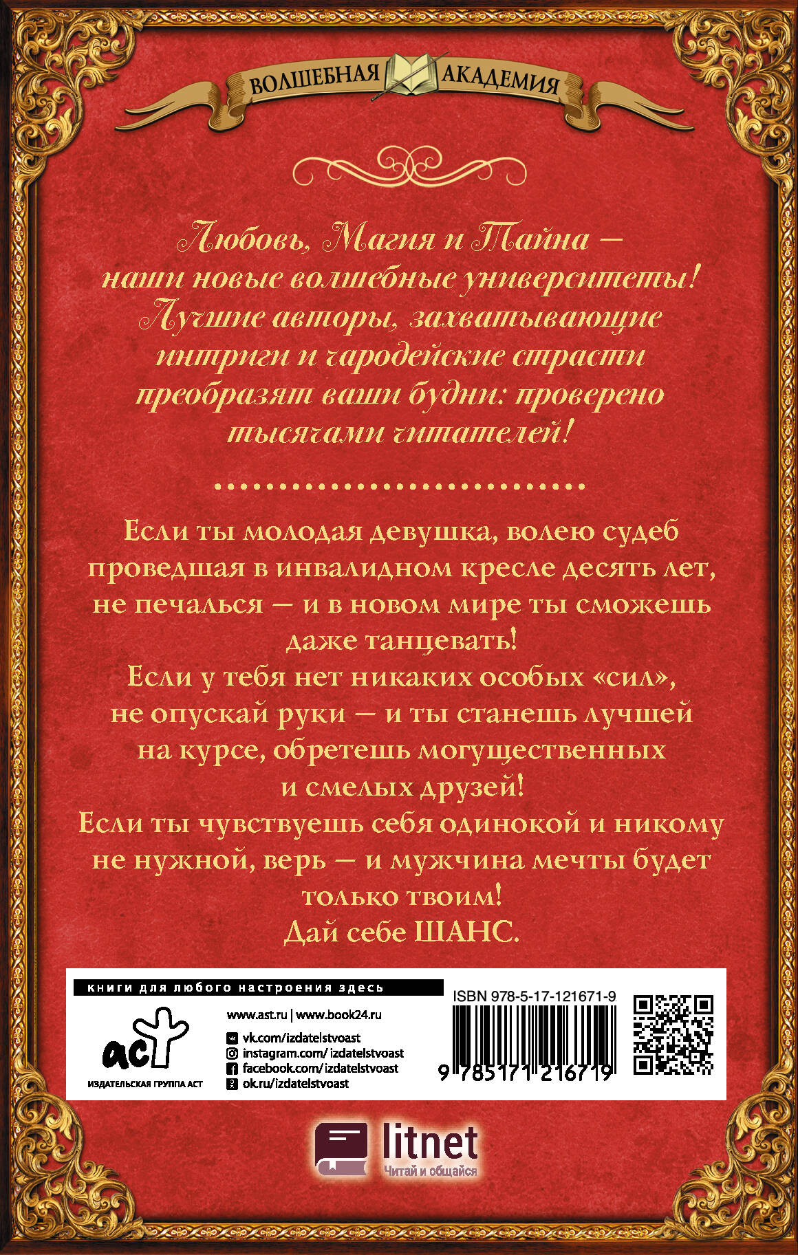 Если ты молодая девушка, волею судеб проведшая в инвалидном кресле десять лет, не печалься - и в новом мире ты сможешь даже танцевать! Если у тебя нет никаких особых "сил", не опускай руки - и ты станешь лучшей на курсе, обретешь могущественных и смелых друзей! Если ты чувствуешь себя одинокой и никому не нужной, верь - и мужчина мечты будет только твоим! Дай себе ШАНС.| Издательство | ИЗДАТЕЛЬСТВО "АСТ" |