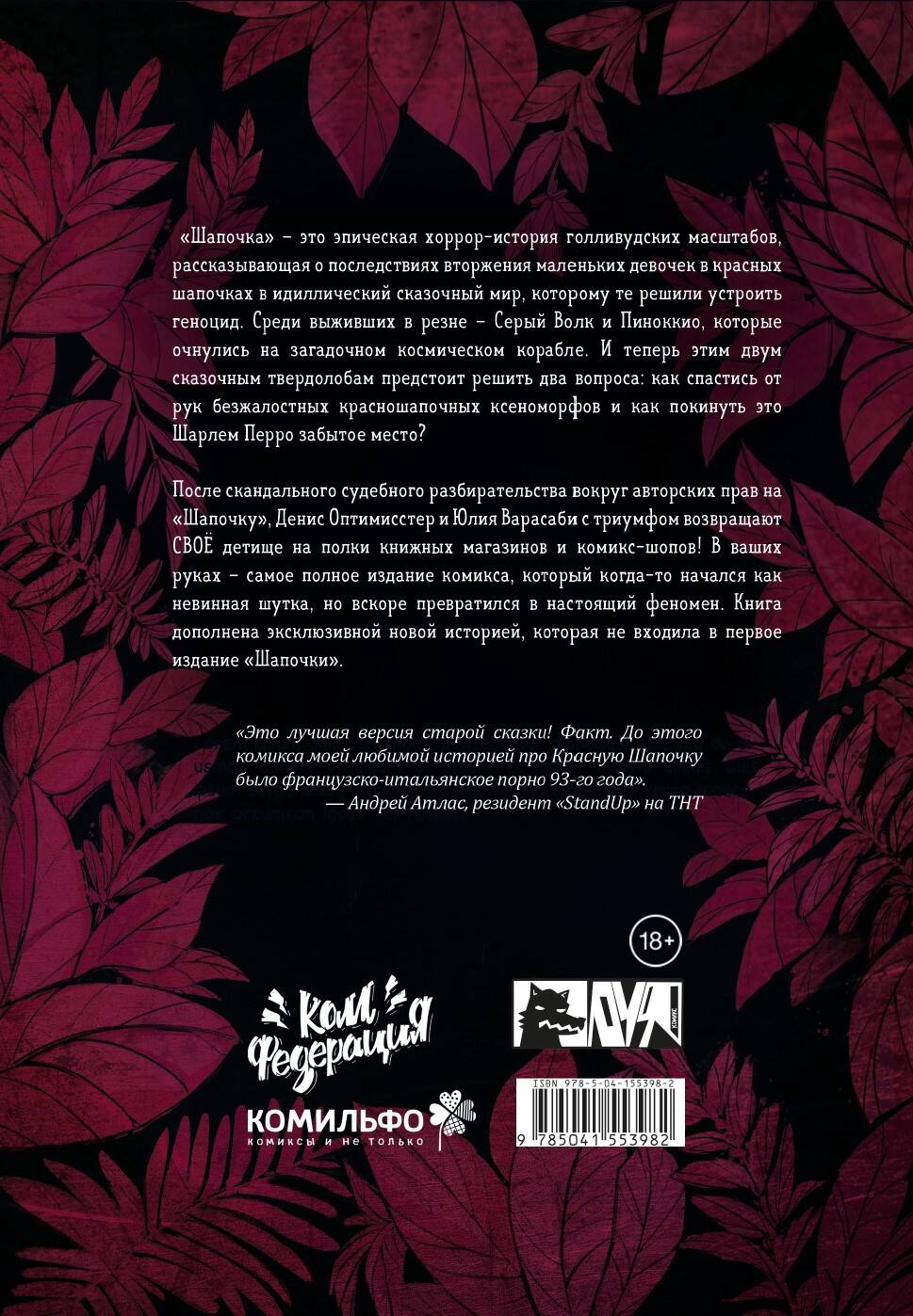 ТАКИХ ПРИКЛЮЧЕНИЙ ШАПОЧКИ ВЫ ЕЩЁ НЕ ВИДЕЛИ! Знакомые с детства герои - Красная Шапочка, Серый Волк и Пиноккио - раскроются с новой, неожиданной стороны в этом комиксе, пропущенном через призму культовых голливудских блокбастеров. Популярный блогер и сценарист комиксов ДЕНИС ОПТИМИССТЕР совместно с художницей ЮЛЕЙ ВАРАСАБИ приготовили для вас незабываемую историю, где всё кажется таким знакомым и одновременно таким удивительным! «Шапочка» - это эпическая хоррор-история голливудских масштабов, рассказывающая о последствиях вторжения маленьких девочек в красных шапочках в идиллический сказочный мир, которому те решили устроить геноцид. Среди выживших в резне - Серый Волк и Пиноккио, которые очнулись на загадочном космическом корабле. И теперь этим двум сказочным твердолобам предстоит решить два вопроса: как спастись от рук безжалостных красношапочных ксеноморфов и как покинуть это Шарлем Перро забытое место? После скандального судебного разбирательства вокруг авторских прав на «Шапочку», Денис Оптимисстер и Юлия Варасаби с триумфом возвращают СВОЁ детище на полки книжных магазинов и комикс-шопов! В ваших руках - самое полное издание комикса, который когда-то начался как невинная шутка, но вскоре превратился в настоящий феномен. Книга дополнена эксклюзивной новой историей, которая не входила в первое издание «Шапочки».