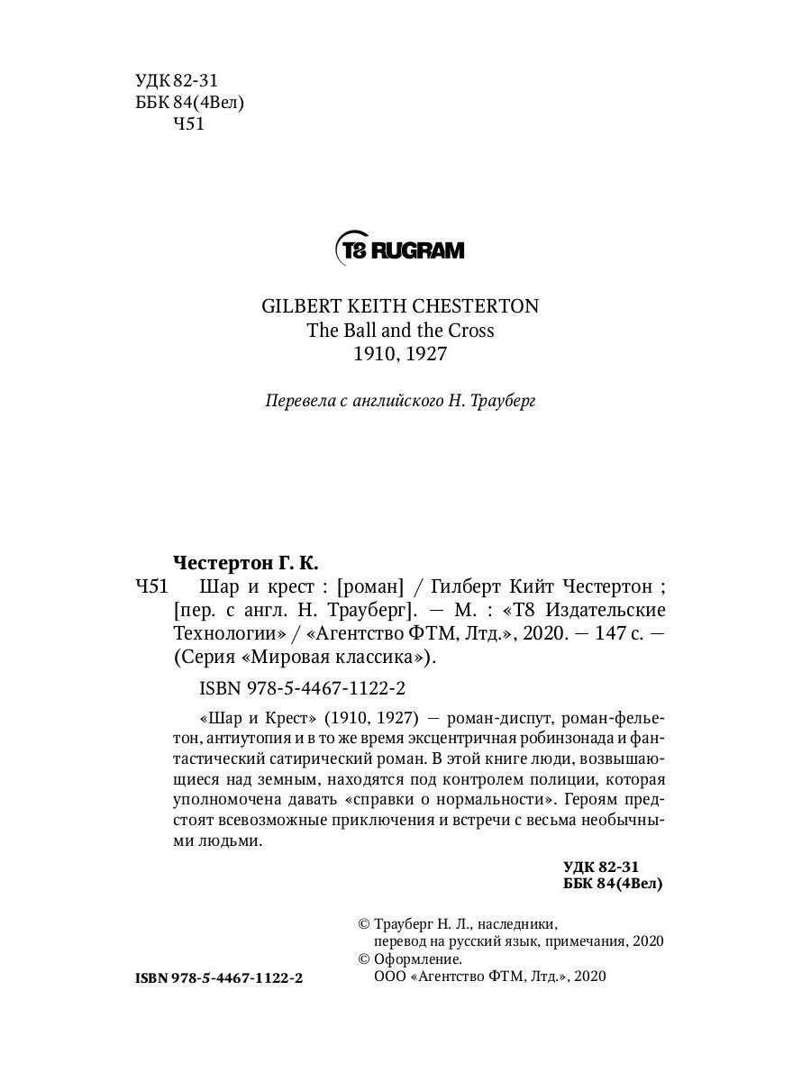 «Шар и Крест» (1910, 1927) - роман-диспут, роман-фельетон, антиутопия и в то же время эксцентричная робинзонада и фантастический сатирический роман. В этой книге люди, возвышающиеся над земным, находятся под контролем полиции, которая уполномочена давать «справки о нормальности». Героям предстоят всевозможные приключения и встречи с весьма необычными людьми.| Издательство | Т8 RUGRAM |