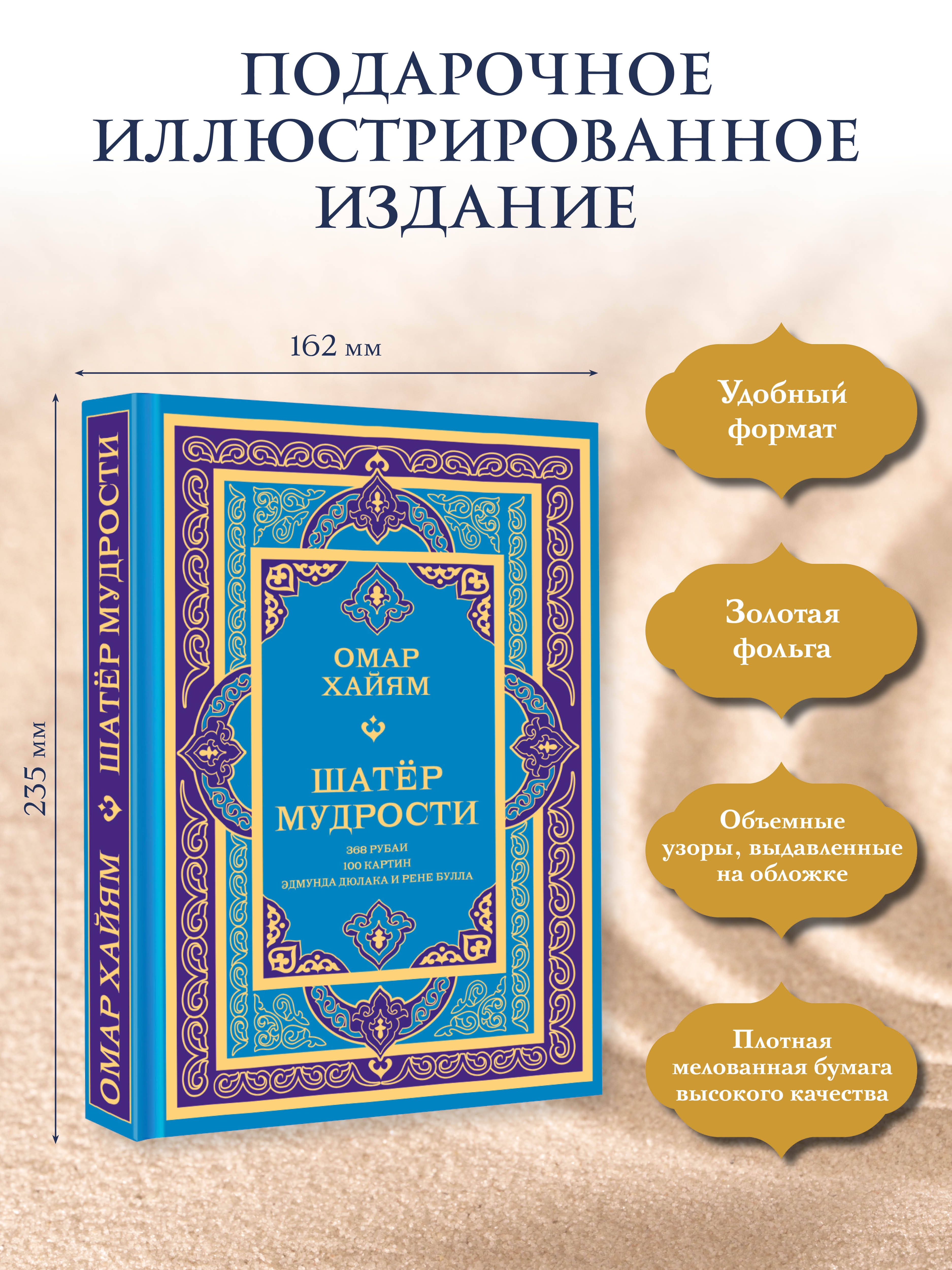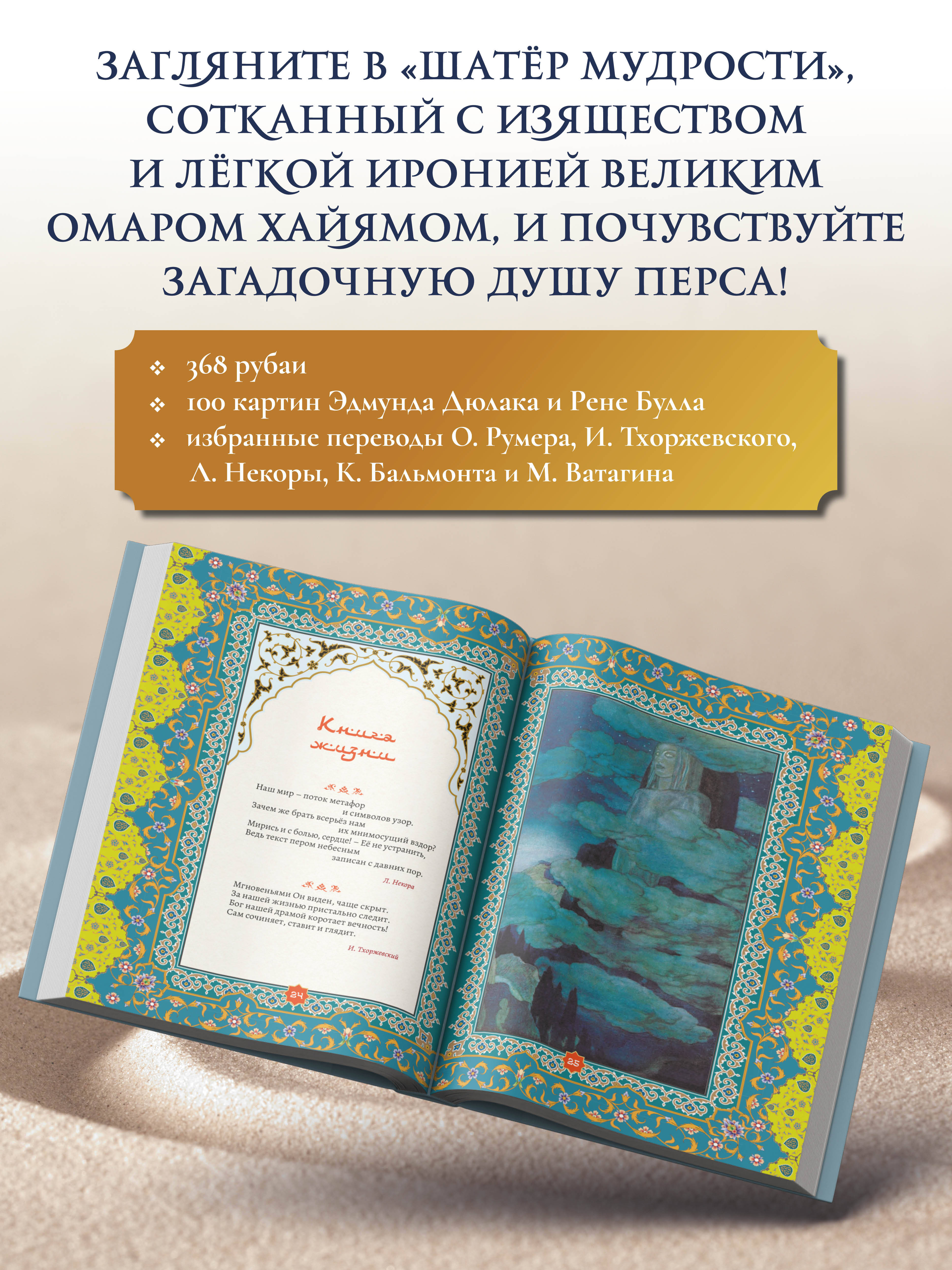 Лаконичные рубаи Омара Хайяма на протяжении уже почти тысячелетия остаются драгоценными жемчужинами мудрости и продолжают покорять сердца читателей по всему миру. В данном полноцветном издании представлена коллекция избранных четверостиший персидского поэта в переводах О. Румера, И. Тхоржевского, Л. Некоры, К. Бальмонта и М. Ватагина, которые гармонично дополнены картинами известных британских художников - Эдмунда Дюлака (1882-1953) и Рене Булла (1872-1942), благодаря чему читатель совершит увлекательное путешествие в загадочную душу перса, заглянет в гончарную мастерскую и за занавеску бытия, откроет Книгу Жизни и побеседует с Творцом, продегустирует запретное вино и познакомится с неверной красавицей, почувствует дыхание весны и зажжёт костёр любви в своём сердце.| Издательство | Издательство "АСТ" |