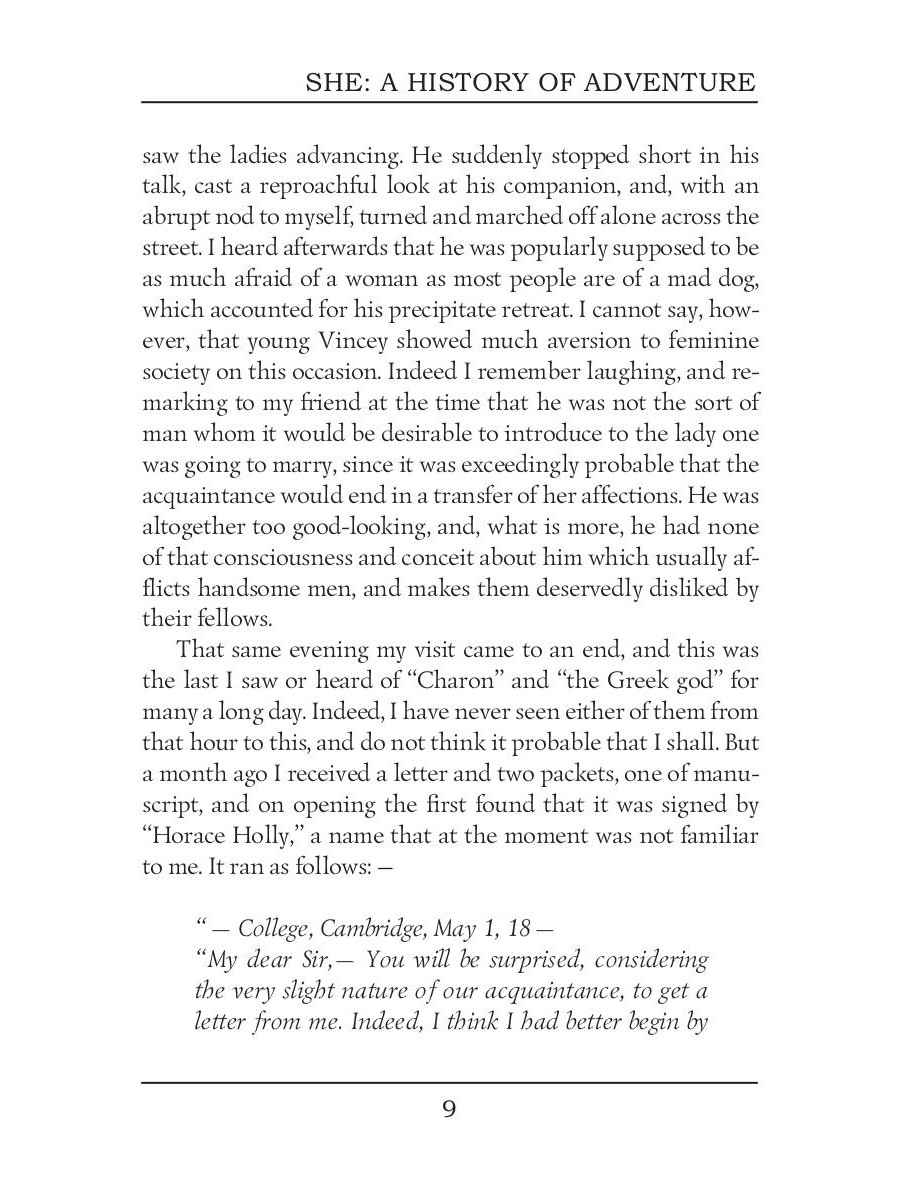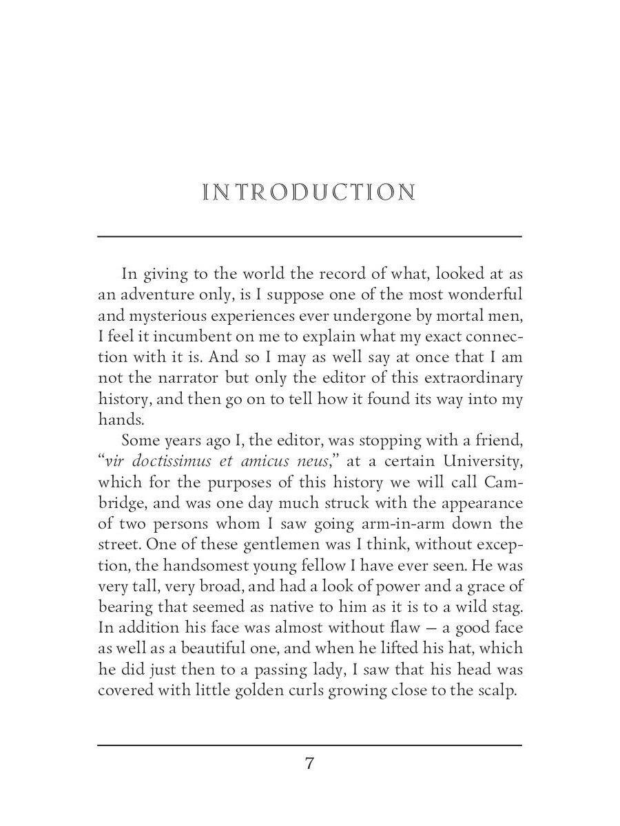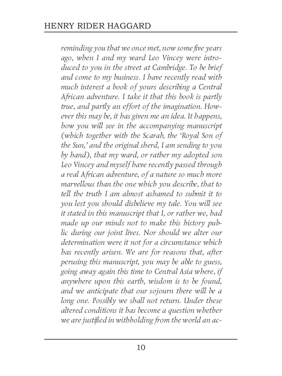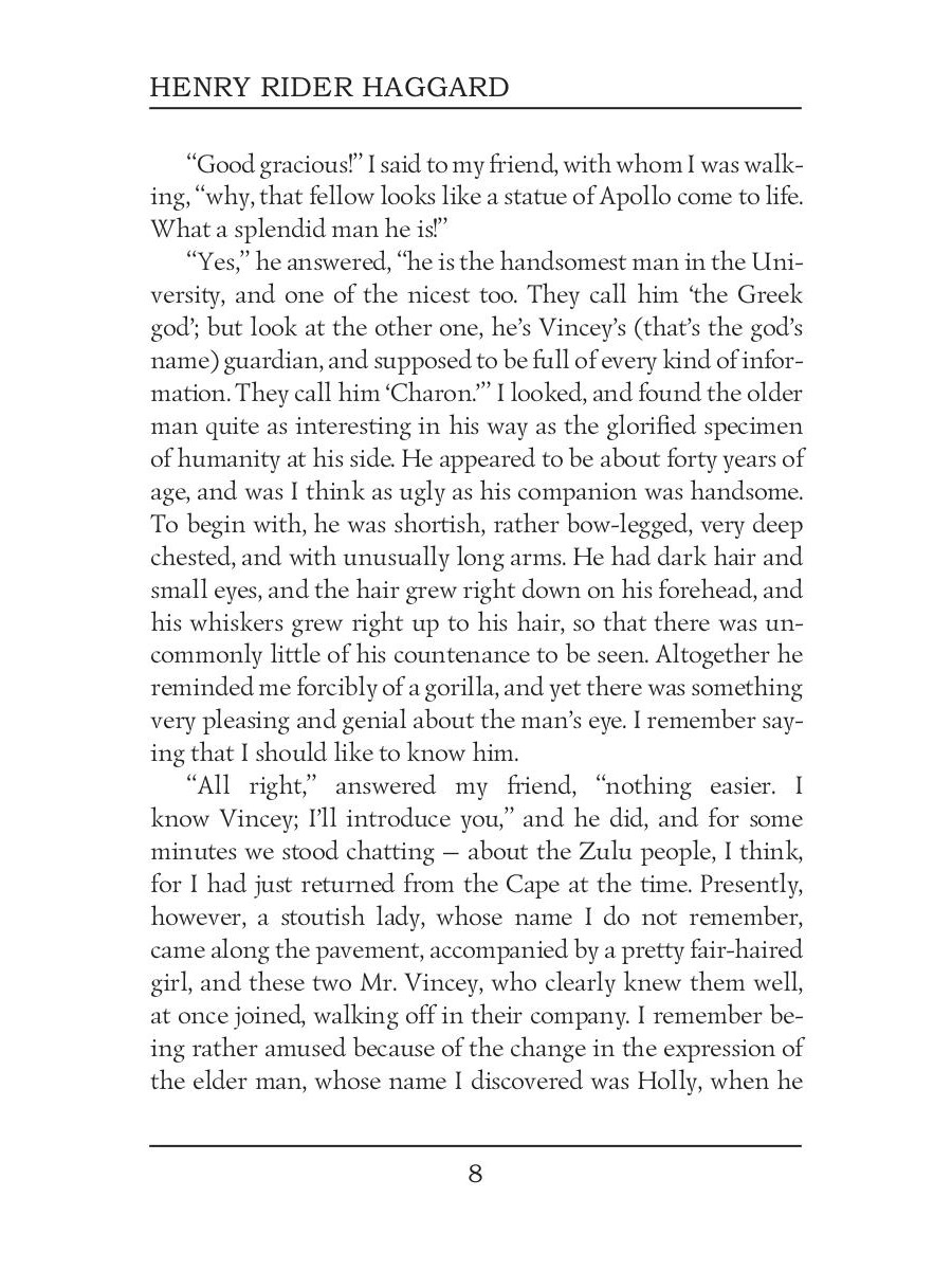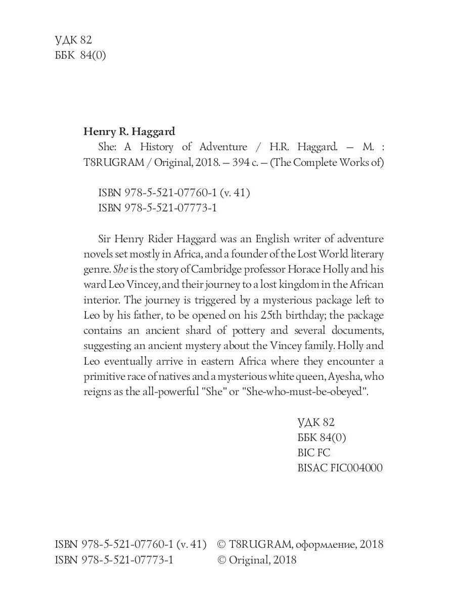 Sir Henry Rider Haggard was an English writer of adventure novels set mostly in Africa, and a founder of the Lost World literary genre. She is the story of Cambridge professor Horace Holly and his ward Leo Vincey, and their journey to a lost kingdom in the African interior. The journey is triggered by a mysterious package left to Leo by his father, to be opened on his 25th birthday; the package contains an ancient shard of pottery and several documents, suggesting an ancient mystery about the Vincey family. Holly and Leo eventually arrive in eastern Africa where they encounter a primitive race of natives and a mysterious white queen, Ayesha, who reigns as the all-powerful "She" or "She-who-must-be-obeyed".| Издательство | Т8 RUGRAM |