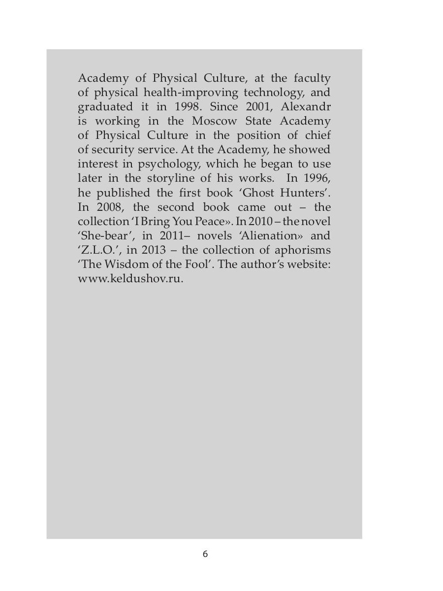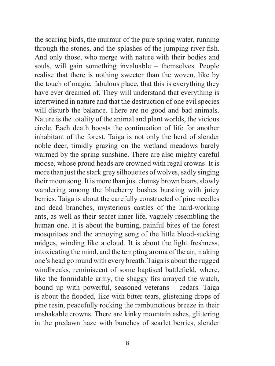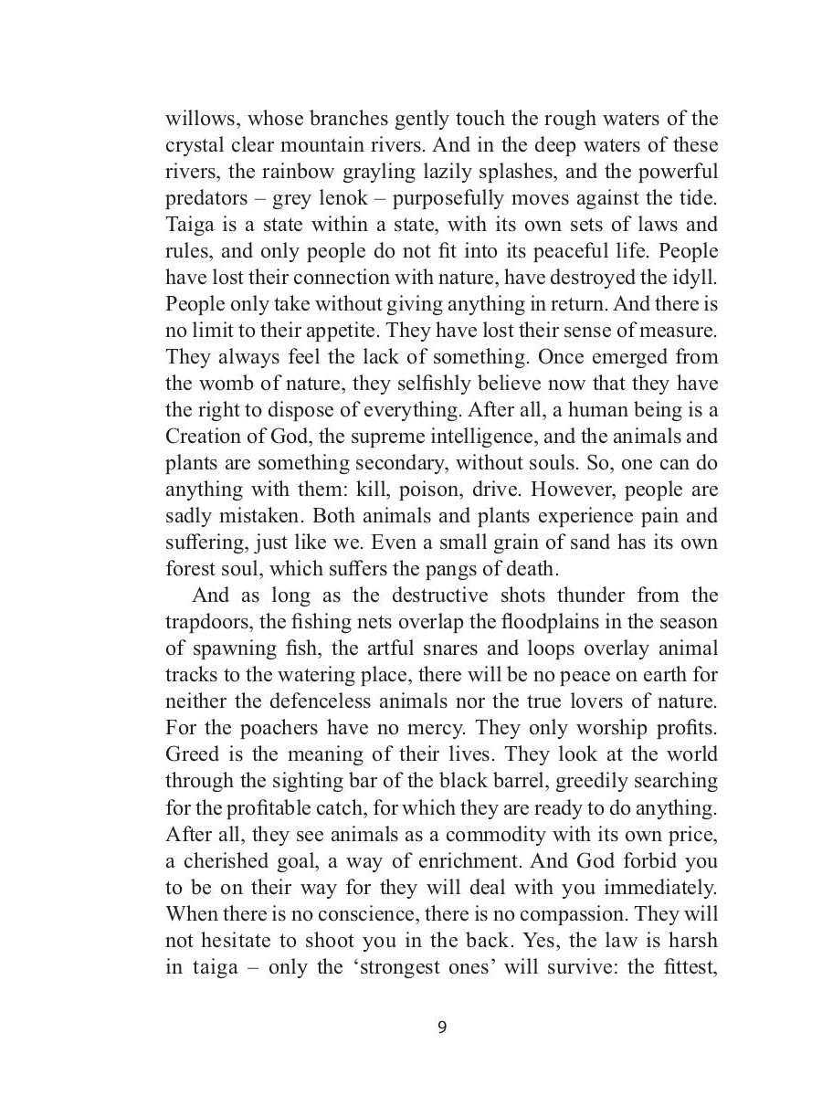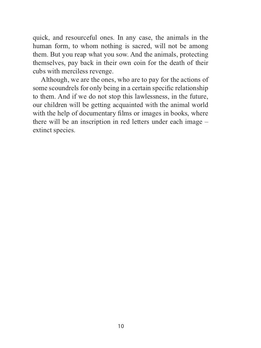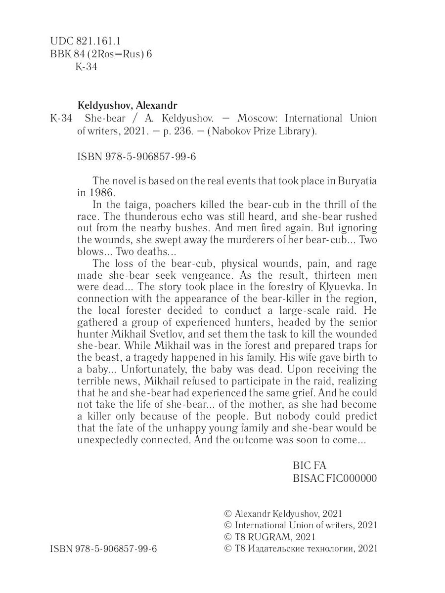 The novel is based on the real events that took place in Buryatia in 1986. In the taiga, poachers killed the bear-cub in the thrill of the race. The thunderous echo was still heard, and she-bear rushed out from the nearby bushes. And men fired again. But ignoring the wounds, she swept away the murderers of her bear-cub... Two blows... Two deaths... The loss of the bear-cub, physical wounds, pain, and rage made she-bear seek vengeance. As the result, thirteen men were dead... The story took place in the forestry of Klyuevka. In connection with the appearance of the bear-killer in the region, the local forester decided to conduct a large-scale raid. He gathered a group of experienced hunters, headed by the senior hunter Mikhail Svetlov, and set them the task to kill the wounded she-bear. While Mikhail was in the forest and prepared traps for the beast, a tragedy happened in his family. His wife gave birth to a baby... Unfortunately, the baby was dead. Upon receiving the terrible news, Mikhail refused to participate in the raid, realizing that he and she-bear had experienced the same grief. And he could not take the life of she-bear... of the mother, as she had become a killer only because of the people. But nobody could predict that the fate of the unhappy young family and she-bear would be unexpectedly connected. And the outcome was soon to come...| Издательство | Т8 RUGRAM |