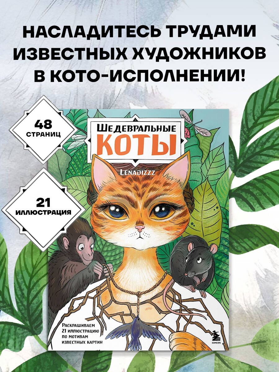Добро пожаловать в самую пушистую картинную галерею! «Портрет четы Мурнольфини», «Мурмео и Джуррльетта», «Кошечка на шаре» и другие великие картины - все это вы найдете на страницах этой раскраски. Под одной обложкой российская художница Елена Скрипченко, известная под псевдонимом Lenadizzz, собрала 21 иллюстрацию по мотивам самых известных шедевров живописи. Все рисунки отпечатаны через страницу, так что можете смело брать любимые карандаши и маркеры и погрузиться в мир искусства уже сейчас!| Издательство | ООО "Издательство "Эксмо" |