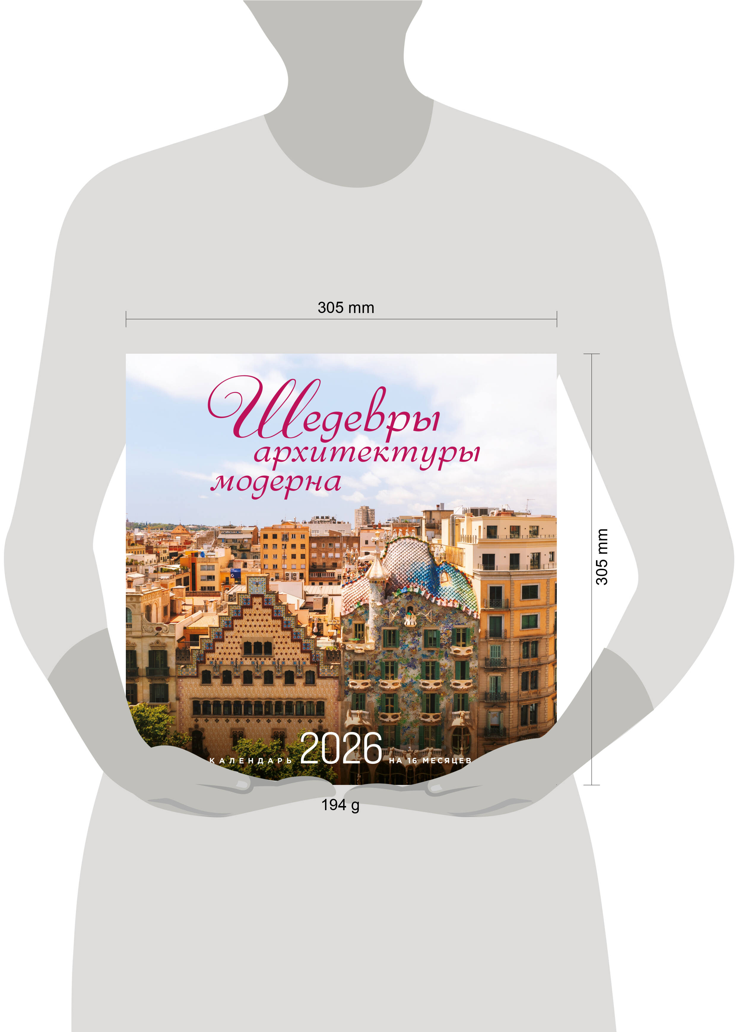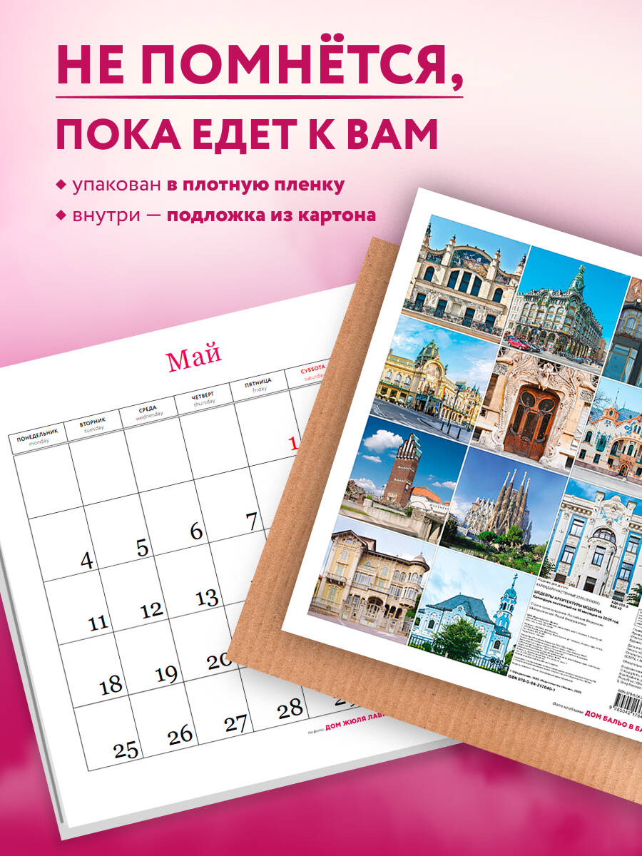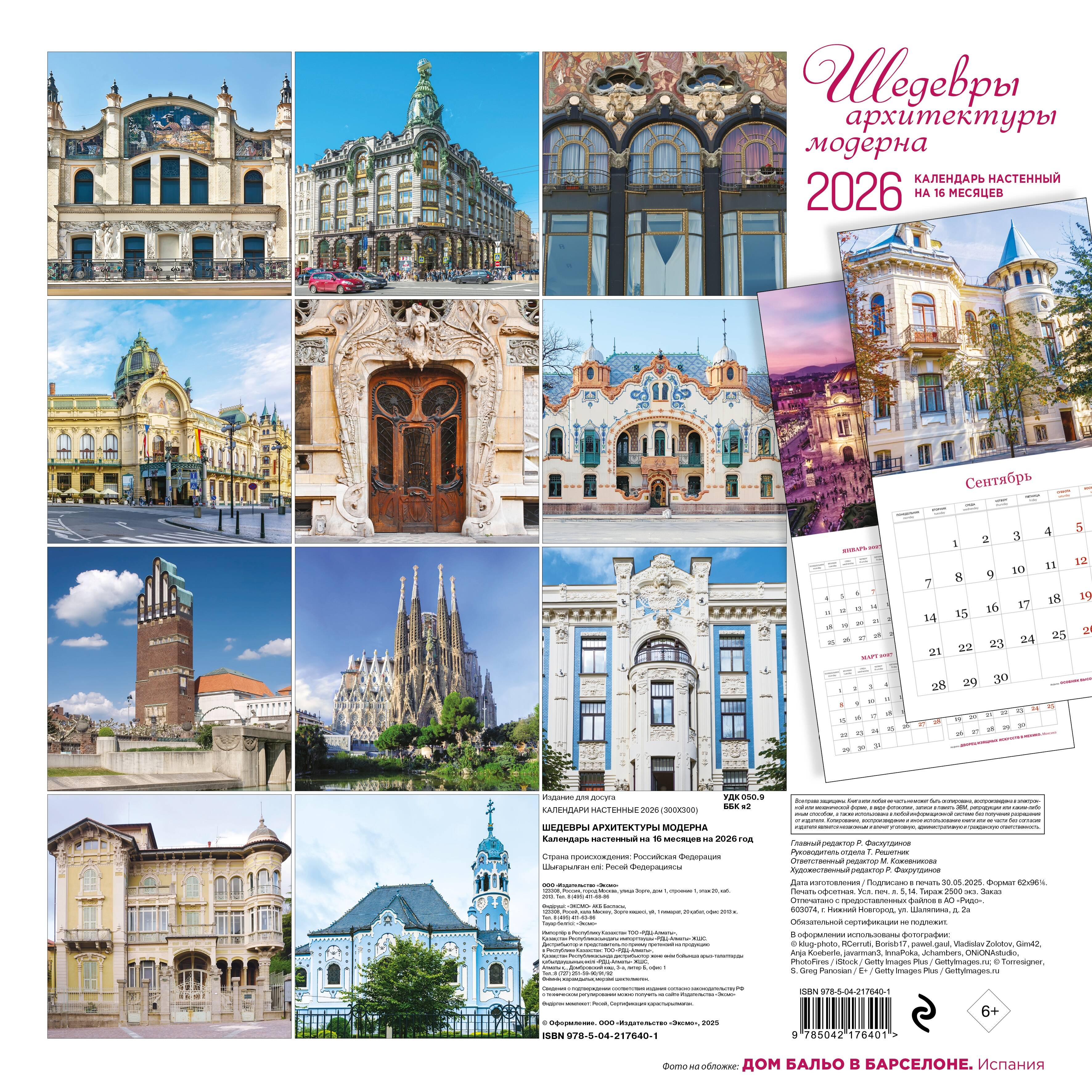 О серии: Наши настенные календари отличаются высоким качеством исполнения! Тщательно подобранные иллюстрации, напечатанные на глянцевой бумаге высочайшего качества, станут настоящим украшением дома, а в календарной сетке найдется место для ваших планов: большие клетки позволят делать записи и организовать свой год! В календаре также отмечены все государственные праздники. В серии настенных календарей издательства «ЭКСМО» каждый найдет тему по вкусу: великие художники, великолепные подборки с самыми знаменитыми произведениями искусства, легендарные кинематографические саги и игры, главные книжные авторы и бестселлеры, фотографии и иллюстрации любимых животных и многое-многое другое! О календаре: Ар-нуво во Франции, югендстиль в Германии, сецессион в Австрии, тиффани в США, модернизмо в Испании - все это названия одного направления, возникшего в мировой архитектуре конца XIX -начала XX века. В России этот стиль известен под названием модерн, его популярность в наши дни только набирает обороты. По всему миру сохранилось множество знаковых домов, некоторые из них собраны в этом календаре: великолепные работы Антонио Гауди в Барселоне, Дом компании Зингер в Петербурге, Муниципальный дом в Праге, Церковь святой Елизаветы в Братиславе и многие другие не менее прекрасные здания! Также в календарь включен дополнительный разворот с первыми четырьмя месяцами 2027 года! Для кого: Для всех любителей и ценителей архитектуры. Технические параметры: - Тип календаря - настенный перекидной. - Год - 2026. - Календарная сетка - с разбивкой по месяцам. - Вид скрепления - скрепка. - Ширина - 30 см. - Высота - 30 см. - Внутренний блок - мелованная бумага 115 г/м2. - Подложка - плотный гофрокартон для поддержания формы. - Индивидуальная упаковка в плотный целлофановый пакет.| Издательство | ООО "Издательство "Эксмо" |