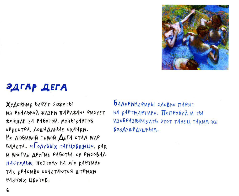 О чём мечтают и что вспоминают прекрасные героини картин Ренуара? Балерины словно парят на картине. Это совсем необычная книжка-раскраска, потому что иллюстрации - цветные впечатления от картин. В точности как у импрессионистов. А ещё - познавательные тексты для знакомства с картинами.| Издательство | Ад Маргинем Пресс |