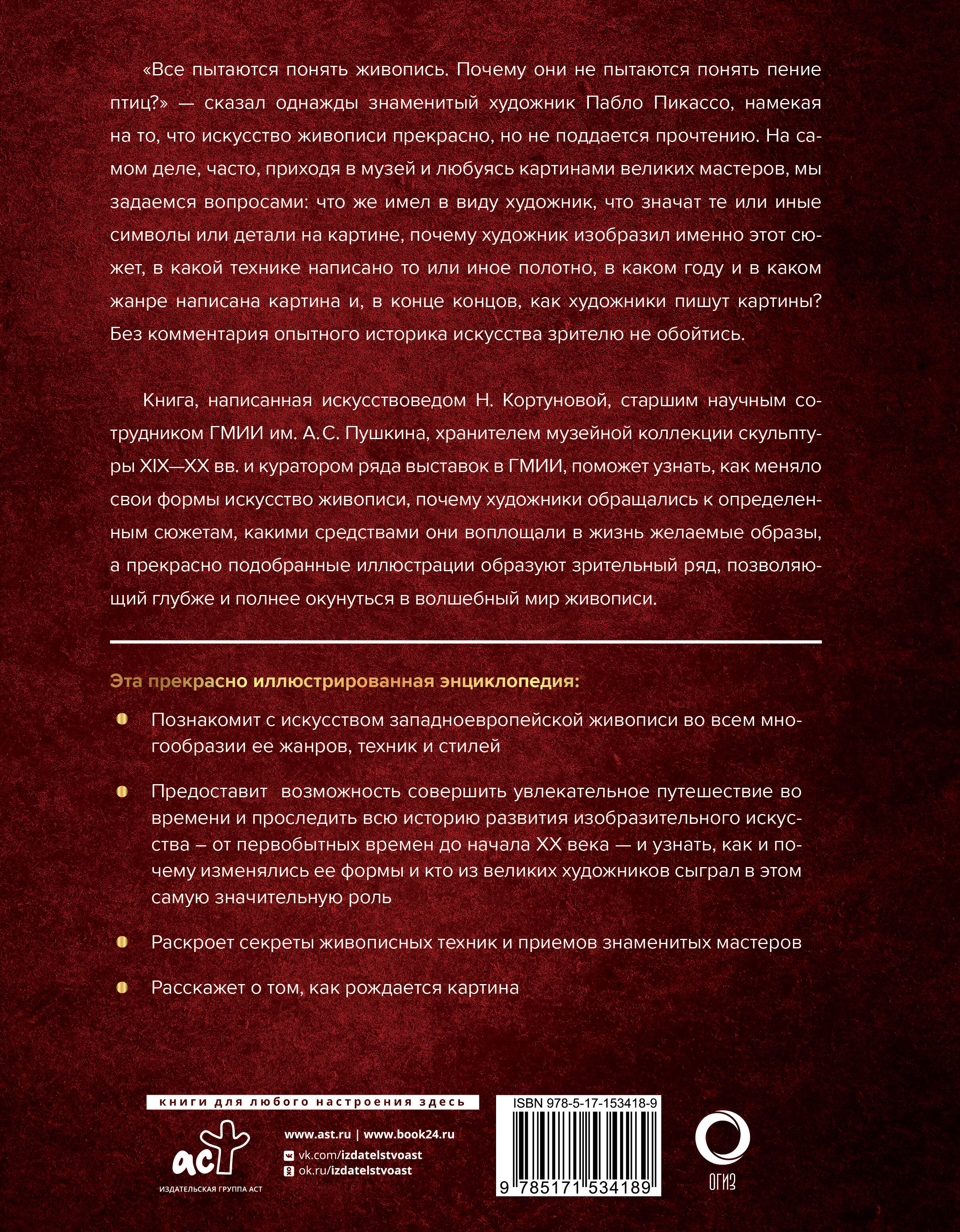 Все пытаются понять живопись. Почему они не пытаются понять пение птиц?" - сказал однажды знаменитый художник Пабло Пикассо, намекая на то, что искусство живописи прекрасно, но не поддается прочтению. На самом деле, часто приходя в музей и любуясь картинами великих мастеров, мы задаемся вопросами: "Что же имел ввиду художник?", "Что значат те или иные символы или детали на картине?", "Почему художник изобразил именно этот сюжет?", В какой технике написано то или иное полотно?", в каком году и в каком жанре написана картина?", и, в конце концов, "как художники пишут картины?" Без комментария опытного историка искусства зрителю не обойтись. Книга, написанная искусствоведом, старшим научным сотрудником ГМИИ им. А.С. Пушкина, хранителем музейной коллекции скульптуры XIX-XX вв., и куратором ряда выставок в ГМИИ, поможет узнать о том, как меняло свои формы искусство живописи, почему художники обращались к определенным сюжетам, какими средствами они воплощали в жизнь желаемые образы, а прекрасно подобранные иллюстрации образуют зрительный ряд, позволяющий глубже и полнее окунуться в волшебный мир живописи. Этот прекрасно иллюстрированный справочник: • Познакомит с искусством западноевропейской живописи во всем многообразии ее жанров, техник и стилей. • Предоставит возможность совершить увлекательное путешествие во времени и проследить всю историю развития изобразительного искусства - от первобытных времен до начала XX века и узнать, как и почему изменялись ее формы, и кто из великих художников сыграл в этом самую значительную роль. • Раскроет секреты живописных техник и приемов знаменитых мастеров • Расскажет о том, как рождается картина| Издательство | ИЗДАТЕЛЬСТВО "АСТ" |