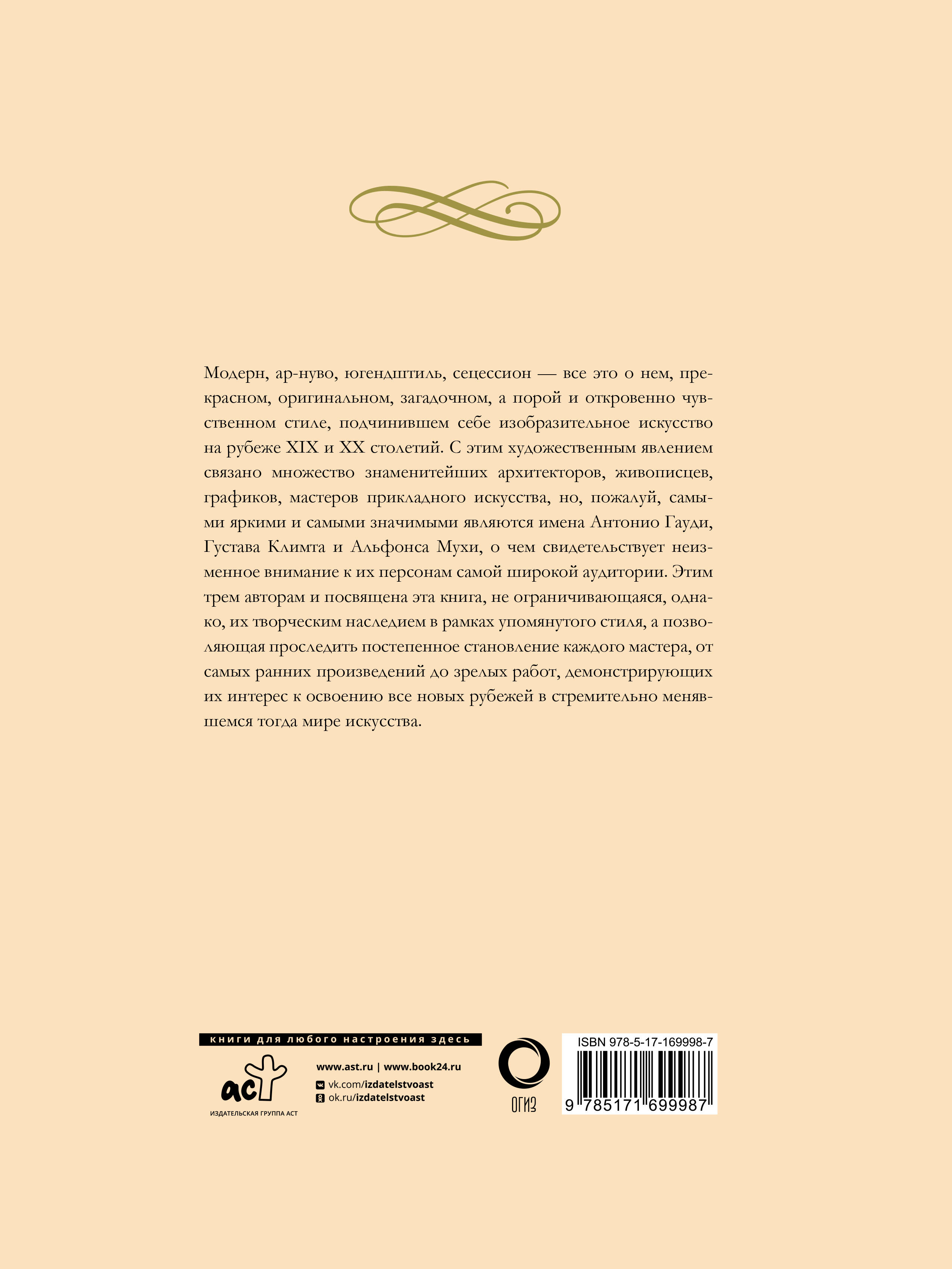 Модерн, ар-нуво, югендштиль, сецессион - все это о нем, прекрасном, оригинальном, загадочном, а порой и откровенно-чувственном стиле, подчинившем себе изобразительное искусство на рубеже XIX и XX столетий. С этим художественным явлением связано множество знаменитейших архитекторов, живописцев, графиков, мастеров прикладного искусства, но, пожалуй, самыми яркими и самыми значимыми являются имена Антонио Гауди, Густава Климта и Альфонса Мухи, о чем свидетельствует неизменное внимание к их персонам самой широкой аудитории. Этим трем авторам и посвящена эта книга, не ограничивающаяся, однако, их творческим наследием в рамках упомянутого стиля, а позволяющая проследить постепенное становление каждого мастера, от самых ранних произведений до зрелых работ, демонстрирующих их интерес к освоению все новых рубежей в стремительно менявшемся тогда мире искусства. Об авторе Кортунова Наталья Дмитриевна - старший научный сотрудник ГМИИ им. А.С. Пушкина, хранитель музейной коллекции скульптуры XIX-XX вв., искусствовед, автор лекционных курсов по истории западноевропейского искусства и истории скульптуры, автор бестселлеров "Как читать и понимать живопись", "Как читать и понимать искусство", "Модерн. Климт, Гауди", Муха", "Знаки, символы и аллегории в искусстве". Куратор ряда выставок ГМИИ, со-куратор выставочных проектов в ГМИИ - "Вим Дельвуа. Мимикрия" (2014), "Александр Колдер. Ретроспектива" (2015), "Река Конго. Искусство Центральной Африки" (2016). эксперт проекта "ModernArt&Development".| Издательство | Издательство "АСТ" |