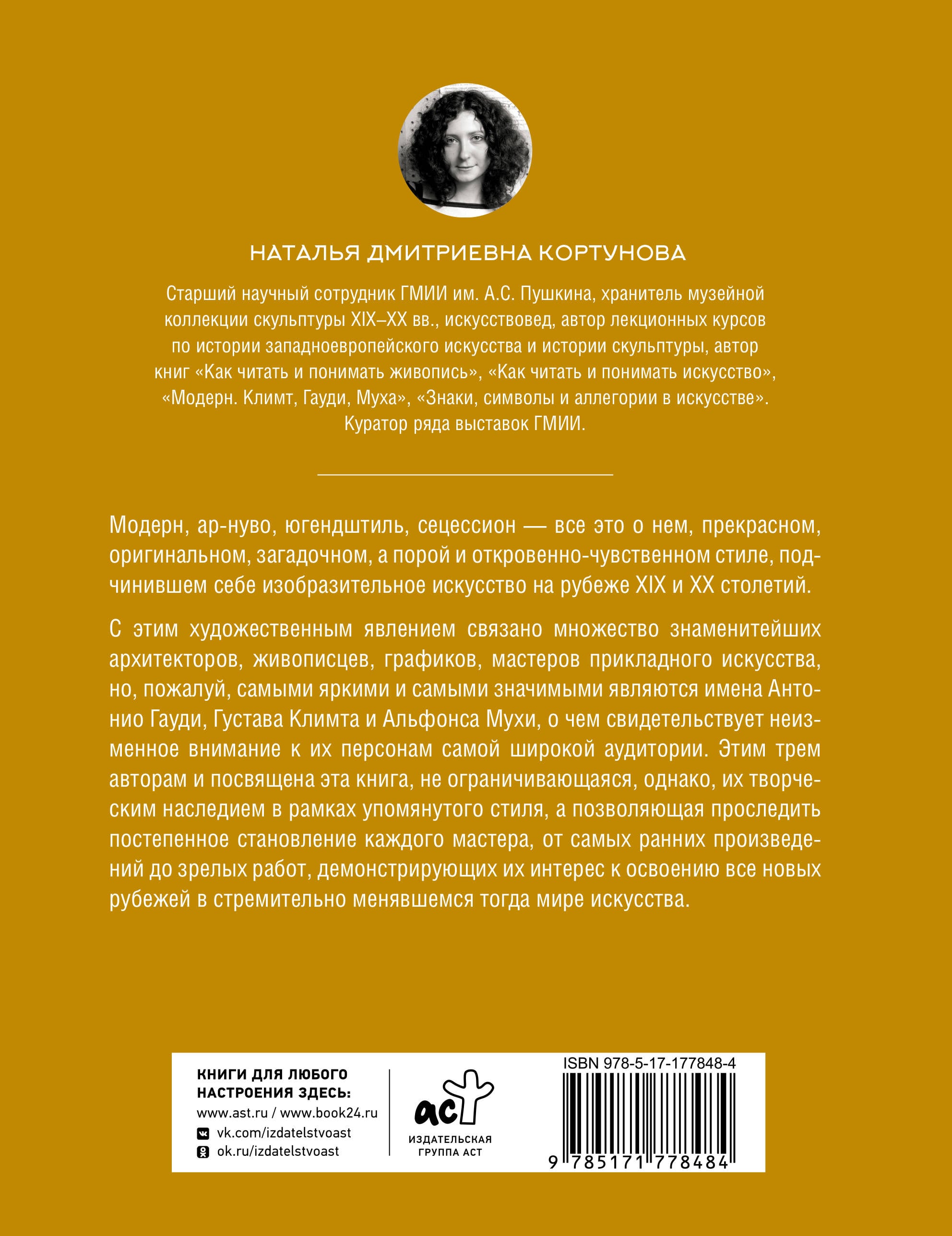 Автор - Наталья Кортунова - искусствовед, старший научный сотрудник отдела искусства стран Европы и Америки XIX-XX веков ГМИИ им. А.С. Пушкина, автор лекционных курсов по истории западноевропейского искусства и истории скульптуры, автор ряда книг: "Как читать и понимать живопись", "Знаки, символы и аллегории в искусстве". Наталья Кортунова - куратор ряда выставок ГМИИ, со-куратор выставочных проектов в ГМИИ - "Вим Дельвуа. Мимикрия" (2014), "Александр Колдер. Ретроспектива" (2015), "Река Конго. Искусство Центральной Африки" (2016). эксперт проекта "ModernArt&Development". Модерн - оригинальный, загадочный, а порой и откровенно-чувственный стиль, подчинивший себе изобразительное искусство на рубеже XIX и XX столетий. С этим художественным явлением связано множество знаменитейших архитекторов, живо- писцев, графиков, мастеров прикладного искусства, но, пожалуй, самыми яркими и самыми значимыми являются имена Антонио Гауди, Густава Климта и Альфонса Мухи. Этим трем авторам и посвящена эта книга, не ограничивающаяся, однако, их творческим наследием в рамках упомянутого стиля, а позволяющая проследить постепенное становление каждого мастера, от самых ранних произведений до зрелых работ.| Издательство | Издательство "АСТ" |