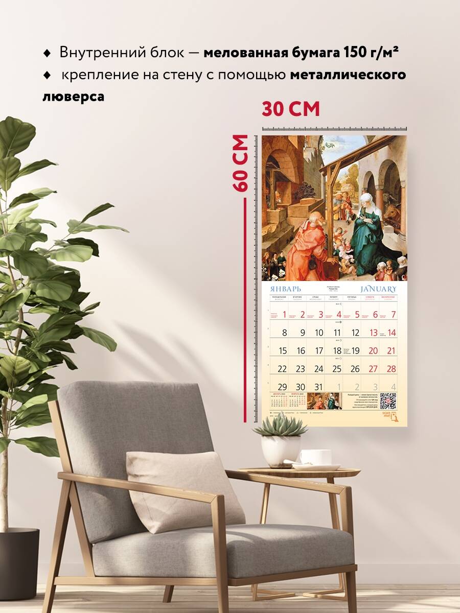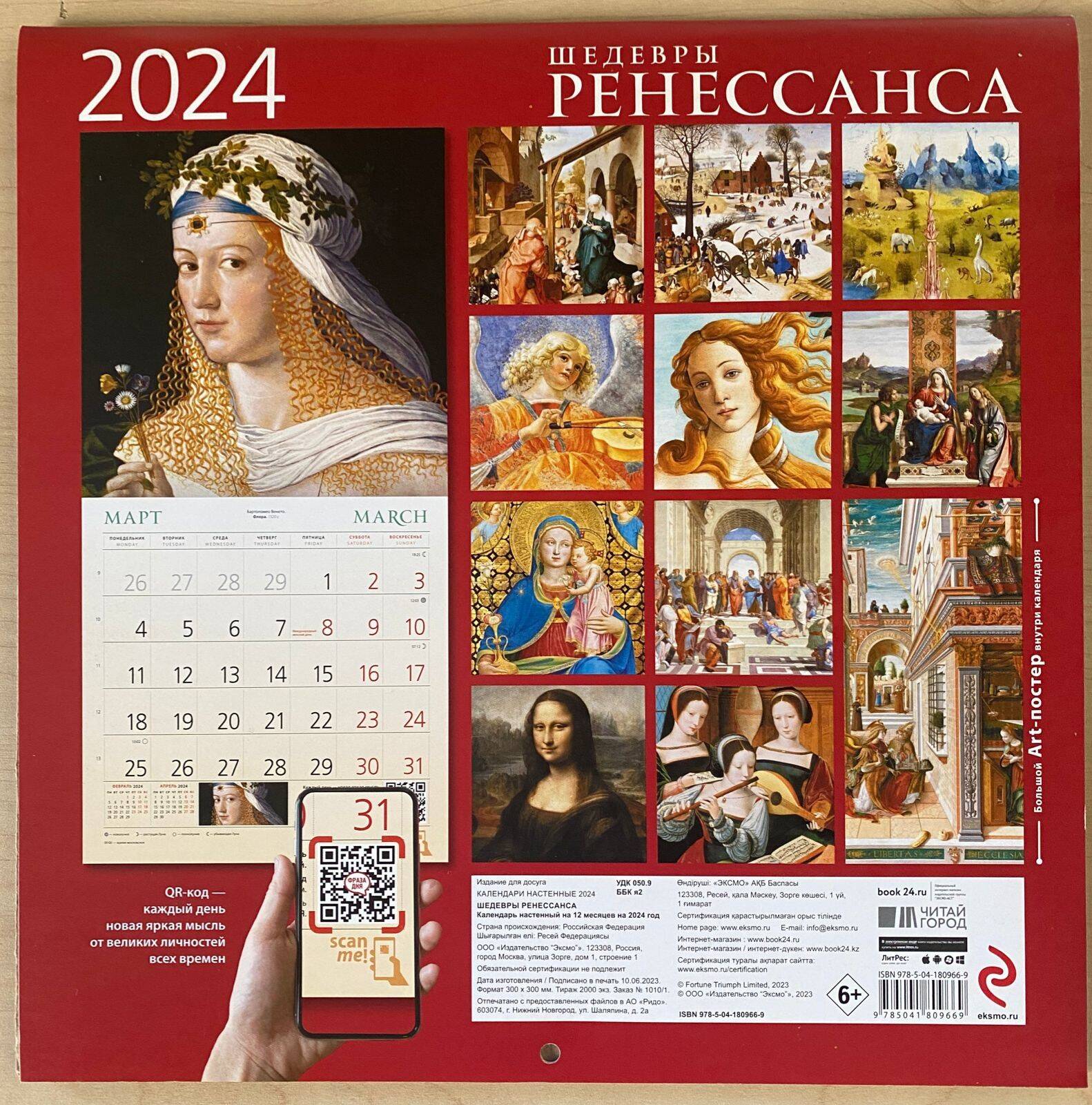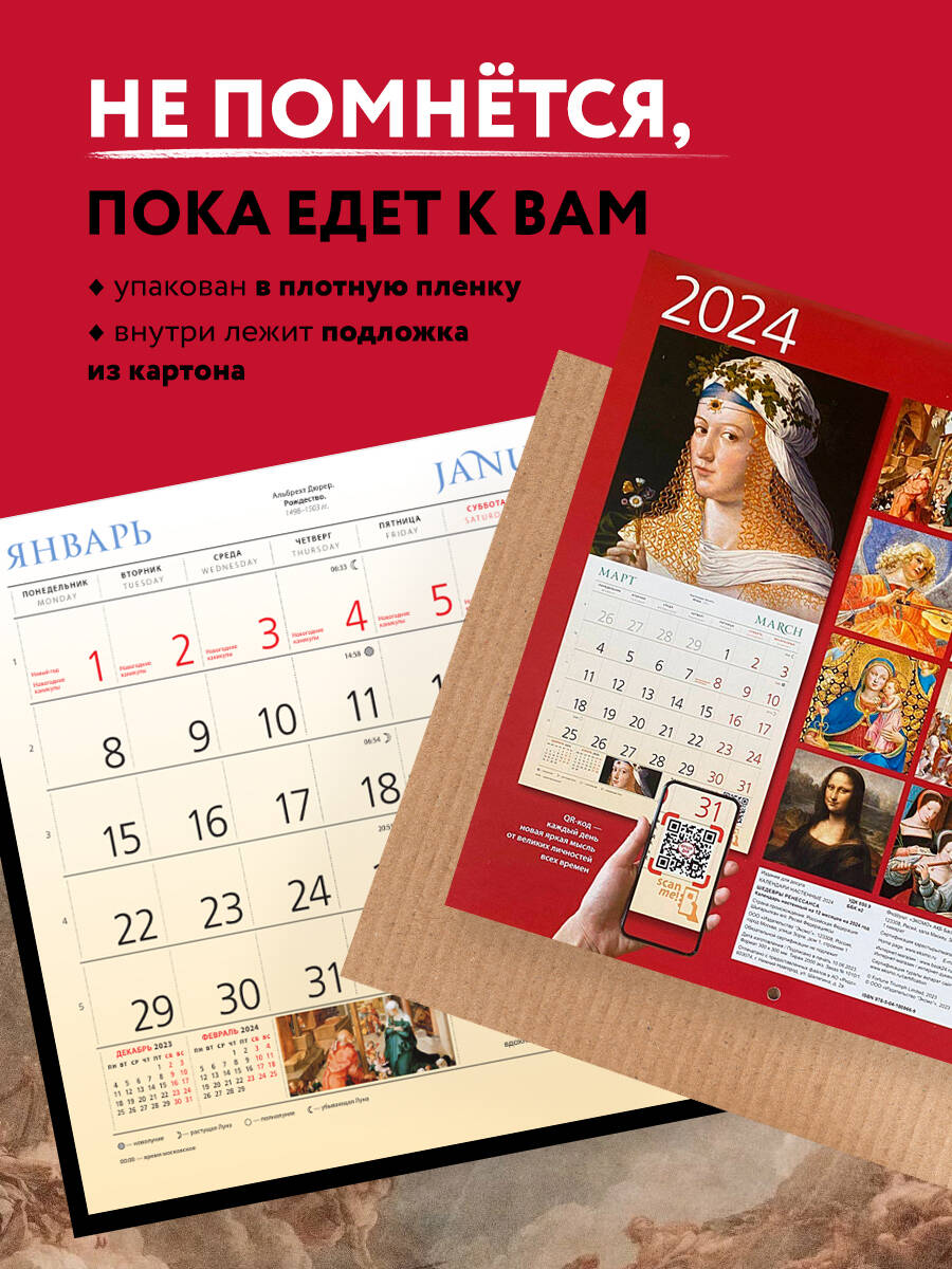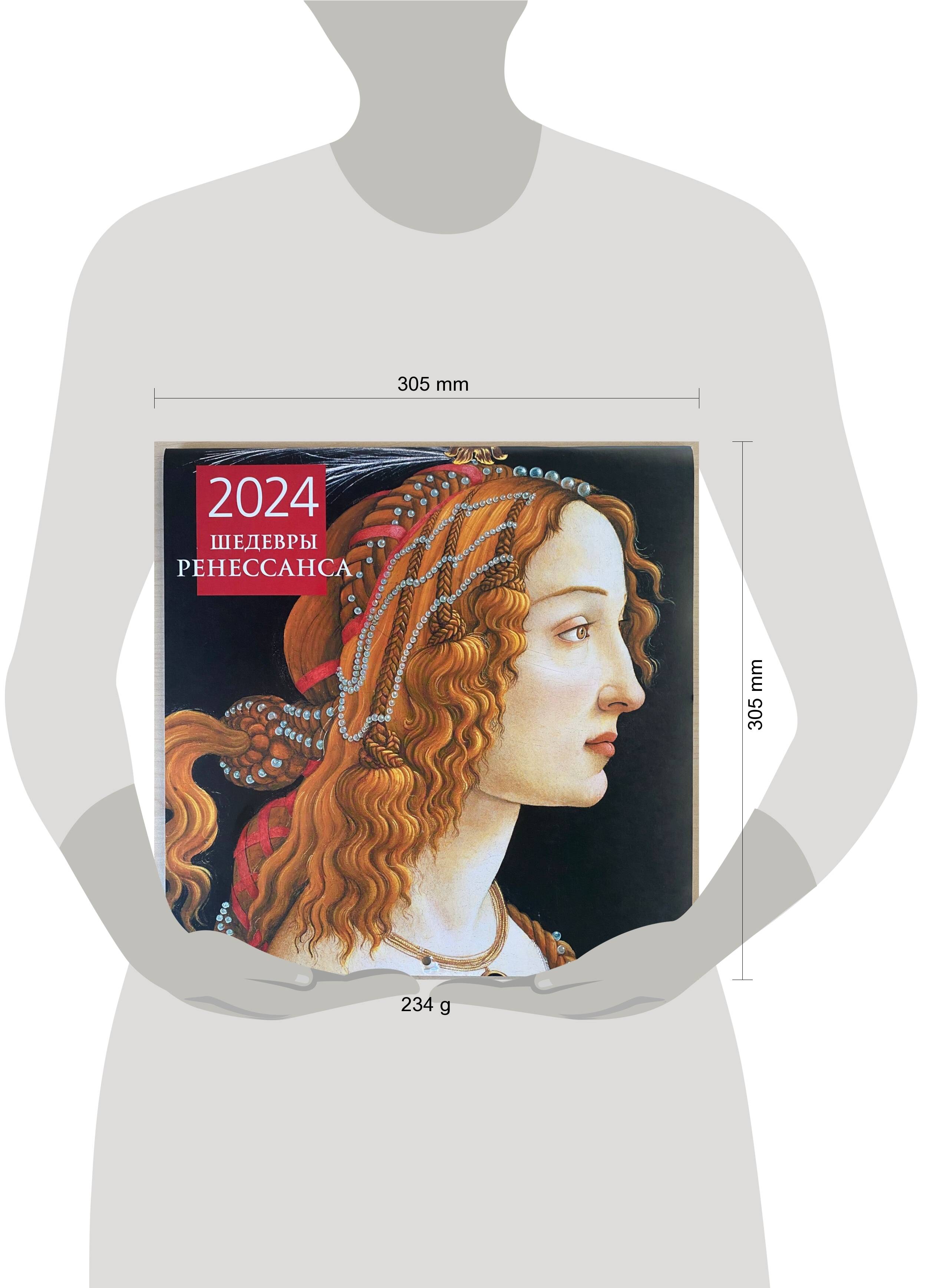 О серии: Наши настенные календари отличаются высоким качеством исполнения! Тщательно подобранные иллюстрации, напечатанные на глянцевой бумаге высочайшего качества, станут настоящим украшением дома, а в календарной сетке найдется место для ваших планов: большие клетки позволят делать записи и организовать свой год! В календаре также отмечены все государственные праздники. В серии настенных календарей издательства «ЭКСМО» каждый найдет тему по вкусу: великие художники, великолепные подборки с самыми знаменитыми произведениями искусства, легендарные кинематографические саги и игры, главные книжные авторы и бестселлеры, фотографии и иллюстрации любимых животных и многое-многое другое! О календаре: В этом настенном перекидном календаре на 2024 год представлены знаменитые картины великих художников. Повесьте этот календарь в своем доме или на рабочем месте, и он достойно украсит любой интерьер. А календарный блок напомнит о важных событиях года. В центре календаря помещен большой арт-постер, который может стать отдельным декоративным украшением интерьера. Для кого: Высокое качество полиграфического исполнения прекрасно дополняет репродукции шедевров живописи, что непременно будет по достоинству оценено людьми с хорошим вкусом. Технические параметры: - Тип календаря - настенный перекидной. - Год - 2024. - Календарная сетка - с разбивкой по месяцам. - Вид скрепления - скрепка. - Ширина - 30 см. - Высота - 30 см. - Внутренний блок - мелованная бумага 150 г/м2. - Подложка - плотный гофрокартон для поддержания формы. - Индивидуальная упаковка в плотный целлофановый пакет.