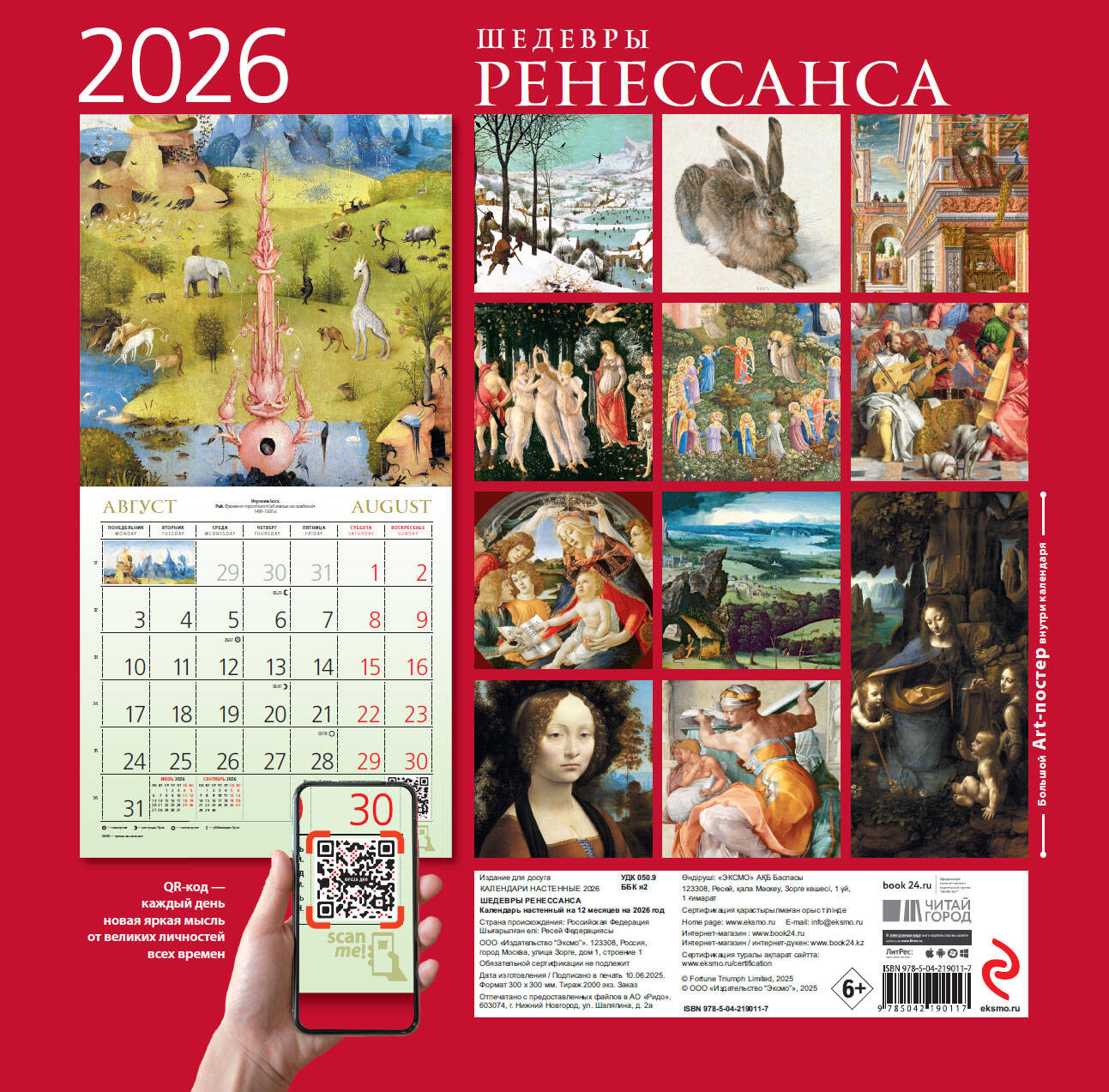 О календаре: В этом настенном перекидном календаре на 2026 год представлены знаменитые картины великих художников из эпохи Ренессанса. Повесьте этот календарь в своем доме или на рабочем месте, и он достойно украсит любой интерьер. А календарный блок напомнит о важных событиях года. В центре календаря помещен большой арт-постер, который может стать отдельным декоративным украшением интерьера. О серии: Наши настенные календари отличаются высоким качеством исполнения! Тщательно подобранные иллюстрации, напечатанные на глянцевой бумаге высочайшего качества, станут настоящим украшением дома, а в календарной сетке найдется место для ваших планов: большие клетки позволят делать записи и организовать свой год! В календаре также отмечены все государственные праздники. В серии настенных календарей издательства «ЭКСМО» каждый найдет тему по вкусу: великие художники, великолепные подборки с самыми знаменитыми произведениями искусства, легендарные кинематографические саги и игры, главные книжные авторы и бестселлеры, фотографии и иллюстрации любимых животных и многое-многое другое! Для кого: Высокое качество полиграфического исполнения прекрасно дополняет репродукции шедевров живописи, что непременно будет по достоинству оценено людьми с хорошим вкусом. Технические параметры: - Тип календаря - настенный перекидной. - Год - 2026. - Календарная сетка - с разбивкой по месяцам. - Вид скрепления - скрепка. - Ширина - 30 см. - Высота - 30 см. - Внутренний блок - мелованная бумага 115 г/м2. - Подложка - плотный гофрокартон для поддержания формы. - Индивидуальная упаковка в плотный целлофановый пакет.| Издательство | ООО "Издательство "Эксмо" |