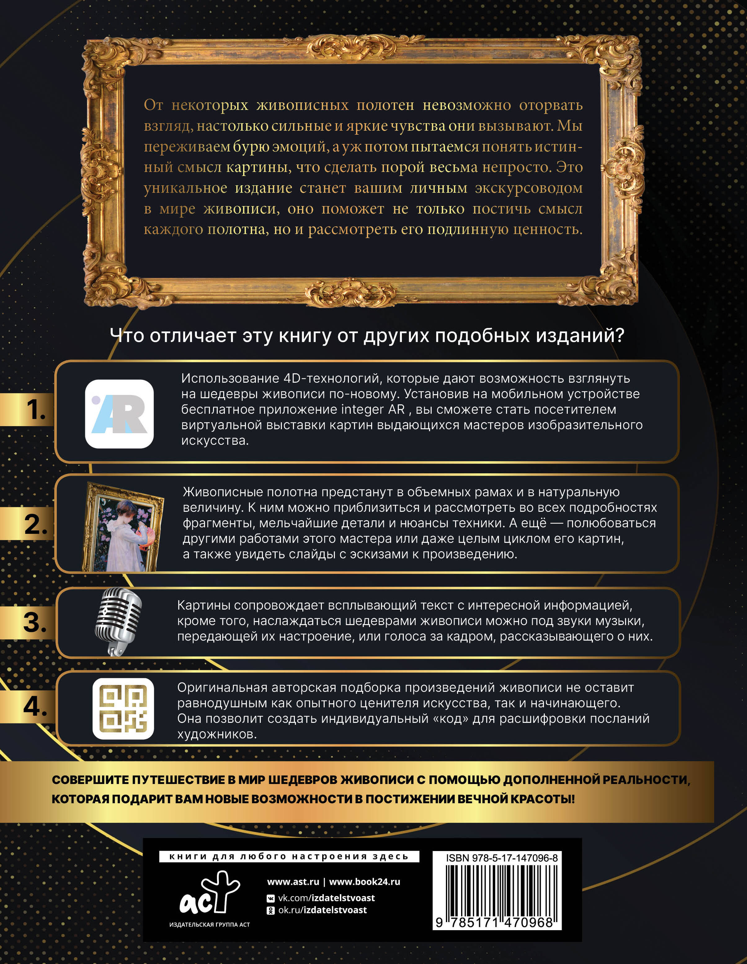 Уникальность книги «Шедевры живописи 4D. Энциклопедия с дополненной реальностью» - в использовании 4D-технологий, которые дают возможность взглянуть на шедевры живописи по-новому. Установив на мобильном устройстве бесплатное приложение integer AR, вы сможете стать посетителем виртуальной выставки картин выдающихся мастеров изобразительного искусства. Живописные полотна предстанут в объёмных рамах и в натуральную величину. К ним можно приблизиться и рассмотреть во всех подробностях фрагменты, мельчайшие детали и нюансы техники.| Издательство | АСТ |