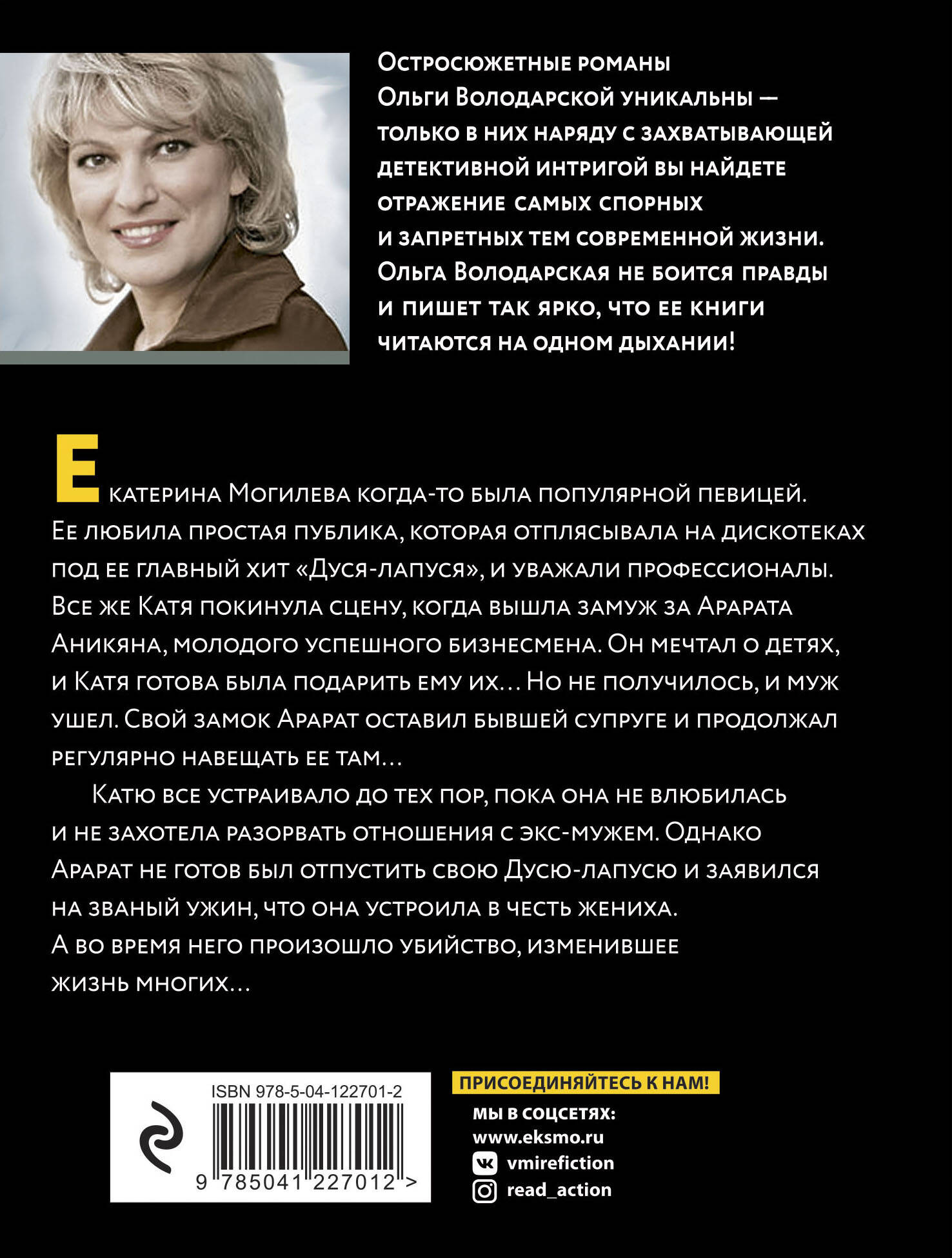 Екатерина Могилева когда-то была популярной певицей. Ее любила простая публика, которая отплясывала на дискотеках под ее главный хит «Дуся-лапуся», и уважали профессионалы. Все же Катя покинула сцену, когда вышла замуж за Арарата Аникяна, молодого успешного бизнесмена. Он мечтал о детях, и Катя готова была подарить ему их... Но не получилось, и муж ушел. Свой замок Арарат оставил бывшей супруге и продолжал регулярно навещать ее там. Катю все устраивало до тех пор, пока она не влюбилась и не захотела разорвать отношения с экс-мужем. Однако Арарат не готов был отпустить свою Дусю-лапусю и заявился на званый ужин, что она устроила в честь жениха. А во время него произошло убийство… Романы Ольги Володарской - остросоциальные детективы, в которых автор препарирует все стороны жизни современного общества, ничего не скрывая и ни о чем не умалчивая. Ее книги написаны так увлекательно, что оторваться просто невозможно. Яркий сочный язык и блестящий авторский стиль создают неповторимую атмосферу.| Издательство | ООО "Издательство "Эксмо" |