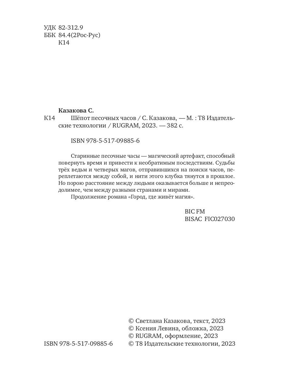Старинные песочные часы - магический артефакт, способный повернуть время и привести к необратимым последствиям. Судьбы трёх ведьм и четверых магов, отправившихся на поиски часов, переплетаются между собой, и нити этого клубка тянутся в прошлое. Но порою расстояние между людьми оказывается больше и непреодолимее, чем между разными странами и мирами. Продолжение романа «Город, где живёт магия».| Издательство | Т8 RUGRAM |