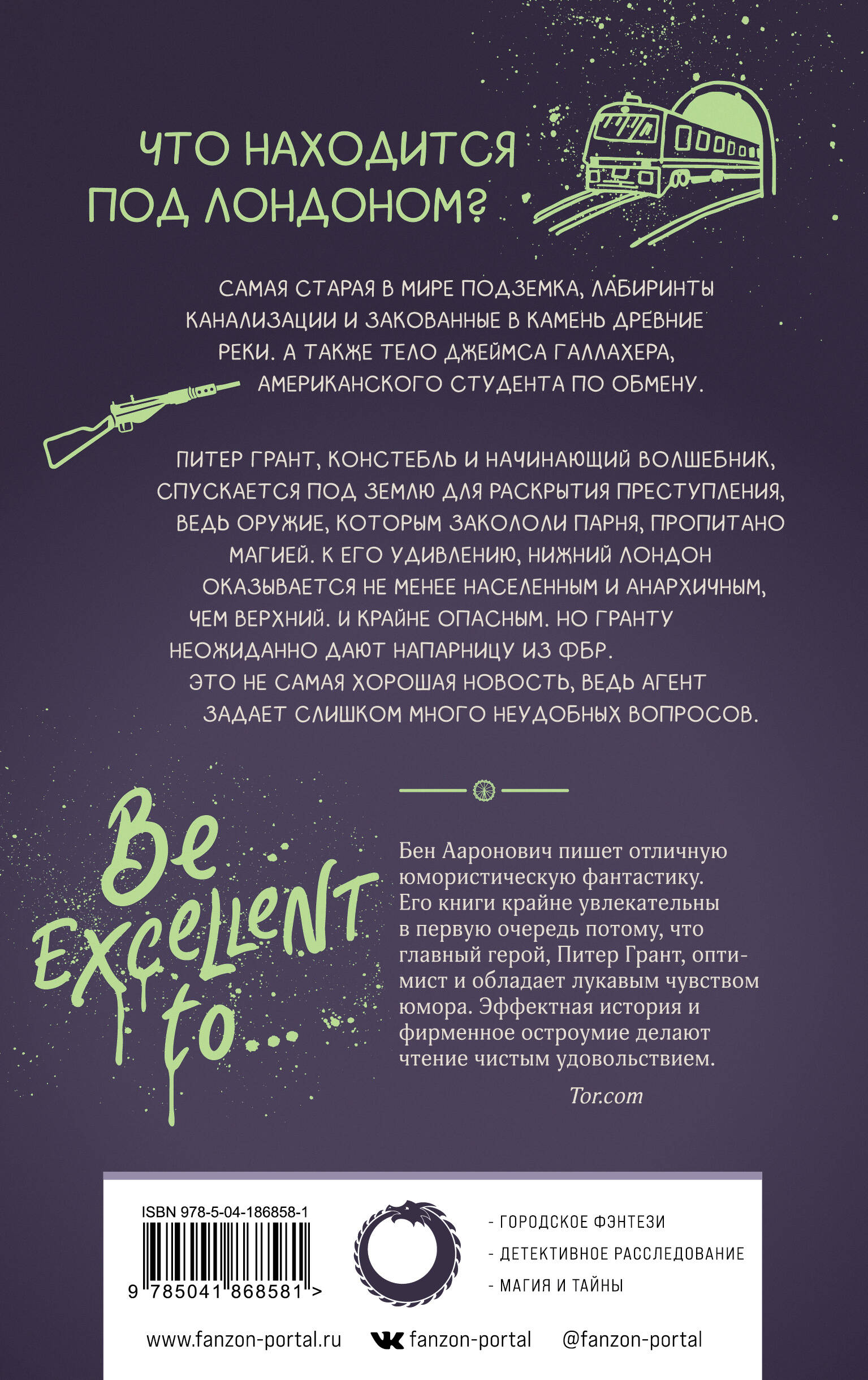 Номинация на премию «Локус». Роман-финалист Немецкой фантастической премии. На севере Лондона, в Тафнелл Парке, прямо под одной из школьных площадок проходит железнодорожный тоннель, ведущий к станции Кингс-Кросс. Мокро, грязно, опасно. Прекрасное место. Поэтому однажды, в воскресенье перед Рождеством, одна из кузин затащила меня туда на поиски призраков. Мы нашли одного. Вот и все. А в понедельник по службе мне пришлось отправиться на место преступления: неизвестный был зарезан в подземке на станции Бейкер-стрит. Возможно, здесь замешано сверхъестественное. Естественно, на орудии убийства было много следов магии. Убитый оказался сыном сенатора США, и ,прежде чем вы успеете произнести «международный инцидент», со мной связывается агент ФБР. А внизу, в темноте, в тоннелях лондонского метро, в заброшенных канализационных коллекторах и во тьме рек, погребенных при королеве Виктории, я слышу очень странные вещи… «Этот захватывающий и динамичный роман приятен, остроумен и благожелателен к новым читателям». - Publishers Weekly «Бен Ааронович пишет отличную юмористическую фантастику. Эти книги крайне увлекательны, в первую очередь потому, что главный герой, Питер Грант, обладает оптимизмом и лукавым чувством юмора. Эффектная история и фирменное остроумие делает чтение чистым удовольствием». - Tor.com «История остроумна, сюжет продуман, а персонажи невероятно симпатичны». - Time Out «Идеальное сочетание "C.S.I.: Место преступления" и Гарри Поттера». - io9| Издательство | ООО "Издательство "Эксмо" |