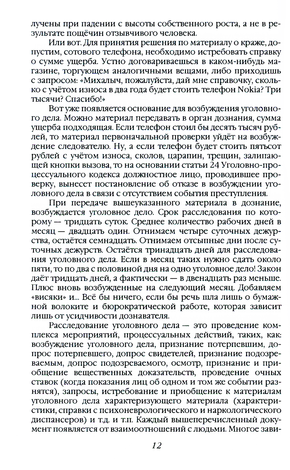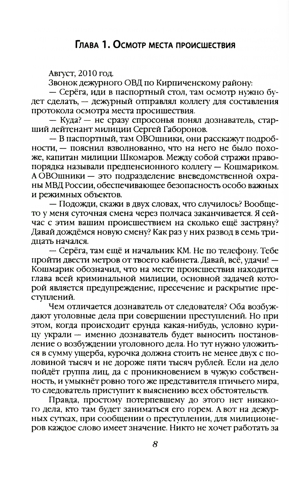 Если работа следователя воспета в многочисленных детективах, то профессия дознавателя обделена вниманием писателей и сценаристов. Однако она есть и скрывается за стопками уголовных дел попроще. Среди которых встречаются случаи, требующие от дознавателя смекалки, сурового опыта и рентгеновской проницательности. В этой истории, вы вместе со старшим лейтенантом милиции Габороновым, погрузитесь в расследования уголовных дел 2010 года. Этот период выбран не случайно. Впереди будет знаменитая реформа МВД, когда милиция стала полицией. И сейчас, вспомнив как было, можно будет сравнить, что из этого получилось, что поменялось, к чему это привело. Вы увидите настоящие материалы: протокол осмотра места происшествия, допросы, явку с повинной... Посмотрите, сколько времени, сил и средств нужно для разбирательства последствий одного лишь взмаха ноги, причинения телесных повреждений, краж и других, касающихся простых людей преступлений…