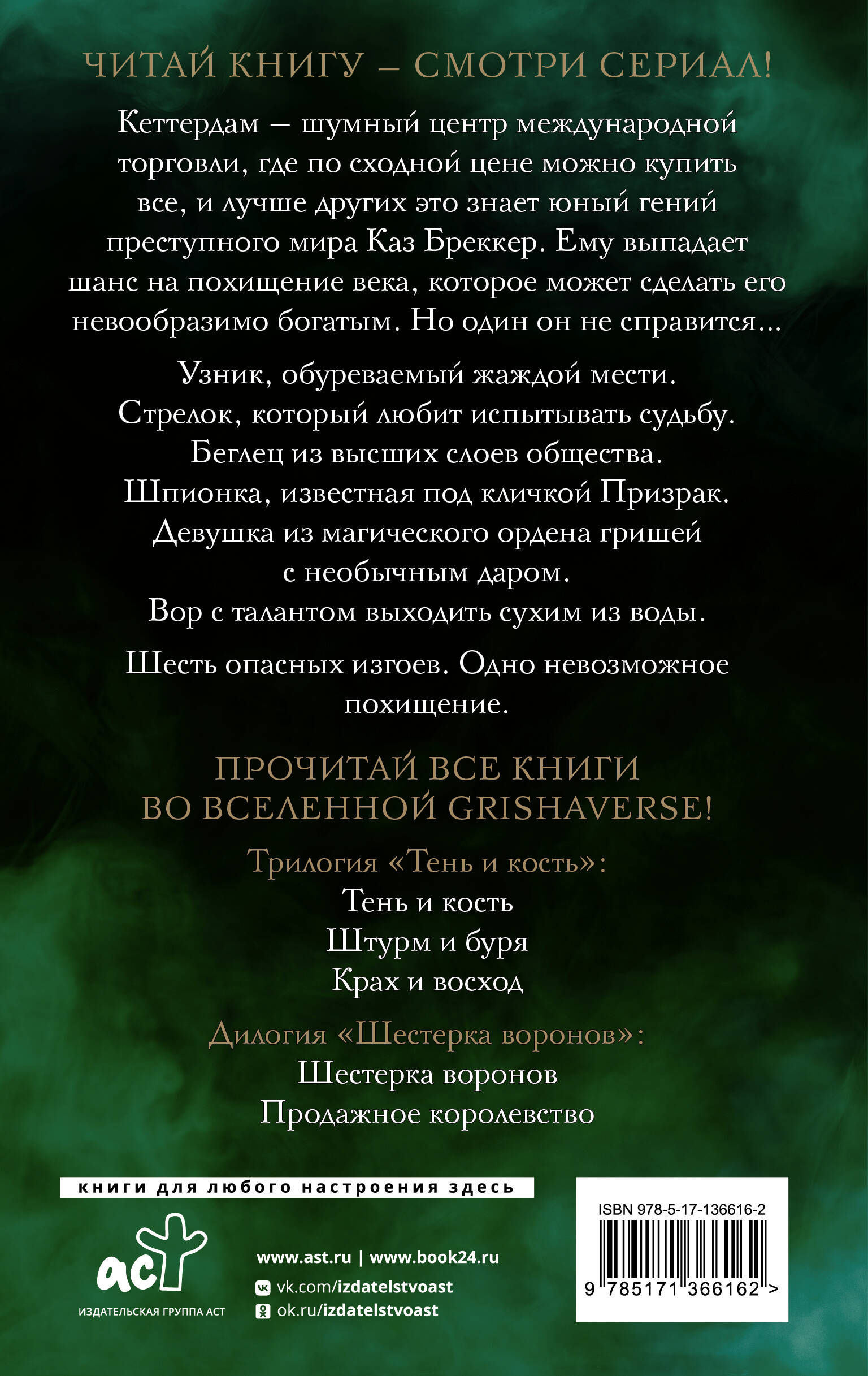 «Шестерка воронов» - спин-офф трилогии бестселлеров Бардуго о необычных, «модифицированных» людях - гришах. Действие книги разворачивается в трущобах столицы государства Керчия Кеттердама, портового города, где царит беззаконие, а выживает хитрейший. Всем здесь заправляют местные банды с колоритными названиями: «Черные пики», «Обломщики», «Отбросы». Именно последние, действующие под охраной эмблемы гордой птицы, - и есть шестерка воронов. И именно им, этим циникам и изгоям, предстоит почти невыполнимая миссия: выкрасть из неприступной тюрьмы ученого, создавшего наркотик, способный в десятки раз увеличить силу гриша. Возможен ли хэппи-энд в этой мрачной, натуралистичной истории? Кажется, что вряд ли.| Издательство | ИЗДАТЕЛЬСТВО "АСТ" |