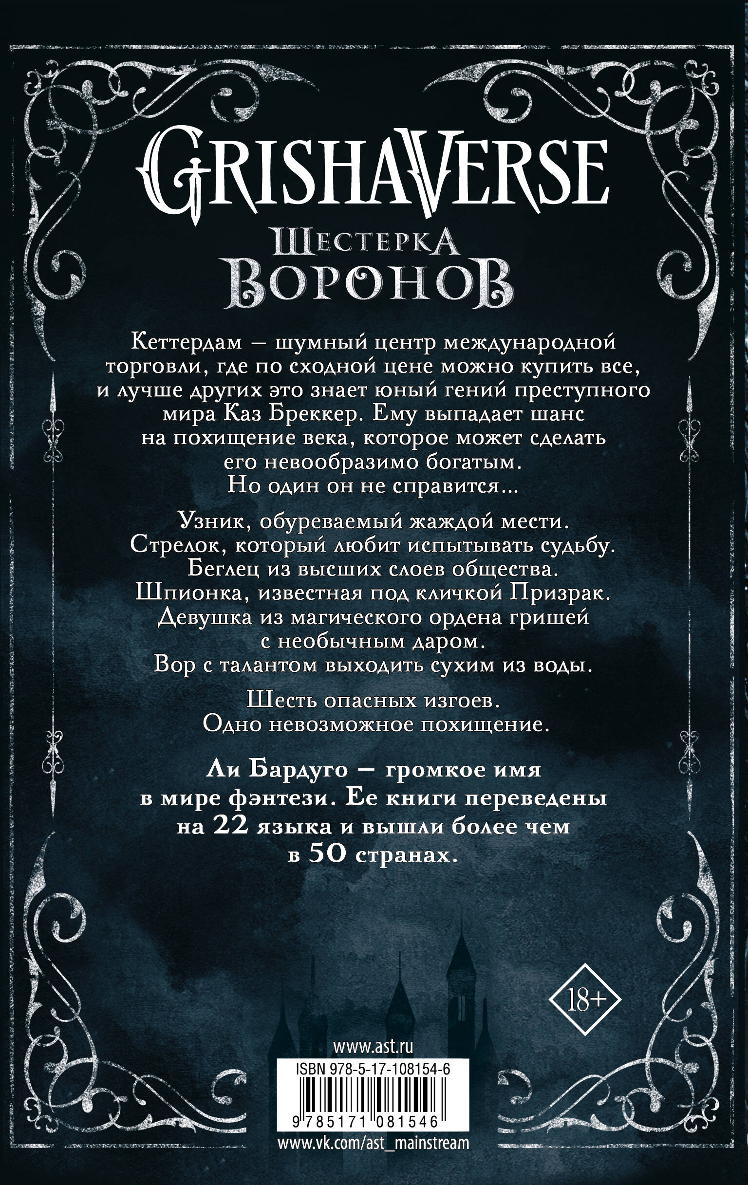 Первый роман молодой американской писательницы Ли Бардуго «Тень и кость» вышел в 2012 году и сразу же пополнил ряды бестселлеров «New York Times»: вселенная магов-гришей моментально покорила сердца читателей! Абсолютно новый мир, продуманный до мелочей и наполненный мистикой и жестокой борьбой за власть, можно сравнить разве что с «Игрой престолов». Изданные в 2013 и 2014 годах продолжения цикла также стали хитами продаж и окончательно утвердили Бардуго в статусе автора одной из самых ярких фэнтези-эпопей десятилетия. Права на экранизацию купила студия DreamWorks, и, возможно, в ближайшем будущем образы главных героев трилогии воплотят на экране лучшие голливудские актеры! «Шестерка воронов» - следующая глава в истории этого мира. Судьба и будущее могущественной нации гришей внезапно оказывается в руках хладнокровного бандита Каза Бреккера и его команды. Кто они? У каждого из них свои секреты, которые они тщательно оберегают даже друг от друга... Их ждут опасные приключения, головокружительные пейзажи, жуткие монстры и древняя магия. Вселенная гришей становится шире и открывается в новых потрясающих подробностях! Одной книжкой здесь не обойтись. Продолжение обязательно будет!| Издательство | ИЗДАТЕЛЬСТВО "АСТ" |