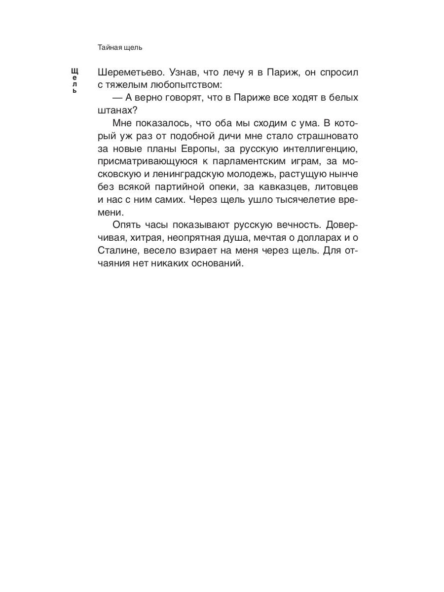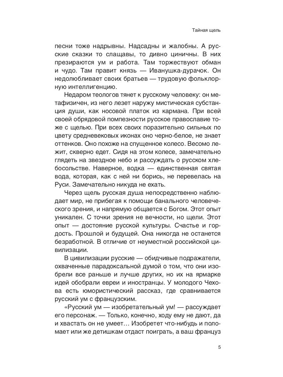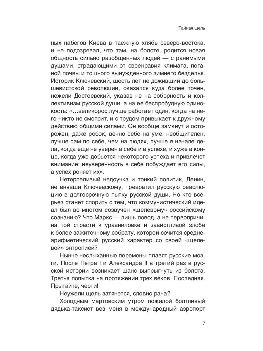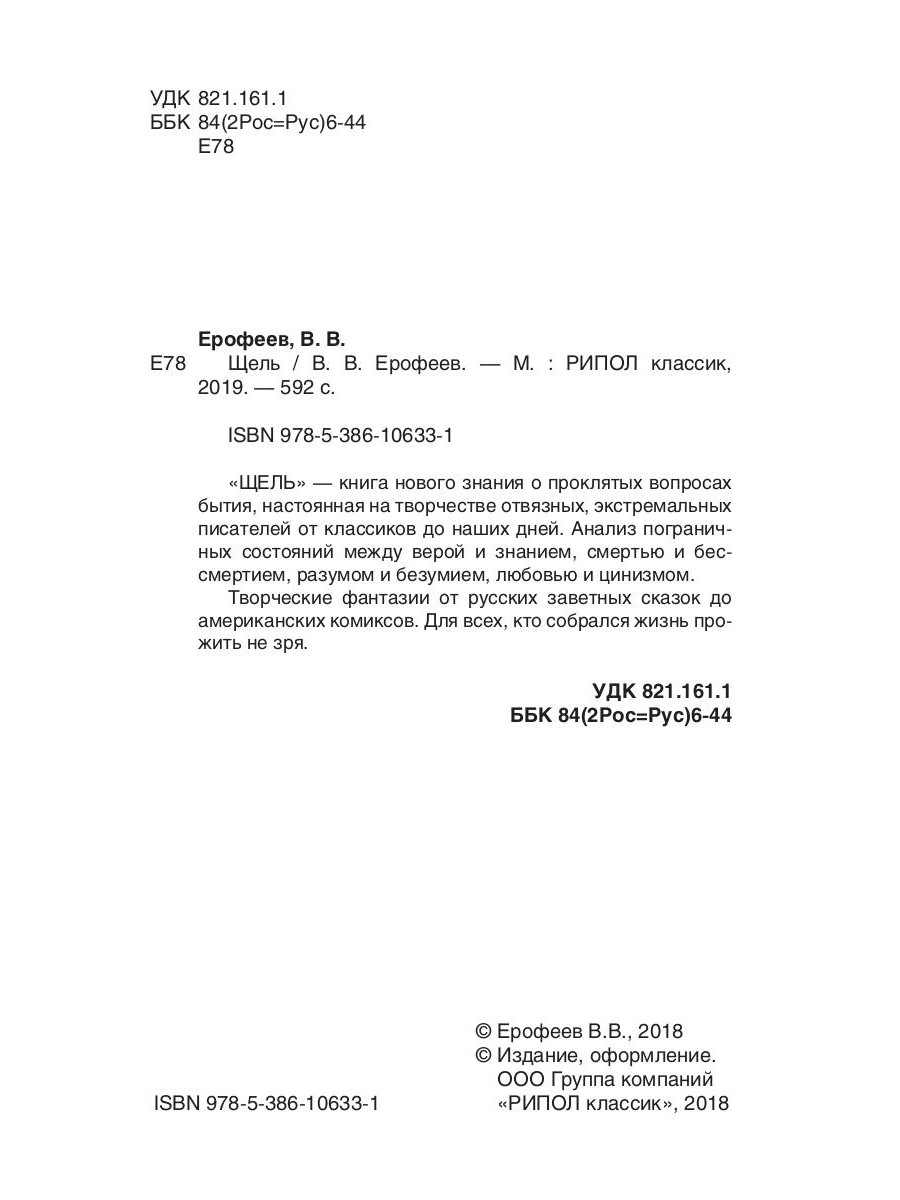 «Щель» - книга нового знания о проклятых вопросах бытия, настоянная на творчестве отвязных, экстремальных писателей от классиков до наших дней. Анализ пограничных состояний между верой и знанием, смертью и бессмертием, разумом и безумием, любовью и цинизмом.