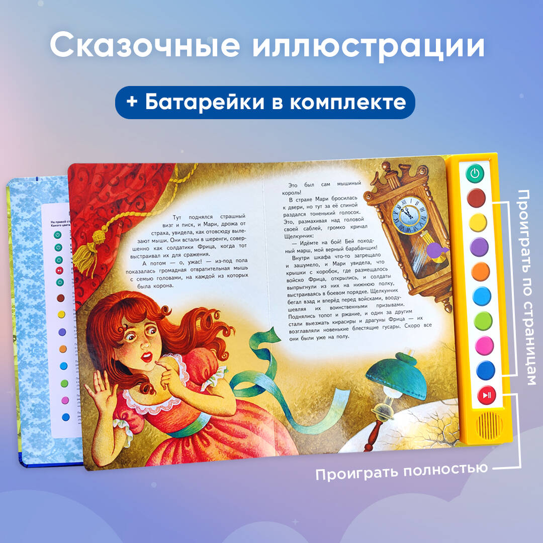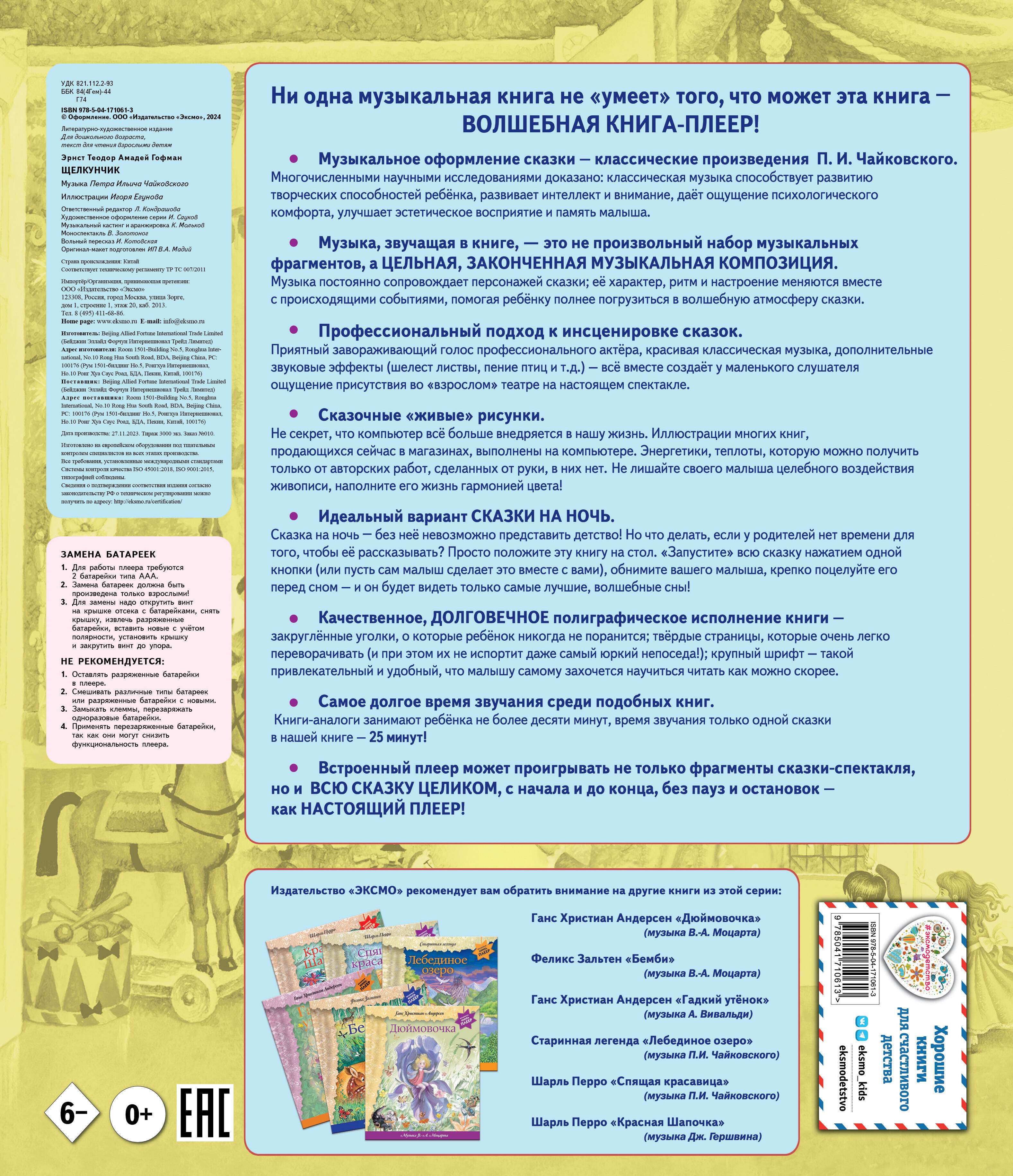 Музыкальная книга-плеер - это прекрасное сочетание традиционной книги и современных технологий. Красочное иллюстрированное издание классической сказки дополнено звуковым модулем-плеером. Яркие, крупные кнопки на панели модуля позволяют прослушать сказку как по главам, так и полностью, от начала до конца, а также сделать паузу в прослушивании. Время звучания всей сказки - 25 минут, РЕКОРД СРЕДИ ЗВУКОВЫХ КНИГ. Наша книга - это идеальный вариант «сказки на ночь»: пока ребёнок слушает книгу и засыпает, взрослые могут заняться своими делами. Профессиональное художественное чтение текста сопровождается завершёнными музыкальными композициями - шедеврами мировой классики. Только в наших книгах-плеерах используются дополнительные звуки (шелест листвы, пение птиц и т. п.), создающие эффект присутствия на настоящем спектакле! Музыкальная книга-плеер укомплектована двумя энергоёмкими алкалиновыми батарейками типа ААА. Музыкальные книги крайне полезны в процессе воспитания и развития детей. Они способствуют развитию мелкой моторики, образного мышления, речи, формируют эстетическое восприятие. Классическая музыка положительно влияет на развитие интеллекта и даёт ощущение психологического комфорта.| Издательство | ООО "Издательство "Эксмо" |
