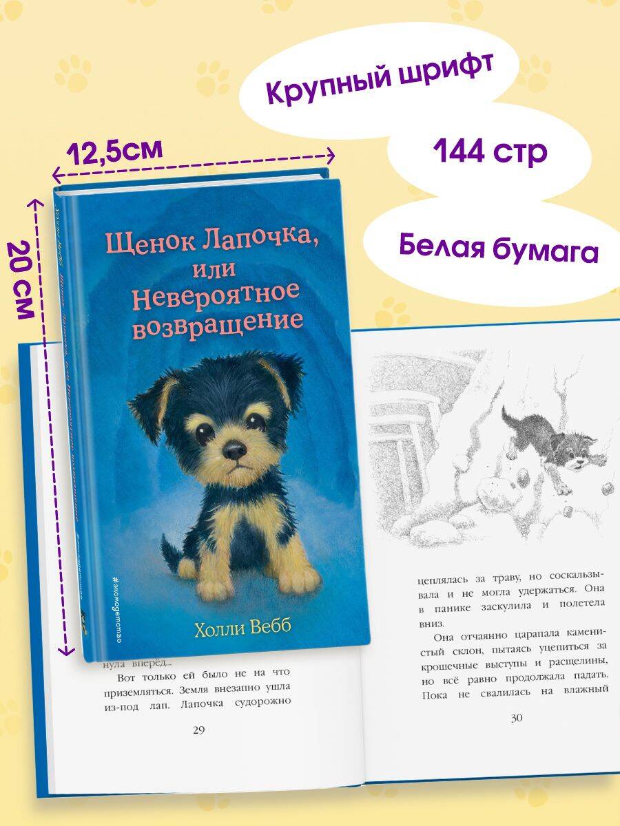 НОВИНКА ОТ ХОЛЛИ ВЕББ - АВТОРА СЕРИИ-БЕСТСЕЛЛЕРА «ДОБРЫЕ ИСТОРИИ О ЗВЕРЯТАХ»! Трогательная история о дружбе девочки и щенка - для мальчиков и девочек 6-9 лет! В семье Амелии появляется щенок терьера - любопытная девочка по кличке Лапочка. Но однажды на прогулке собачка исчезает, провалившись в старую шахту. Теперь Амелия должна найти Лапочку, пока малышка блуждает под землёй. Сможет ли девочка спасти своего щенка? Увлекательный рассказ о животных поможет ребёнку полюбить книги, научиться читать с удовольствием и навсегда запомнить первую любимую книжку про щенка! Во всех книгах серии законченный сюжет, поэтому их можно читать в любом порядке. Книга с крупными буквами, на белой бумаге, внутри красивые чёрно-белые иллюстрации художницы Софи Вильямс, которые позволят детям переключать внимание, не нагружая глаза. Подходит для первого самостоятельного чтения. Холли Вебб - писательница, популярная во всём мире, но особенно её полюбили в России, что подтверждают многомиллионные тиражи. Читайте другие книги в серии «Добрые истории о зверятах. Мировой бестселлер», а также серии «Котята в музее» и «Мейзи Хитчинс. Приключения девочки-детектива»!| Издательство | ООО "Издательство "Эксмо" |