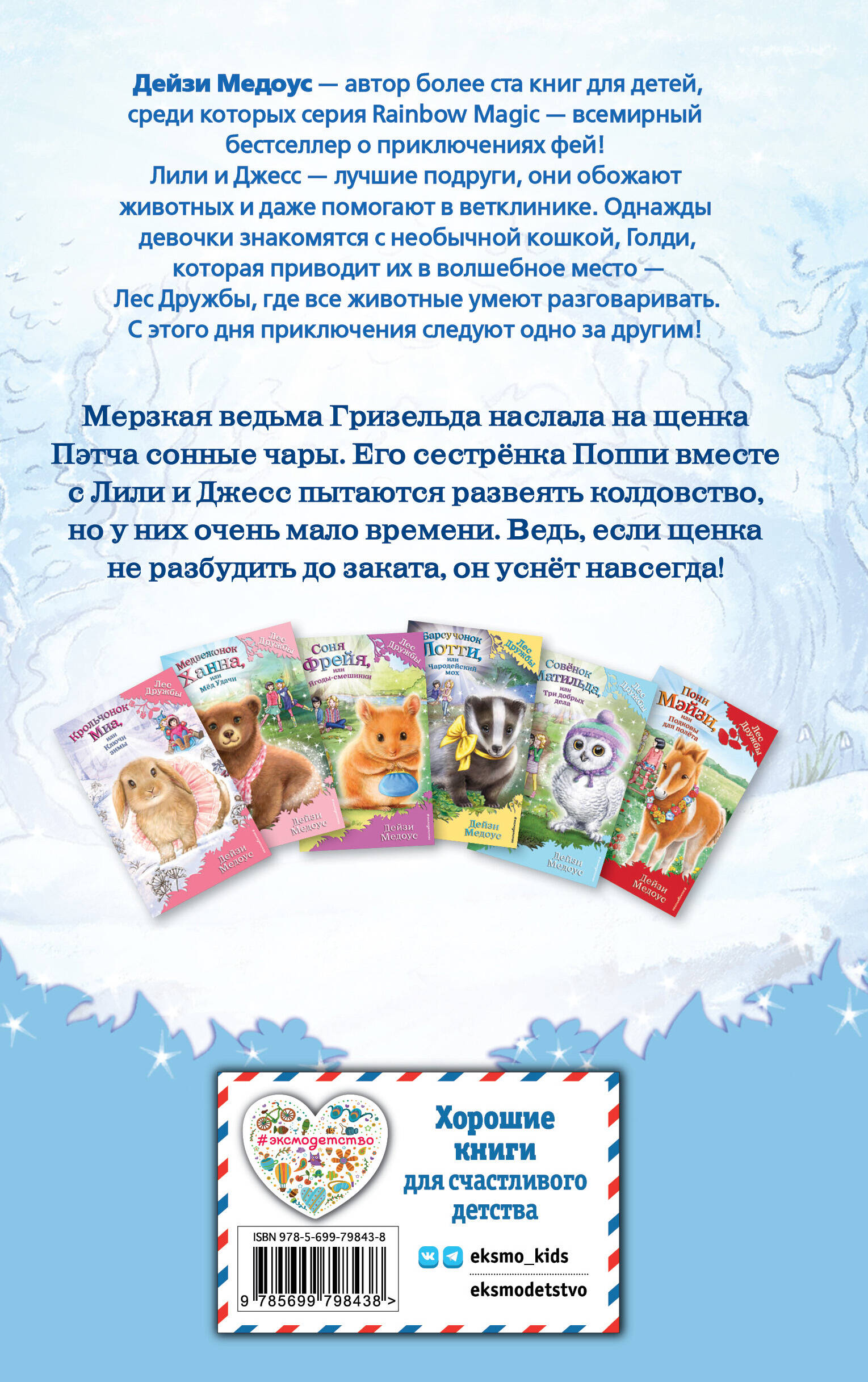 Мерзкая ведьма Гризельда наслала на щенка Пэтча сонные чары. Его сестрёнка Поппи вместе с Лили и Джесс пытаются развеять колдовство, но у них очень мало времени. Ведь, если щенка не разбудить до заката, он уснёт навсегда! Специздание! Это история из трёх частей, трёх захватывающих дух приключений! Дети по всему миру любят истории британской писательницы Дейзи Медоус! Крупный шрифт, красивые чёрно-белые иллюстрации и увлекательная история понравятся как тем детям, которые уже любят читать, так и тем, у которых навыки чтения ещё не закрепились.