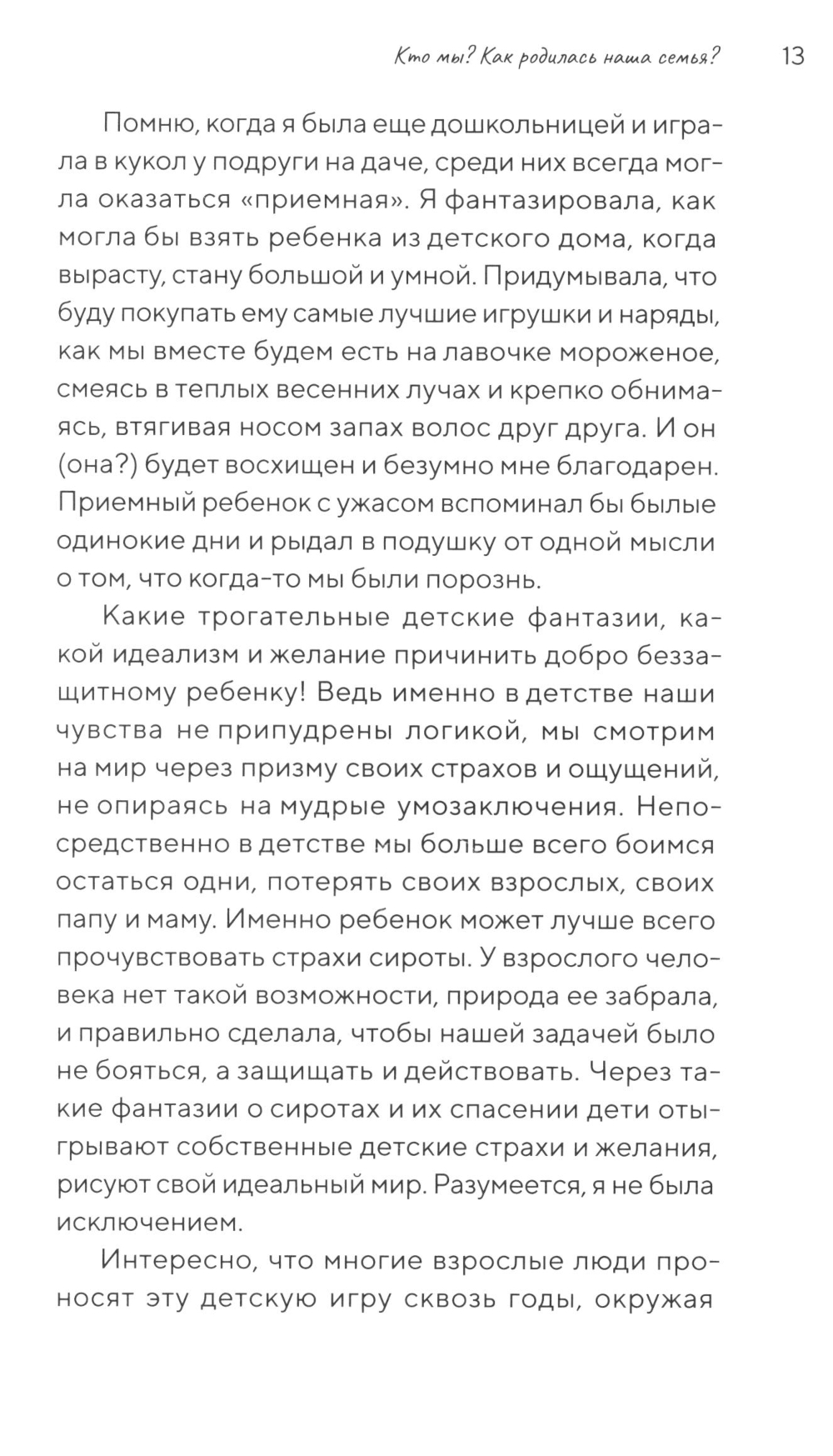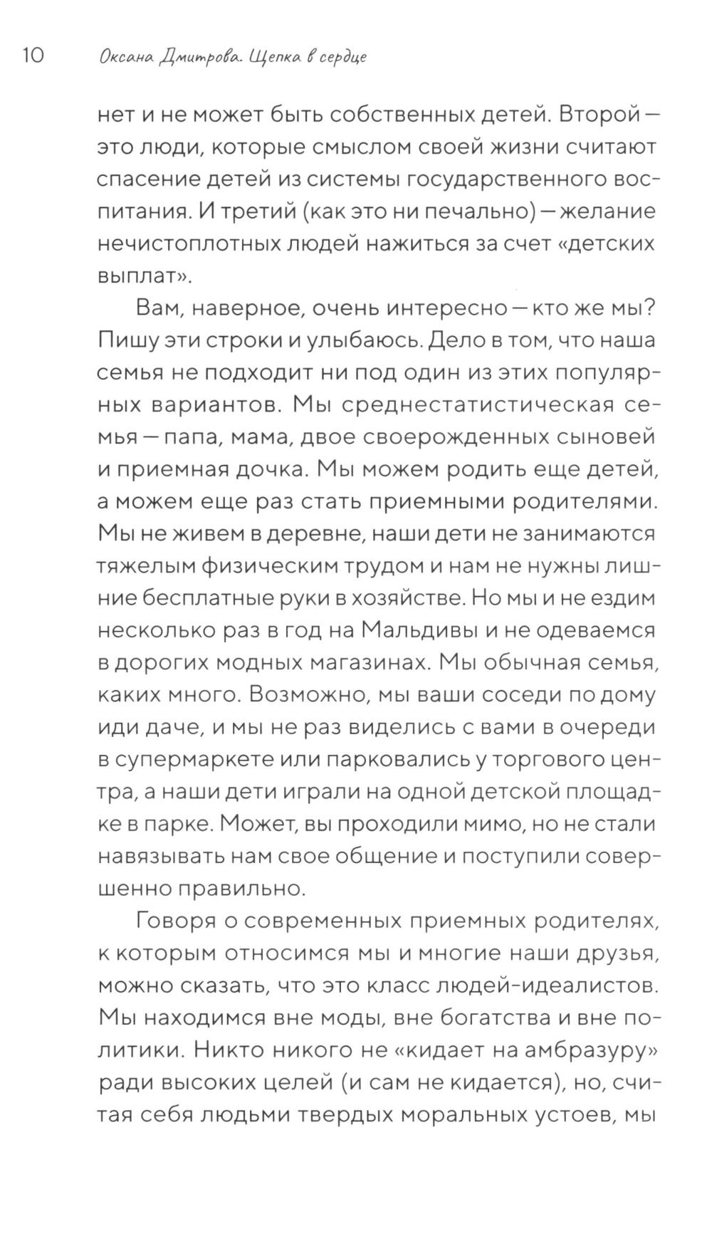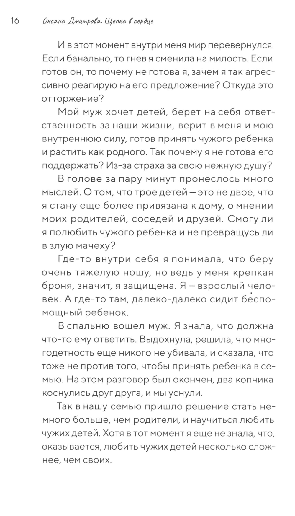 «Щепка в сердце» - книга, посвященная теме семьи, в которой растет приемный ребенок. В семье есть еще двое своих детей. Но для родителей нет разделения на родных и приемных. Автор давно ведет свой блог, где много и подробно рассказывает о проблемах детей сирот. Ее собственный опыт приемного родительства описан в «Дневнике приемной мамы» с подкупающей откровенностью, без замалчивания сложных жизненных ситуаций и встречающихся на этом трудном пути подводных камней. Книга будет интересна и полезна не только приемным родителям, но всем, кто воспитывает детей в семьях, в детских учреждениях, кто хотел бы оказывать помощь детским домам. Эта книга - для всех неравнодушных людей, которых волнуют вопросы воспитания и становления детей-сирот, а также проблемы взаимоотношений детей и родителей.| Издательство | Вольный Странник |