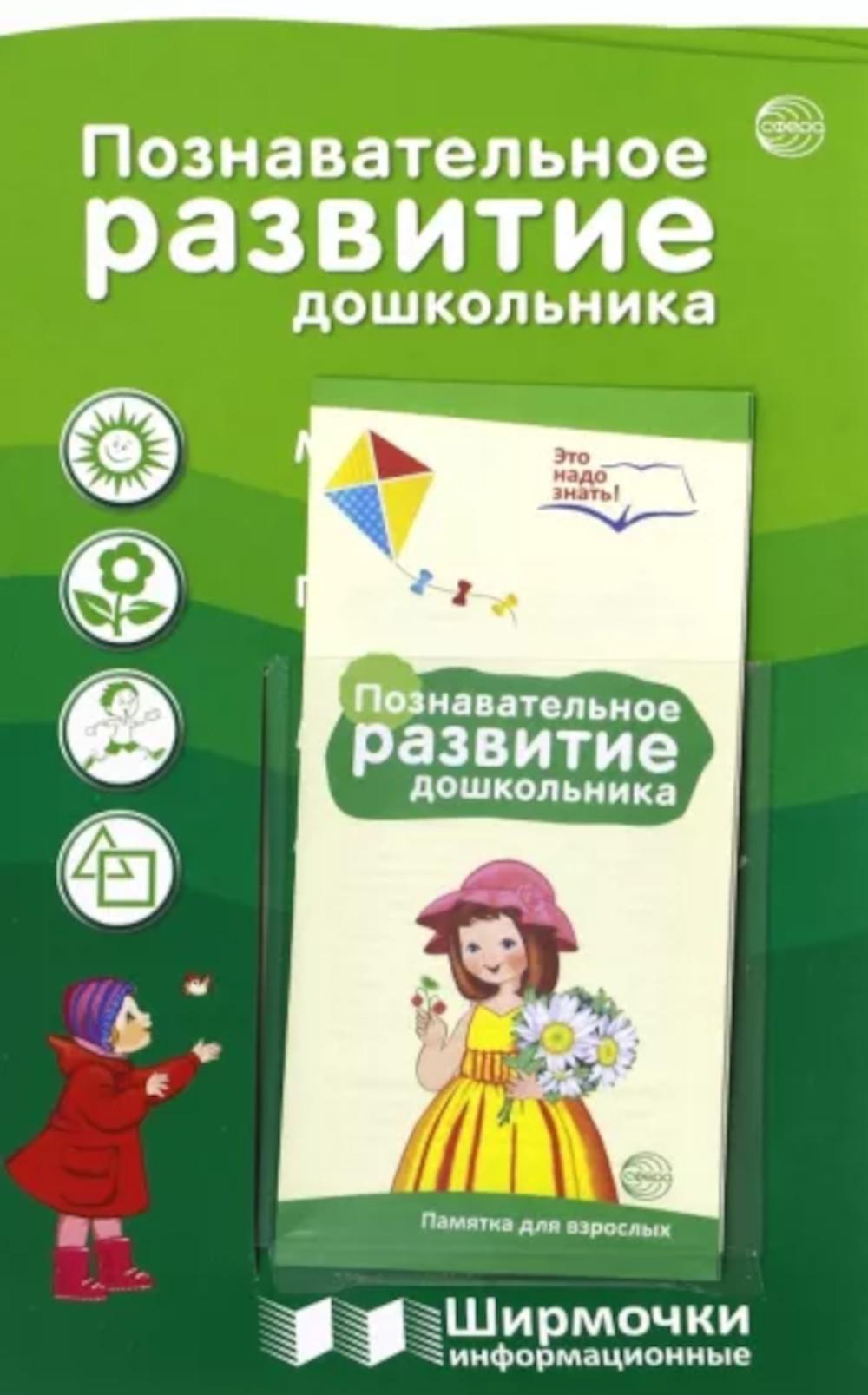 В ширмочке «Познавательное развитие дошкольника» в доступной форме рассказывается о мире вокруг нас: Солнце, Земле и Луне, живой и неживой природе, мире растений и животных, свойствах предметов, ориентировании в пространстве. В буклете для родителей даются задачи познавательного развития и содержание познавательной деятельности, советы по ознакомлению ребенка с миром природы и основами математических знаний, описывается восприятие маленькими детьми свойств предметов, пространства и времени.| Издательство | Творческий центр Сфера |