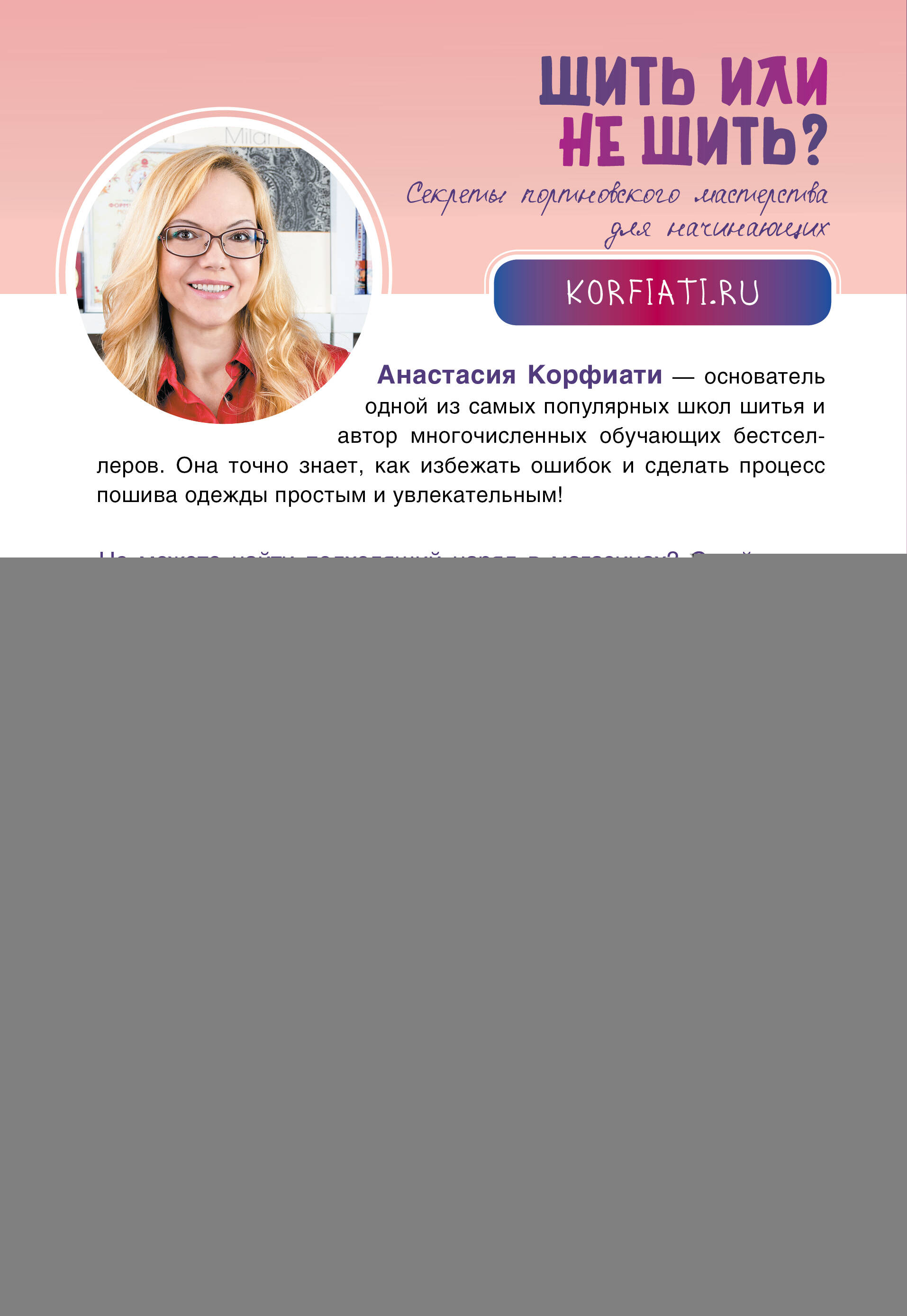 Анастасия Корфиати - основатель одной из самых популярных школ шитья и автор многочисленных обучающих бестселлеров. Она точно знает, как избежать ошибок и сделать процесс пошива одежды простым и увлекательным! Не можете найти подходящий наряд в магазинах? Сшейте его сами! Создание одежды - творческий и невероятно захватывающий процесс, но как новичку не запутаться в обилии терминов, материалов и техник? В книге "Шить или не шить? Секреты портновского мастерства для начинающих" собраны ответы на самые важные вопросы: с пошива каких изделий лучше начинать, какие инструменты и материалы необходимы для работы, как снимать мерки с фигуры и создавать художественные эскизы. А представленные в книге мастер-классы с понятными инструкциями и пошаговыми иллюстрациями помогут вам начать путь, наполненный творчеством. Шить или не шить? Вот в чем вопрос! И ответ на него однозначный - конечно, шить!
