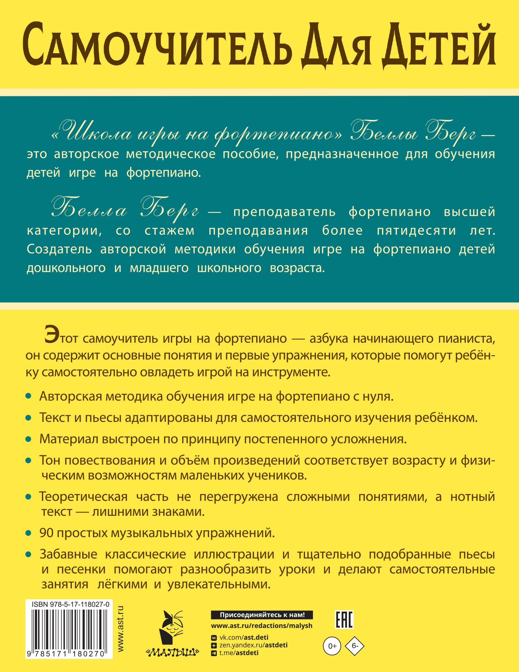 Белла Берг - преподаватель фортепиано высшей категории, со стажем преподования более пятидесяти лет. Создатель авторской методики обучения игры на фортепиано детей дошкольного и младшего школьного возраста. Самоучитель игры на фортепиано Беллы Берг - азбука начинающего пианиста, он содержит основные понятия и первые упражнения, которые помогут ребёнку самостоятельно овладеть игрой на инструменте. Материал выстроен по принципу постепенного усложнения. Тон повествования и объём предлагаемых произведений соответствует возрасту и физическим возможностям маленьких учеников. Теоретическая часть не перегружена сложными понятиями, а нотный текст - лишними знаками. Забавные классические иллюстрации и тщательно подобранные пьесы и песенки помогают разнообразить уроки и делают самостоятельные занятия лёгкими и увлекательными. Плюсы издания - Авторская методика обучения игре на фортепиано с нуля. - Текст и пьесы адаптированы для самостоятельного изучения ребёнком. - 90 простых музыкальных упражнений. - Классические иллюстрации, не отвлекающие от нотного материала. - Доступная стоимость.| Издательство | ИЗДАТЕЛЬСТВО "АСТ" |