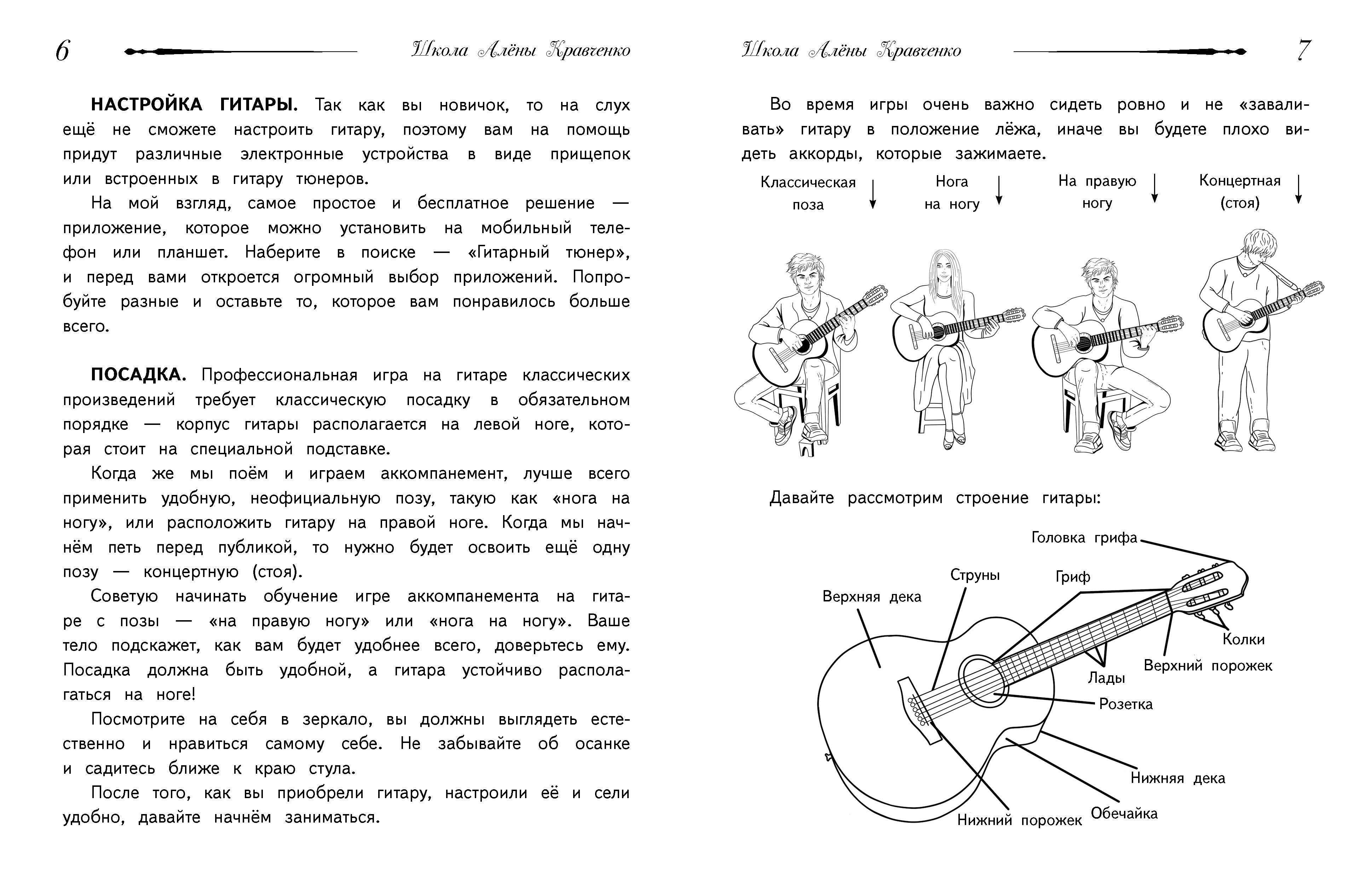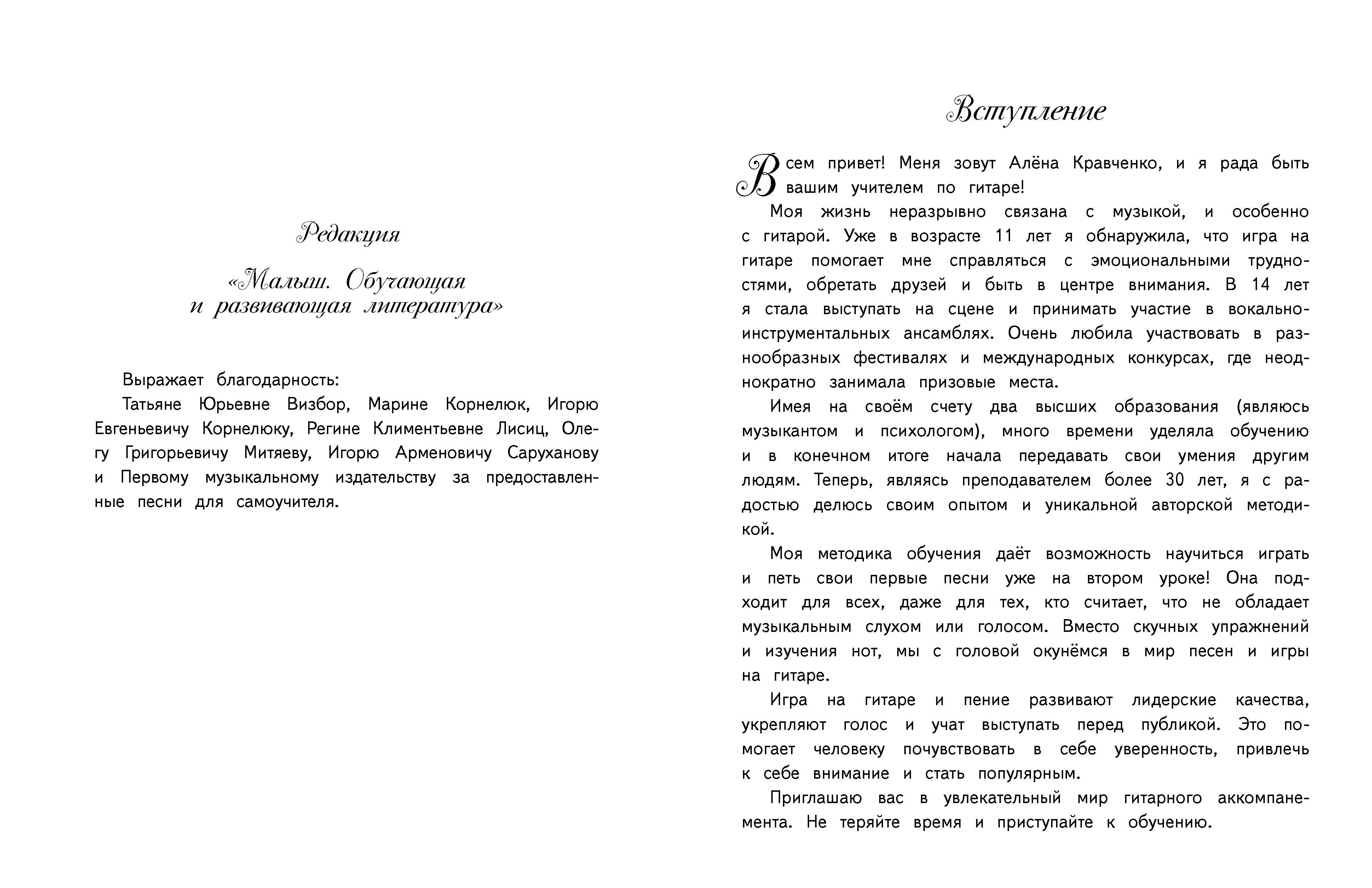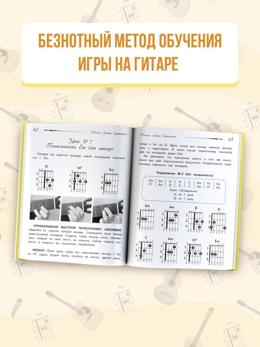 Этот самоучитель даёт возможность научиться играть и петь свои первые песни уже на втором уроке! Он подходит для всех, даже для тех, кто считает, что не обладает музыкальным слухом или голосом. Вместо выполнения скучных упражнений ребёнок сразу попадёт в мир песен и игры на гитаре. В этой книге: Безнотный метод обучения игры на гитаре. Учимся по картинкам! 21 интересный урок с песнями Ю.Визбора, О.Митяева, И. Корнелюка, И. Саруханова и других. Материал выстроен по принципу постепенного усложнения. Автор - Алёна Кравченко - преподаватель со стажем более тридцати лет, создатель авторской методики, благодаря которой сотни учеников по всей стране уже овладели мастерством игры на гитаре.| Издательство | ИЗДАТЕЛЬСТВО "АСТ" |