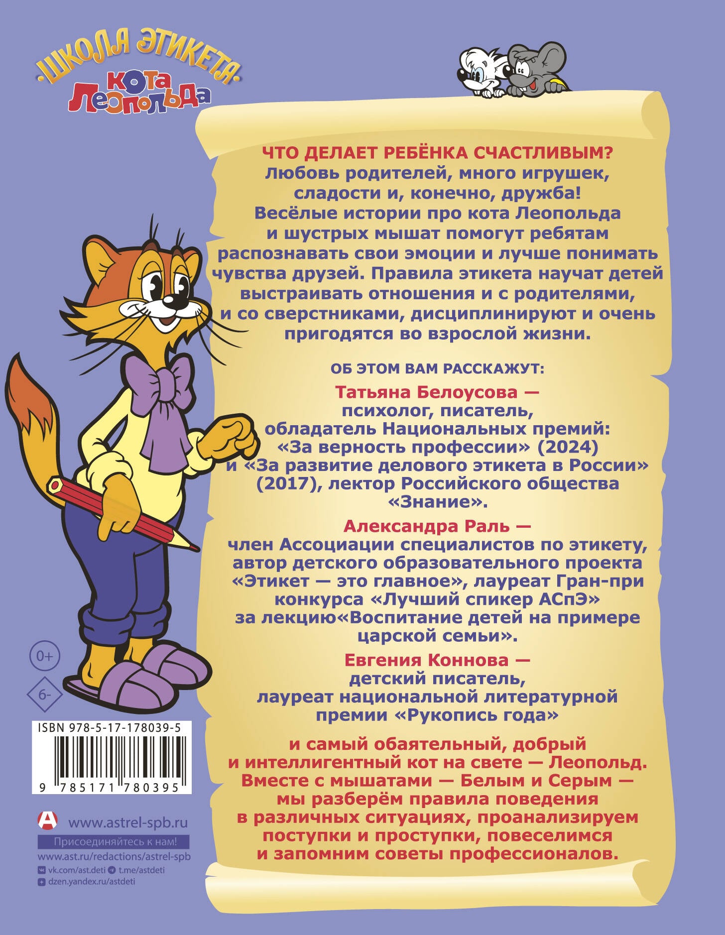 Что делает ребёнка счастливым? Любовь родителей, много игрушек, сладости и, конечно, дружба! Весёлые истории про кота Леопольда и шустрых мышат помогут ребятам распознавать свои эмоции и лучше понимать чувства друзей. Правила этикета научат детей выстраивать отношения и с родителями, и со сверстниками, дисциплинируют и очень пригодятся во взрослой жизни. Об этом вам расскажут: Татьяна Белоусова - психолог, писатель, обладатель Национальных премий: "За верность профессии" (2024) и "За развитие делового этикета в России" (2017), лектор Российского общества "Знание", член Национальной ассоциации специалистов по протоколу. Александра Раль - член Ассоциации специалистов по этикету, автор детского образовательного проекта "Этикет - это главное", лауреат Гран-при конкурса "Лучший спикер АСпЭ" за лекцию "Воспитание детей на примере царской семьи". Евгения Коннова - детский писатель, лауреат национальной литературной премии "Рукопись года" и самый обаятельный, добрый и интеллигентный кот на свете - Леопольд. Вместе с мышатами - Белым и Серым - мы разберём правила поведения в различных ситуациях, проанализируем поступки и проступки, повеселимся и запомним советы профессионалов.| Издательство | Издательство "АСТ" |