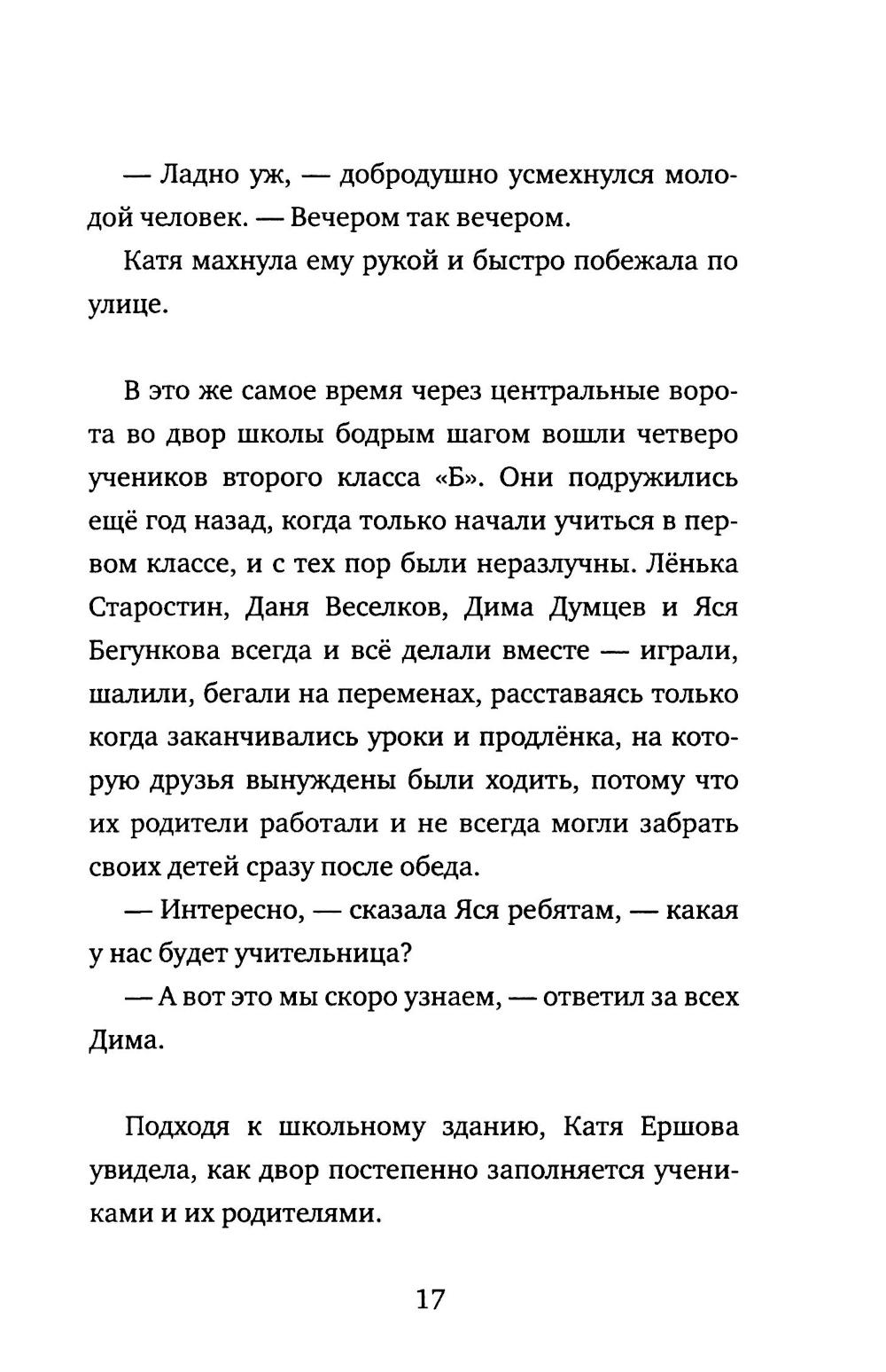 В новой книге Екатерины Тимашпольской речь пойдёт о... Нет-нет, не подумайте, что в обычной школе существуют дикари и принцессы, хотя... Катя Ершова, юная учительница начальных классов, тоже не предполагала, что её ждёт столько приключений. Вместе с детьми Катя искала старинный клад, танцевала на балу, читала стихи в парке, участвовала в музыкальном конкурсе, искала крысу по кличке Игорь, пекла блины и даже побывала ведьмой. А помогали ей в этом неугомонные заводилы второго класса - четвёрка неразлучных друзей - и их одноклассники.| Издательство | Время |