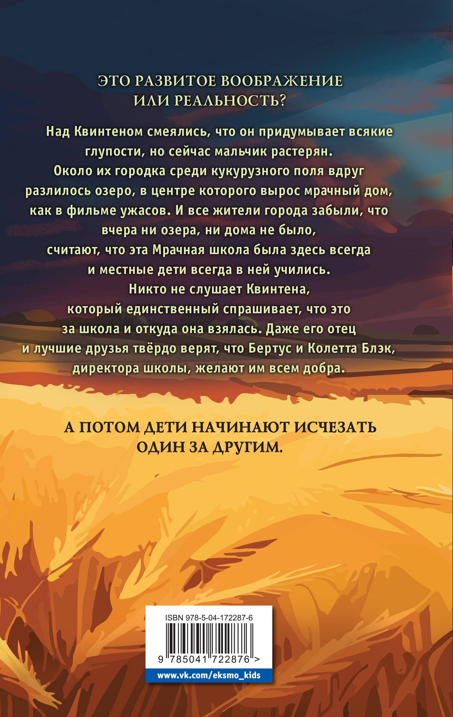 Квинтен напуган. Нет, даже очень напуган. Над ним всегда посмеивались, что он обладает слишком живым воображением, но сейчас Квинтен перестал понимать, где реальность, а где страшный сон. Посреди кукурузного поля возникла Мрачная школа, и вдруг оказалось, что теперь все дети учатся в ней. Только каждый день, проведённый там, словно отбирает личность у одноклассников Квинтена. Они становятся незнакомцами со странными знаниями и новыми привычками. Квинтен считает, что единственный шанс спастись от подобной участи - разгадать секрет школы на кукурузном поле. Книги для тех, кто любит темное фэнтези и ужасы! Интересное: автор, Сандра Дж. Паул, неоднократно получала премии за свои триллеры на голландском языке. Это ее новая серия, сюда входят книги для детей от 10 лет.| Издательство | ООО "Издательство "Эксмо" |