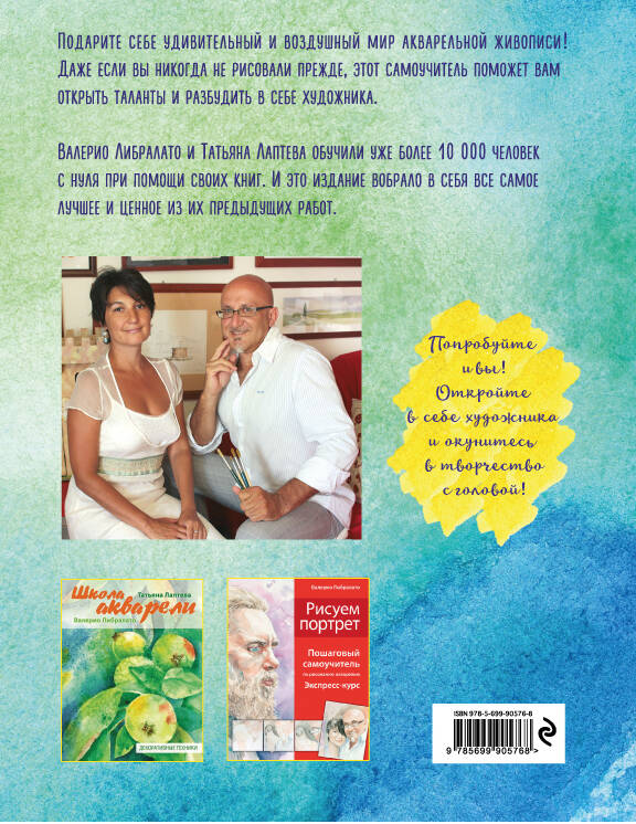 Перед вами современный самоучитель по рисованию акварелью авторства знаменитого итальянского художника Валерио Либралато и известного художника-дизайнера Татьяны Лаптевой. Эта книга является компиляцией предыдущих работ и содержит в себе самую важную информацию для начинающего художника. Рисуйте цветы, портреты, пейзажи, создавайте декоративные картины и открывайте для себя мир искусства и творчества!| Издательство | ООО "Издательство "Эксмо" |