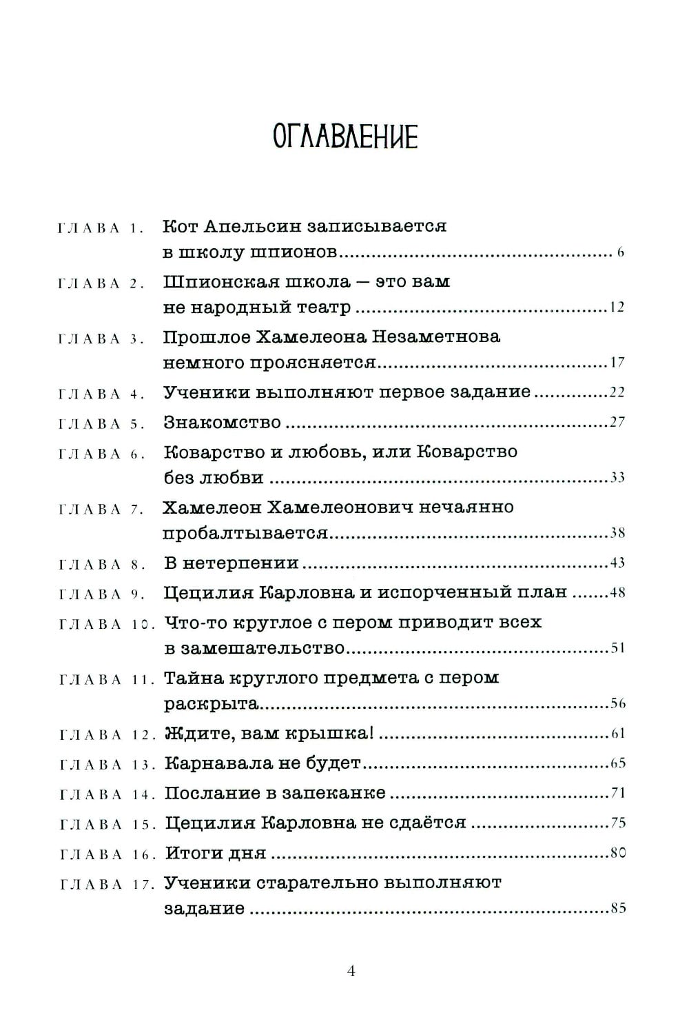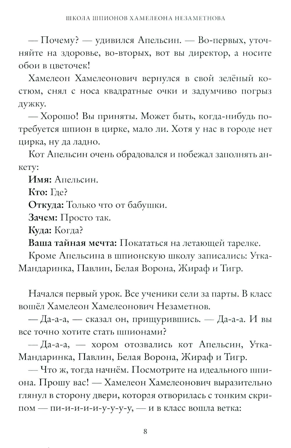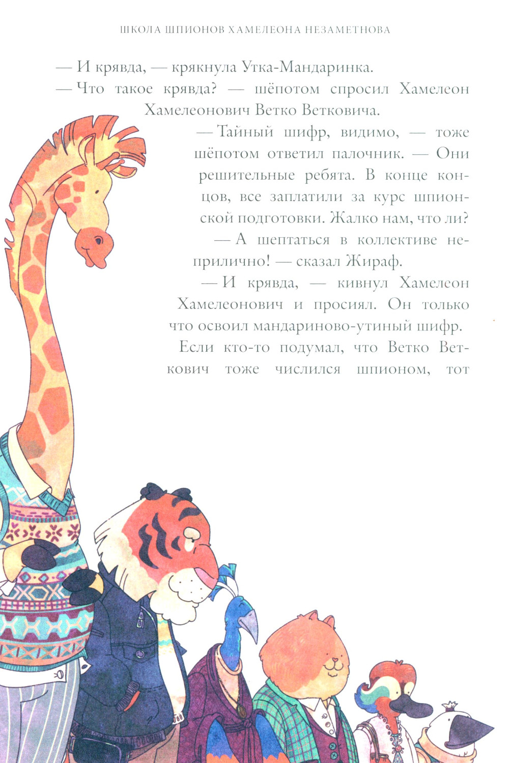 Когда в твоём городе открывает набор учеников школа шпионов, разве можно заниматься чем-то другим? Так подумали одновременно кот Апельсин, Утка-Мандаринка, Белая Ворона, Павлин, Жираф и Тигр. Их педагогу Хамелеону Хамелеоновичу Незаметнову предстоит сделать из этих ярких личностей умельцев прятаться у всех на виду, вести себя тихо, уметь слушать и слышать. Как назло, в учебный процесс вмешивается таинственное дело, которое срочно нужно расследовать: кто-то хочет сорвать карнавал! Главный праздник в городе! Вот и работа для новобранцев школы шпионов! Весёлая приключенческая книга детской писательницы Юлии Симбирской - о том, что талант прорастёт на любой почве, и о том, что даже в самом серьёзном деле иногда нужно от души посмеяться! Иллюстрации Марии Некрут.| Издательство | Абрикобукс |