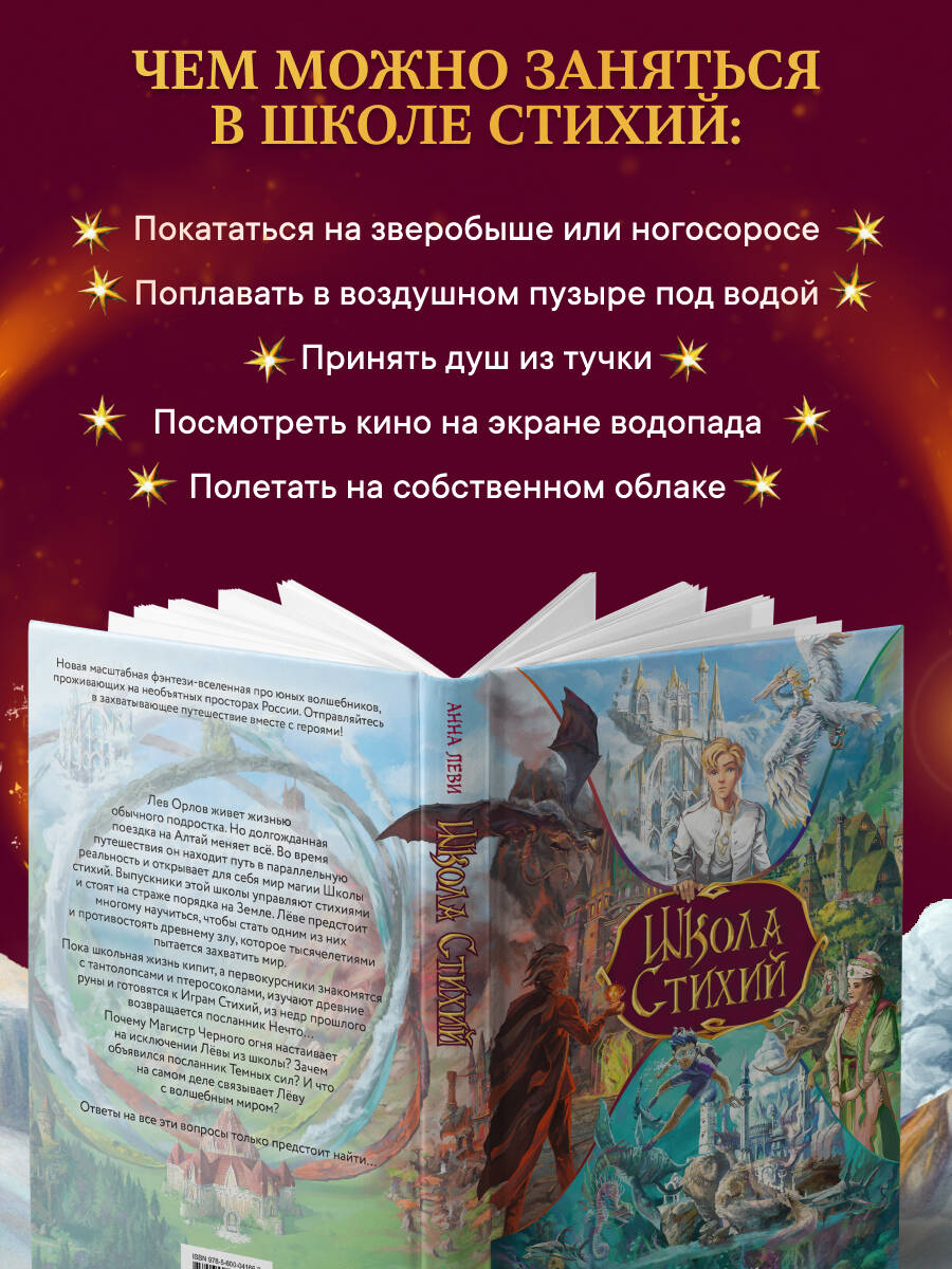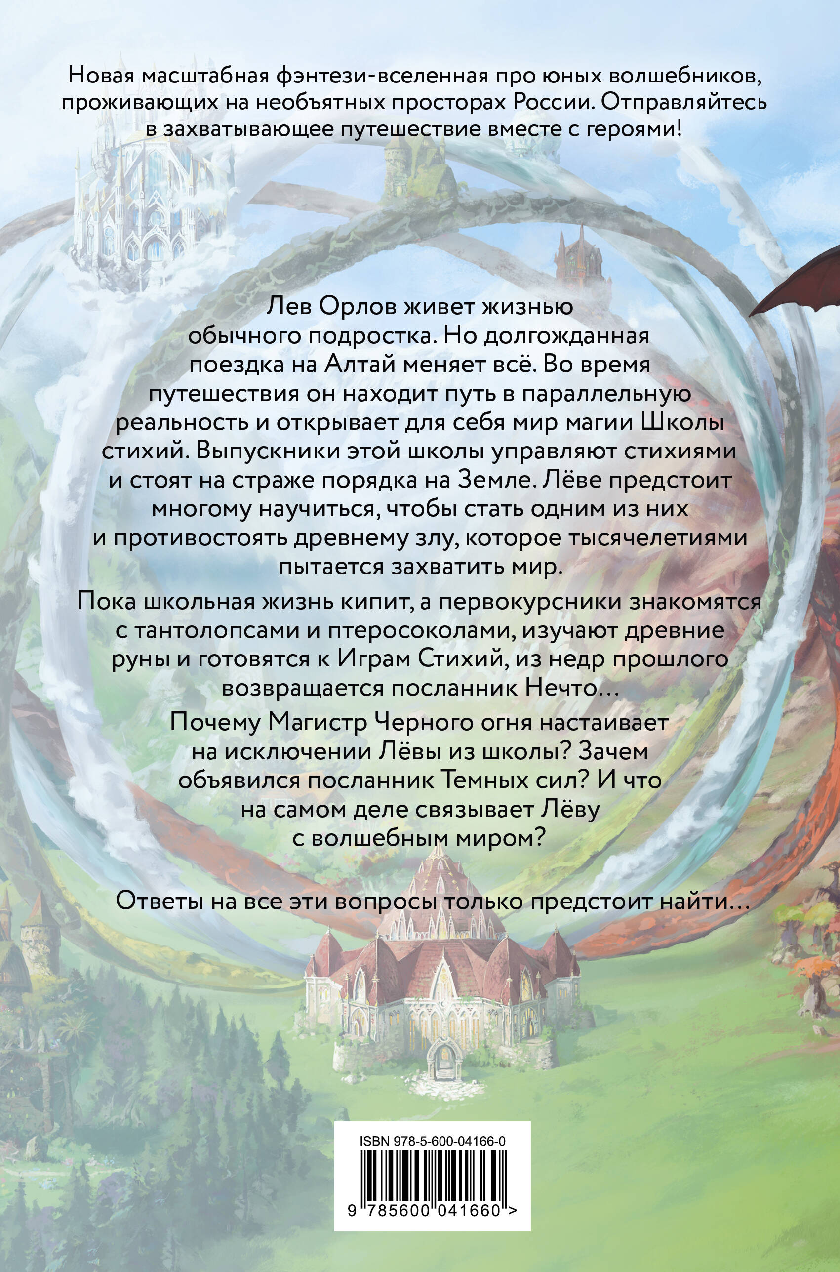 Новая масштабная фэнтези-вселенная про юных волшебников, проживающих на необъятных просторах России. Книга про магию и приключения с важными жизненными ценностями. Уникальные иллюстрации позволят читателю быстро погрузиться в новую волшебную реальность. Лев Орлов живет жизнью обычного подростка. Но долгожданная поездка на Алтай меняет всё. Там он находит путь в параллельную реальность, открывает для себя мир магии и поступает в Школу стихий. Выпускники этой школы управляют природными элементами и стоят на страже порядка на Земле. Лёве следует многому научиться, чтобы стать одним из них и противостоять древнему злу, которое тысячелетиями пытается захватить мир. Пока школьная жизнь кипит, а первокурсники знакомятся с тантолопсами и птеросоколами, изучают древние руны и готовятся к Играм Стихий, из недр прошлого возвращается посланник Нечто… Почему Магистр Черного огня настаивает на исключении Лёвы из школы? Зачем объявился посланник Темных сил? И что на самом деле связывает Лёву с волшебным миром? Ответы на все эти вопросы только предстоит найти…| Издательство | ООО "Издательство "Эксмо" |