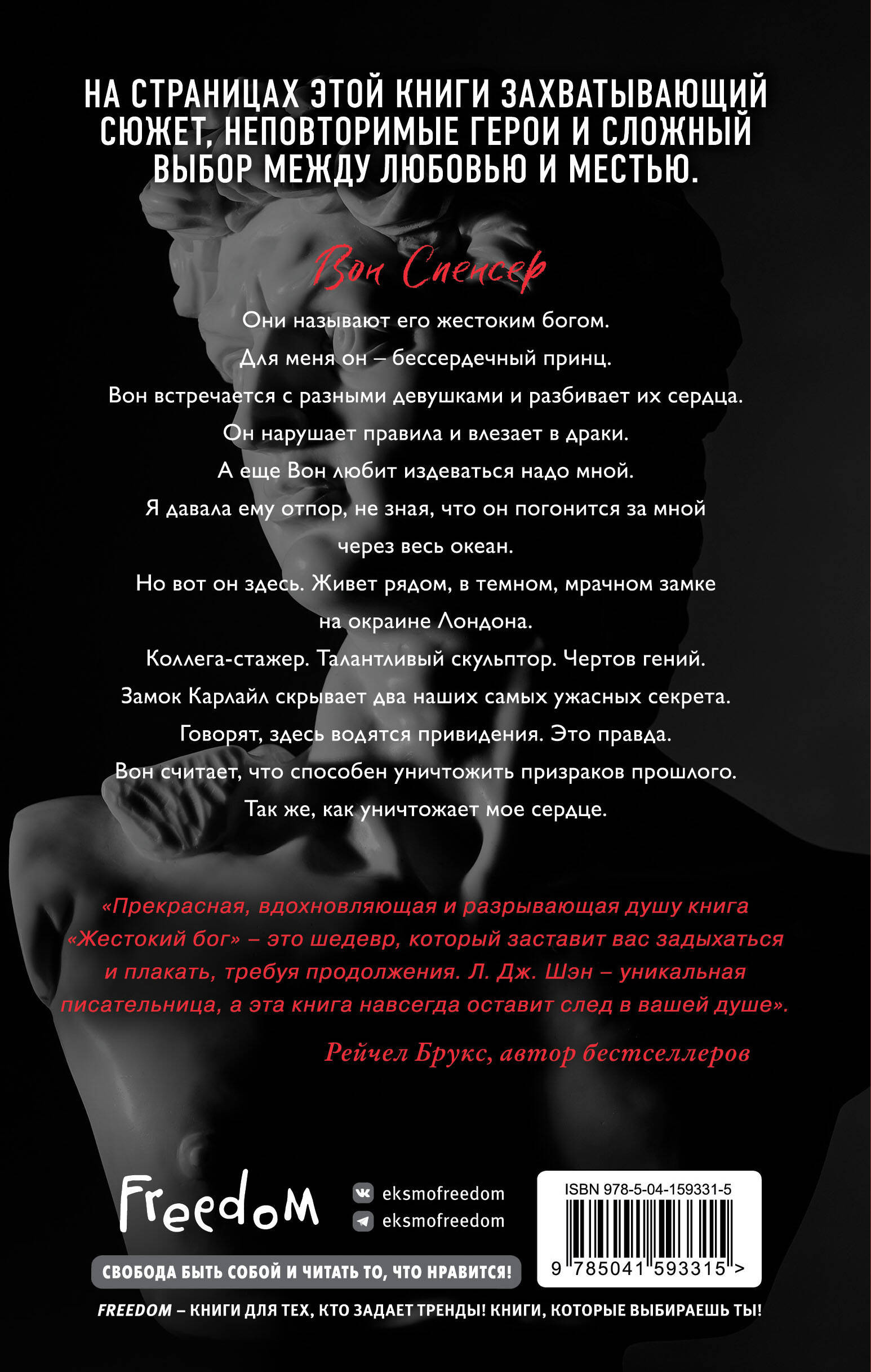 Вон Спенсер. Они называют его жестоким богом. Для меня он - бессердечный принц. Вон встречается с разными девушками и разбивает их сердца. Он нарушает правила и влезает в драки. А еще Вон любит издеваться надо мной. Я давала ему отпор, не зная, что он погонится за мной через весь океан. Но вот он здесь. Живет рядом, в темном, мрачном замке на окраине Лондона. Коллега-стажер. Талантливый скульптор. Чертов гений. Замок Карлайл скрывает два наших самых ужасных секрета. Говорят, здесь водятся привидения. Это правда. Вон считает, что способен уничтожить призраков прошлого. Так же, как уничтожает мое сердце. «Прекрасная, вдохновляющая и разрывающая душу книга "Жестокий бог" - это шедевр, который заставит вас задыхаться и плакать, требуя продолжения. Л. Дж. Шэн - уникальная писательница, а эта книга навсегда оставит след в вашей душе». - Рейчел Брукс, автор бестселлеров Пробирающий до мурашек, страстный и драматичный роман от автора бестселлеров USA Today, Amazon и Washington Post Л. Дж. Шэн! № 1 бестселлер в Kindle Store Amazon. Вон - бессердечный принц, который разбивает сердца и устраивает драки. Ленора - прилежная ученица, мечтающая о стажировке в художественной школе. Они повстречали друг друга еще детьми, и их связывает темное прошлое. Сейчас Вон и Ленора живут в мрачном замке Лондона, и кто знает, какие тайны у них есть теперь? Книга о первой любви, юности и преодолении жизненных трудностей. «Бог. Ты. Мой. Эта книга не для слабонервных. Она пробирает до костей. Полна глубины и эмоций». - Лана, DG Romance, блогер