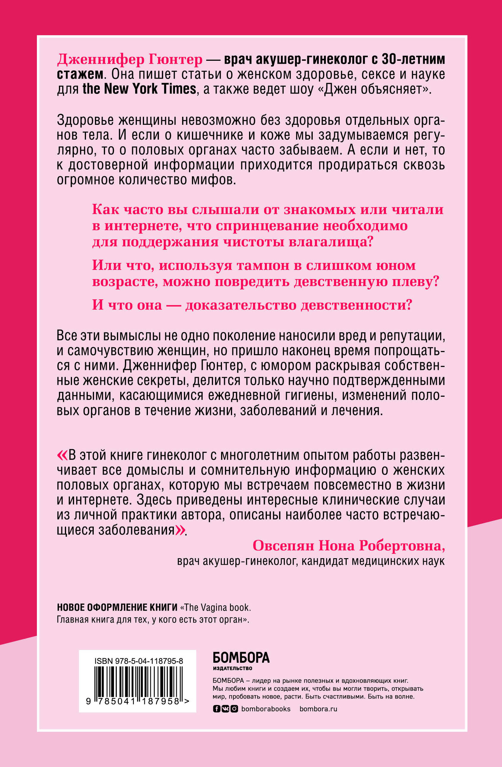 Эта книга мгновенно стала бестселлером New York Times, USA Today и Publishers Weekly! В ней акушер-гинеколог Джен Гюнтер, эксперт по женскому здоровью и самый популярный интернет-врач в США, приходит на помощь, развенчивая мифы о женском теле, обучая женщин заботиться о своем интимном здоровье и прислушиваться к себе, а также придавая им уверенности в себе. Узнайте правду о: - влагалищном микробиоме; - клиторе во всем его великолепии и мифах о точке G; - интимной гигиене, смазках и гормонах; - влиянии питания на вагинальное здоровье; - стволовых клетках и влагалище; - косметологических процедурах для влагалища; - изменениях, которые следует ожидать во время беременности и после родов; - изменениях, происходящих во время менопаузы; - неправильно интерпретированных симптомах; - и многое другое. Эта настоящая энциклопедия женского здоровья, несомненно, станет для вас надежным источником информации, независимо от возраста, опыта и уже накопленных знаний. Отзыв специалиста: «В этой книге автор, гинеколог с многолетним опытом работы, развенчивает все домыслы и сомнительную информацию о женских половых органах, появляющихся в искаженном виде в Интернете. В простой и остроумной форме автор передает читателю достоверную информацию об анатомическом строении, основных функциях и важной роли влагалища для женского здоровья. В книге приведены интересные клинические случаи из личной практики автора (врача-гинеколога), описаны наиболее часто встречающиеся ИППП. Данная книга будет интересна не только молодым девушкам, но также дамам старше среднего возраста, поскольку подробно описаны вопросы менопаузы и принципы гормональной терапии. В качестве огромного бонуса для читательниц является то, что автор щедро делится ценными рекомендациями касательно диагностики и актуальных вопросов профилактики заболеваний женской половой системы». - Овсепян Нона Робертовна, врач акушер-гинеколог, кандидат медицинских наук Новое оформление книги «The VAGINA BOOK. Главная книга для тех, у кого есть этот орган».| Издательство | ООО "Издательство "Эксмо" |