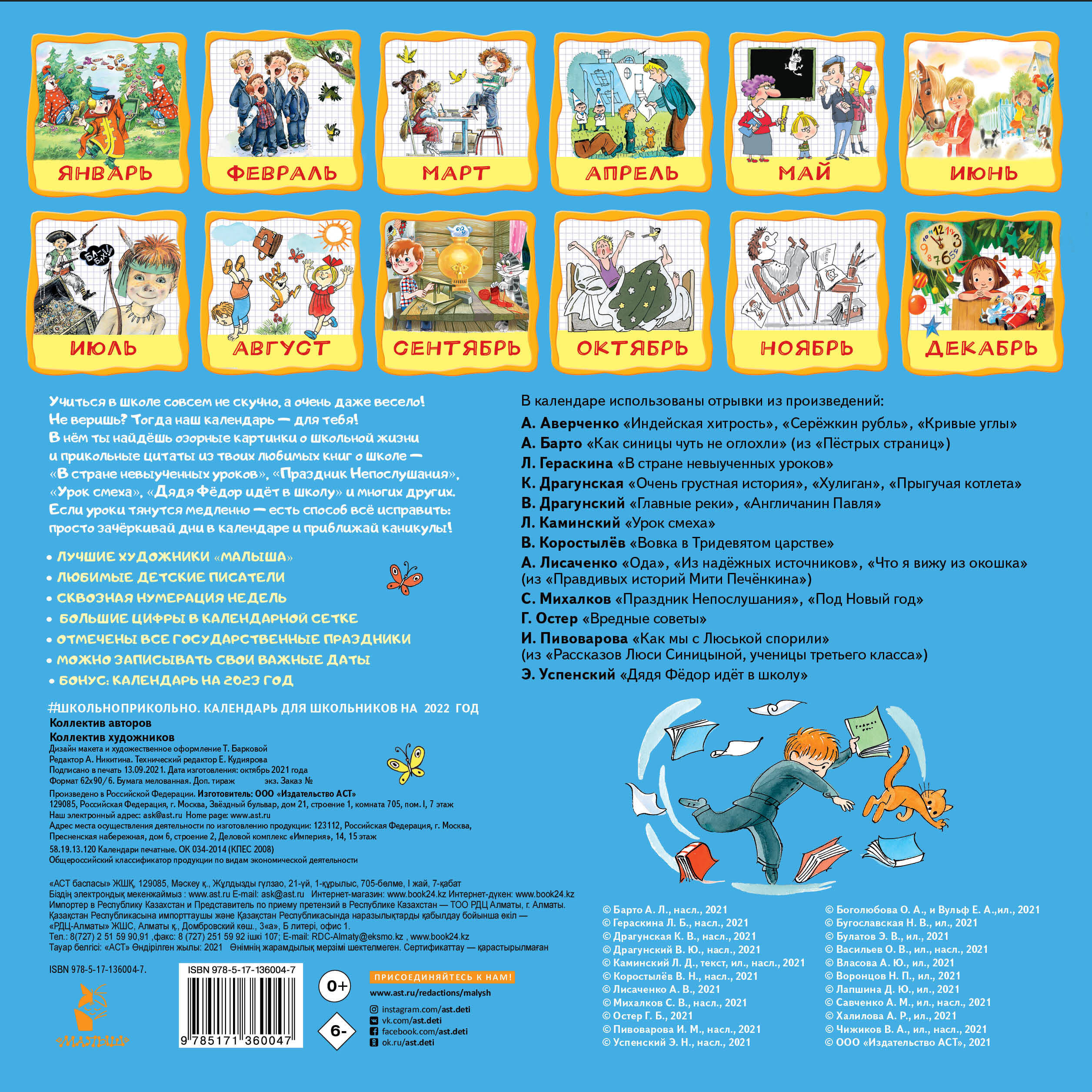 Учиться в школе совсем не скучно, а очень даже весело! Не веришь? Тогда наш календарь - для тебя! В нём ты найдёшь озорные картинки о школьной жизни и прикольные цитаты из твоих любимых книг о школе - "В стране невыученных уроков", "Праздник непослушания", "Урок смеха", "Дядя Фёдор идёт в школу" и многих других. Если уроки тянутся медленно - есть способ всё исправить: просто зачёркивай дни в календаре и приближай каникулы! * Сквозная нумерация недель * Большие цифры в календарной сетке * В календаре отмечены все государственные праздники * В клеточках календаря можно отмечать свои важные даты * Любимые детские писатели * Лучшие художники "Малыша" БОНУС: календарь на 2023 год| Издательство | АСТ |
