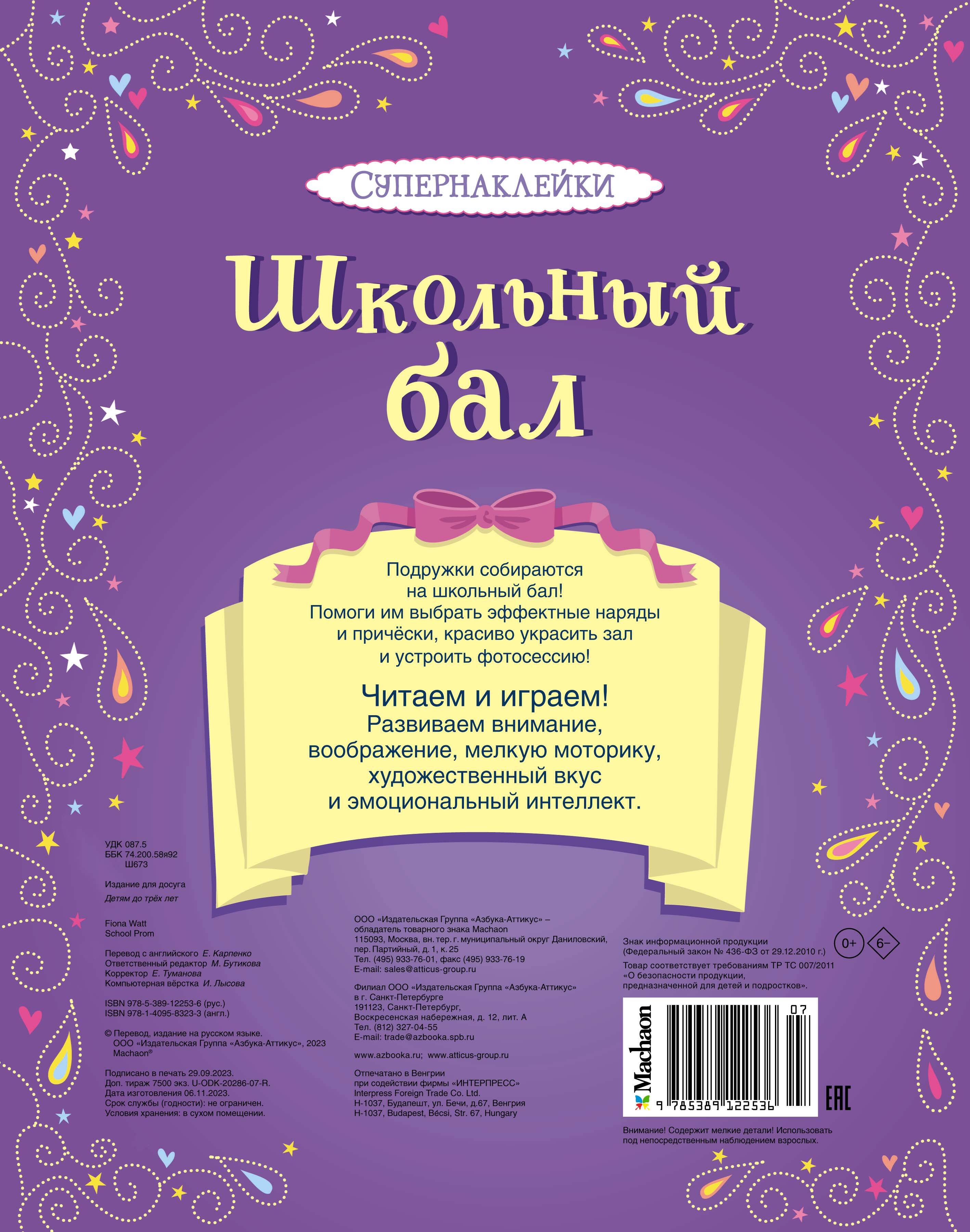 Подружки собираются на школьный бал! Помоги им выбрать эффектные наряды и причёски, красиво украсить зал и устроить фотосессию! Читаем и играем! Развиваем внимание, воображение, мелкую моторику и художественный вкус.| Издательство | Азбука-Аттикус Издат.группа ООО |