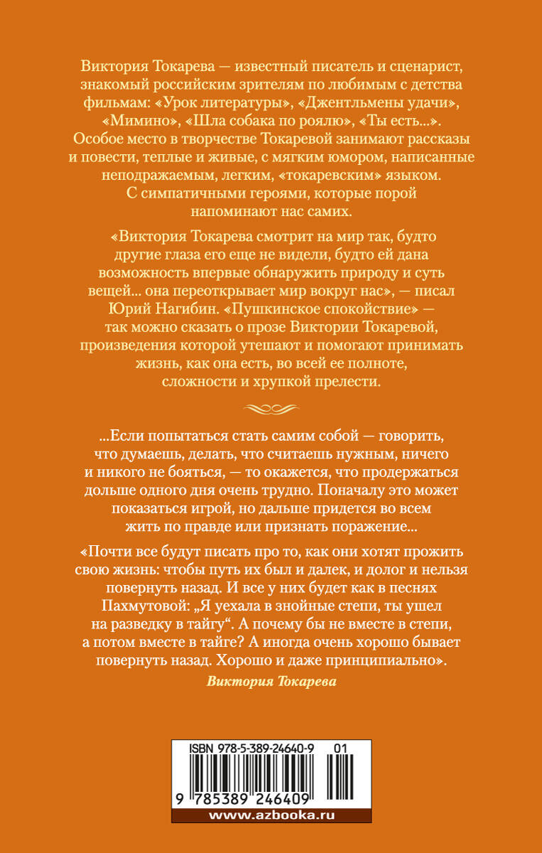 Виктория Токарева - известный писатель и сценарист, знакомый российским зрителям по любимым с детства фильмам: "Урок литературы", "Джентльмены удачи", "Мимино", "Шла собака по роялю", "Ты есть...". Особое место в творчестве Токаревой занимают рассказы и повести, теплые и живые, с мягким юмором, написанные неподражаемым, легким, "токаревским" языком. С симпатичными героями, которые порой напоминают нас самих. "Виктория Токарева смотрит на мир так, будто другие глаза его еще не видели, будто ей дана возможность впервые обнаружить природу и суть вещей... она переоткрывает мир вокруг нас", - писал Юрий Нагибин. "Пушкинское спокойствие" - так можно сказать о прозе Виктории Токаревой, произведения которой утешают и помогают принимать жизнь, как она есть, во всей ее полноте, сложности и хрупкой прелести. ...Если попытаться стать самим собой - говорить, что думаешь, делать, что считаешь нужным, ничего и никого не бояться, - то окажется, что продержаться дольше одного дня очень трудно. Поначалу это может показаться игрой, но дальше придется во всем жить по правде или признать поражение... В настоящее издание вошли рассказы и повести 1960-1980-х годов.