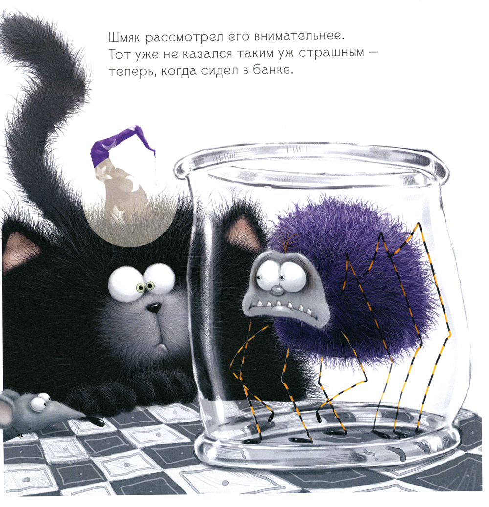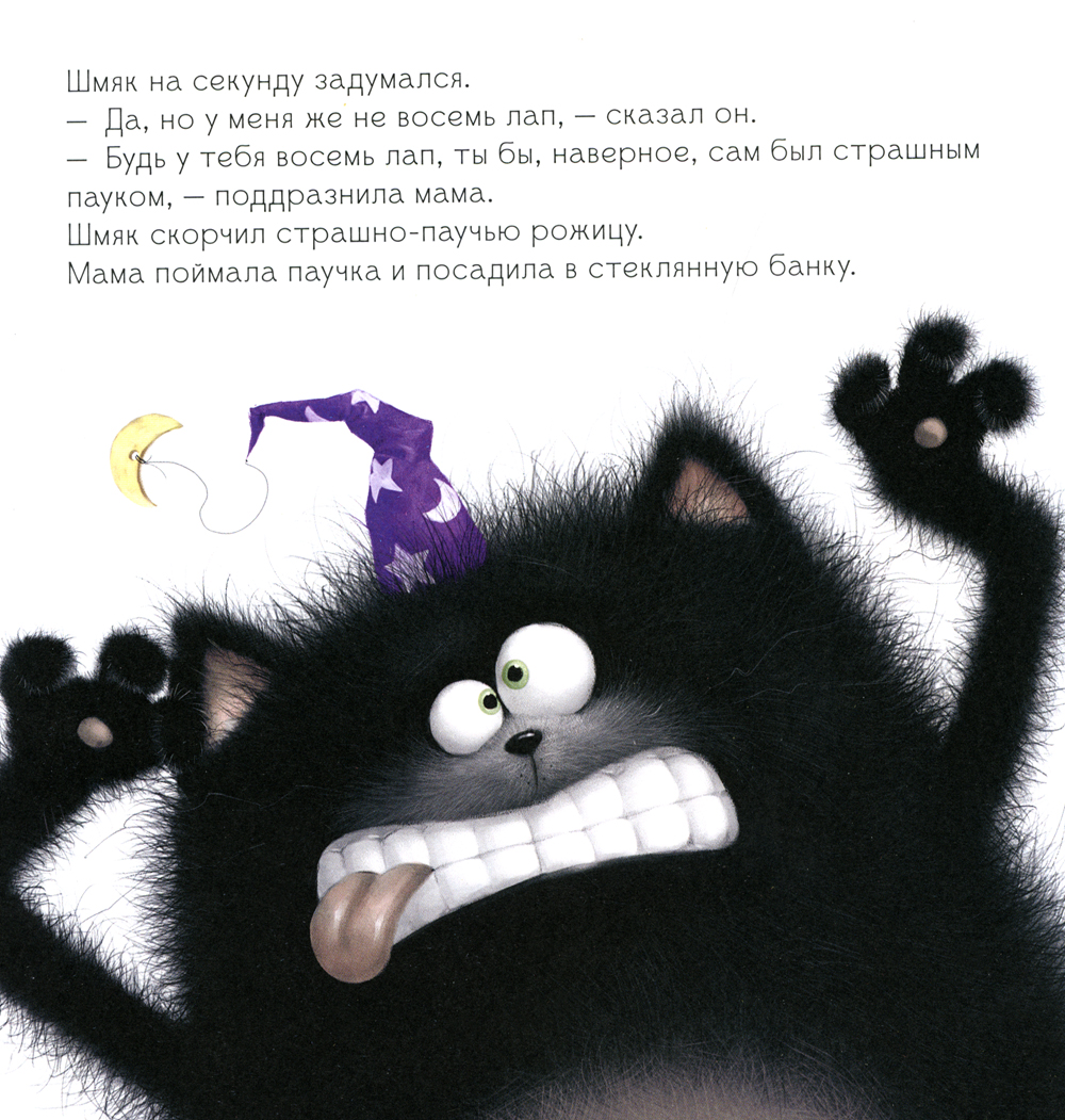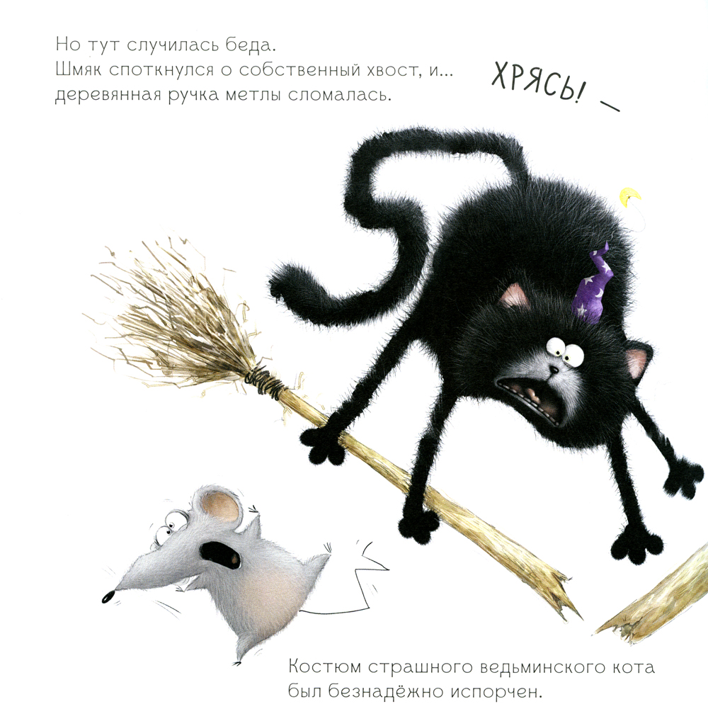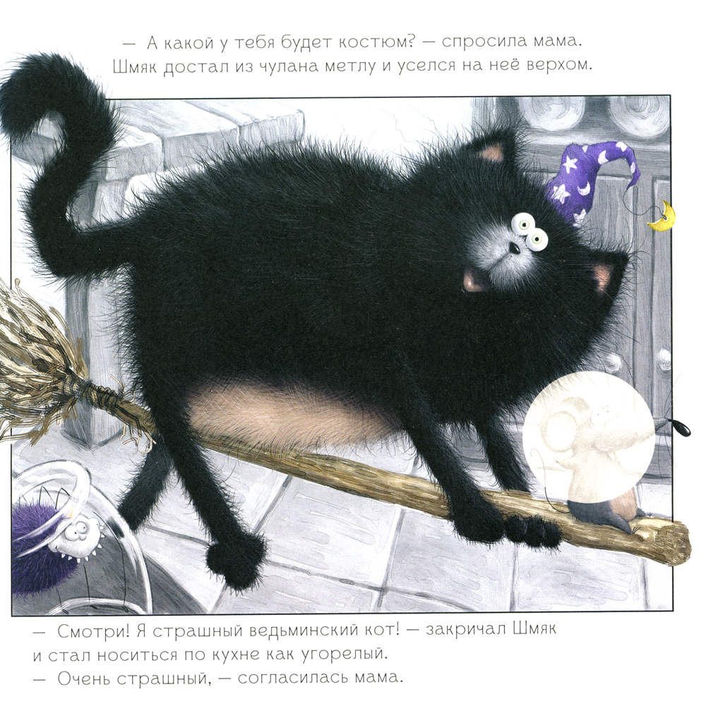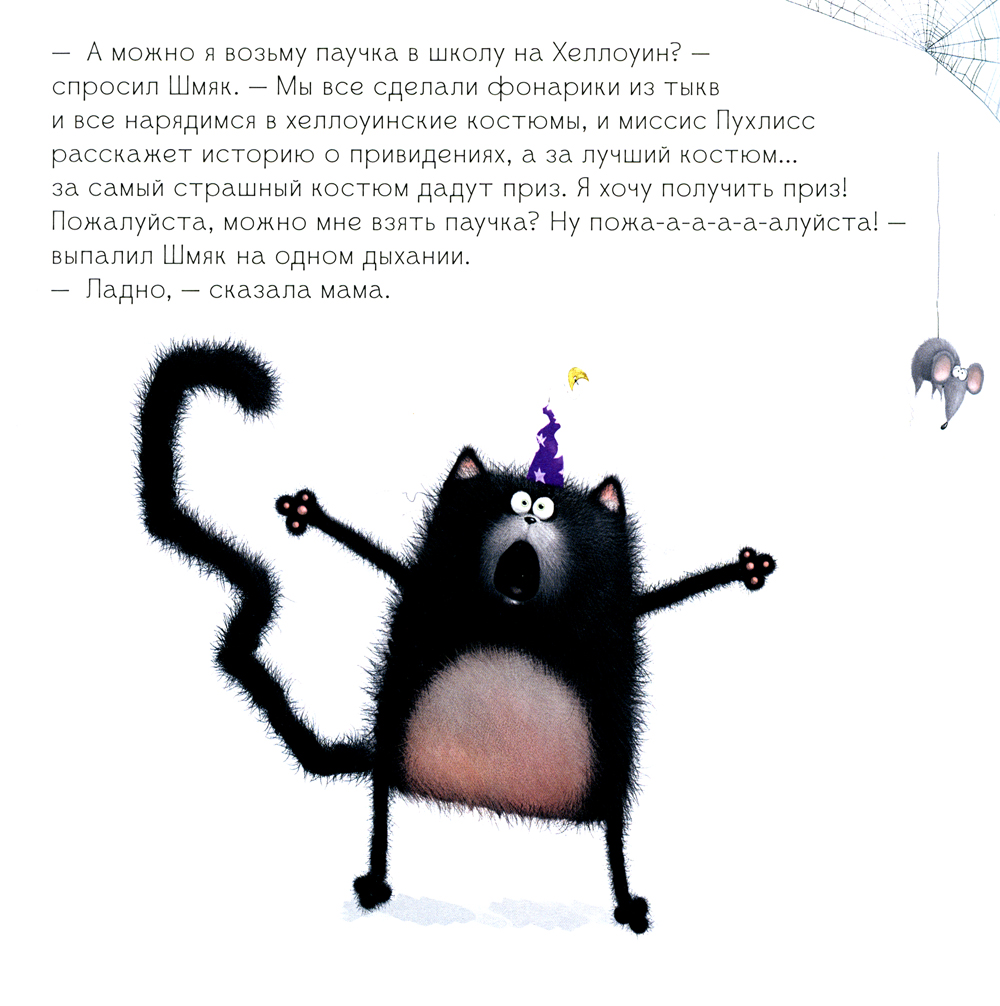 В классе Шмяка котята готовятся отмечать Хэллоуин. В программе страшные истории при свете фонариков из тыкв и приз за самый пугающий образ. Шмяк очень хочет победить в конкурсе, но не знает, как... Ведь сам он боится даже маленького паучка, метла сломалась, а его маскарадный костюм вызывает только смех. Внезапно во время рассказа ужасных историй начался настоящий переполох, и когда миссис Пухлисс включила свет…| Издательство | Клевер-Медиа-Групп |