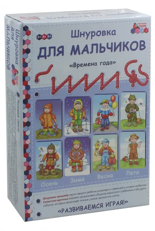 Игровое пособие Шнуровка для МАЛЬЧИКОВ «Времена года» состоит из четырёх двусторонних листов, на которых изображены мальчики на прогулке в разное время года. Одно изображение представляет собой отдельную сюжетную картинку для рассматривания и обсуждения с детьми. Листы имеют отверстия для шнурования. С помощью разноцветных шнурков ребёнок создаёт законченную картинку. Шнуровка выполняется прямыми, наклонными, крестовыми или зигзагообразными стежками. Дети в игровой форме приобретают навыки шнурования и завязывания шнурка на бантик. Шнуровка-тренажёр может быть использована для организации самостоятельной деятельности ребёнка, совместной деятельности с взрослым, а также для подгрупповой работы детей в детском саду. Игровое пособие Шнуровка для МАЛЬЧИКОВ «Времена года» способствует развитию детей по основным направлениям: социально-коммуникативному, познавательному, речевому, а именно: - развивает зрительно-двигательную координацию и мелкую моторику рук; внимание, память, мышление, восприятие, воображение; - формирует навыки шнуровки (шнурование и завязывание шнурка на бантик); - знакомит с временами года и видами одежды и обуви по сезонам; - закрепляет знания основных цветов и их оттенков; - способствует общению и развитию речи, подготовке руки к письму; - содействует формированию гендерной идентичности.